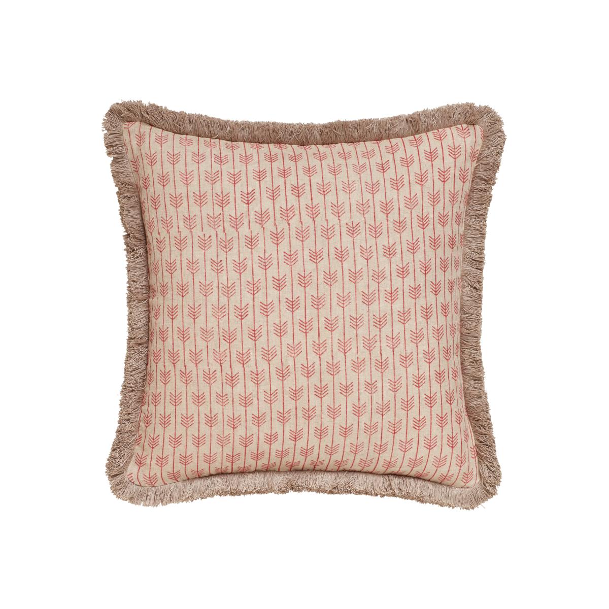 Featuring a lively red block-printed pattern, this natural linen pillow cover makes a fun addition to a sofa or chair. While the striped pattern draws attention, the cover's fringed edging lends it a playful finish.