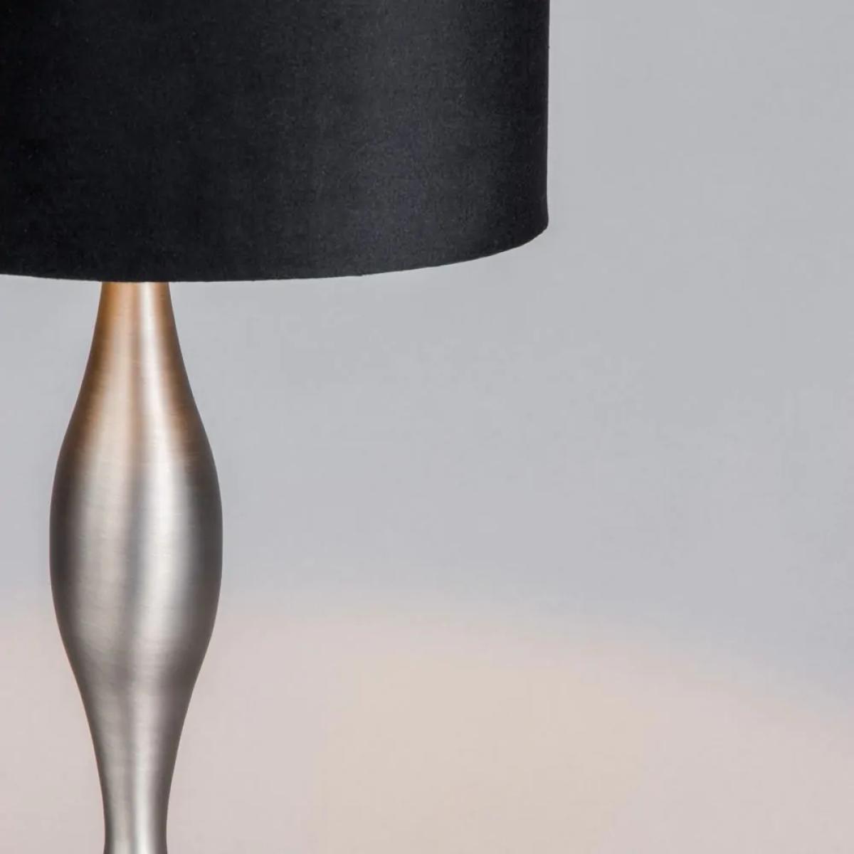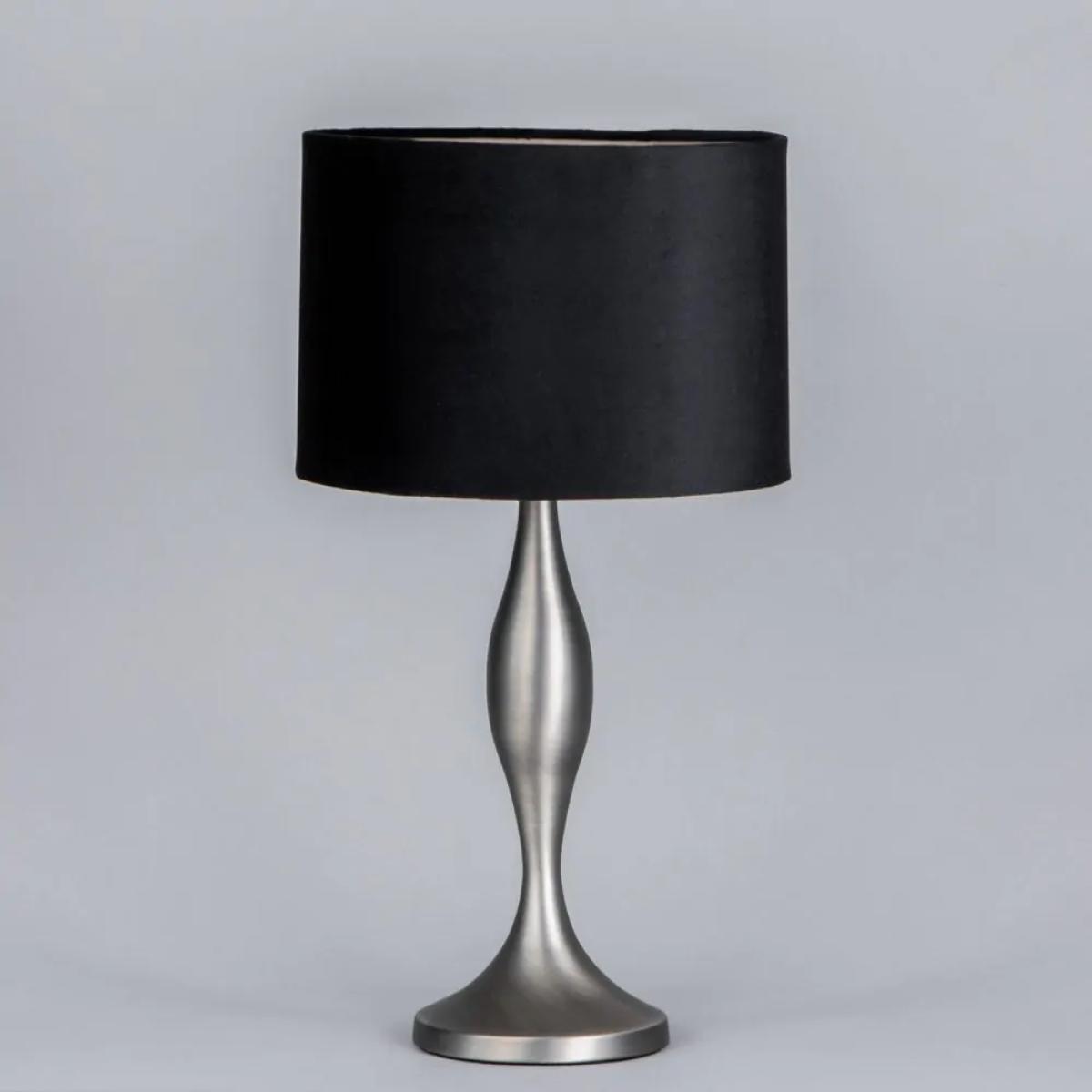 Bring a luxe touch to your bedside with the stunning Calais Spun Metal Lamp with Black Shade. The sleek, antique pewter finish adds a more modern tone to your decor. The velvet black shade has a glamorous edge as it beautifully shimmers in the warm light. The artistic, spun design has an abstract aesthetic ideal for creating a statement in your room.