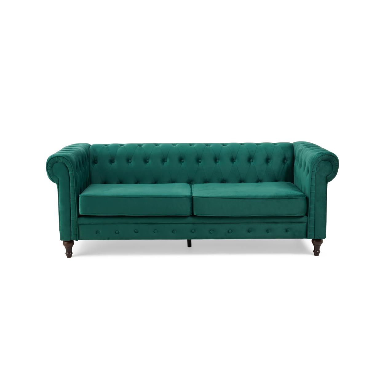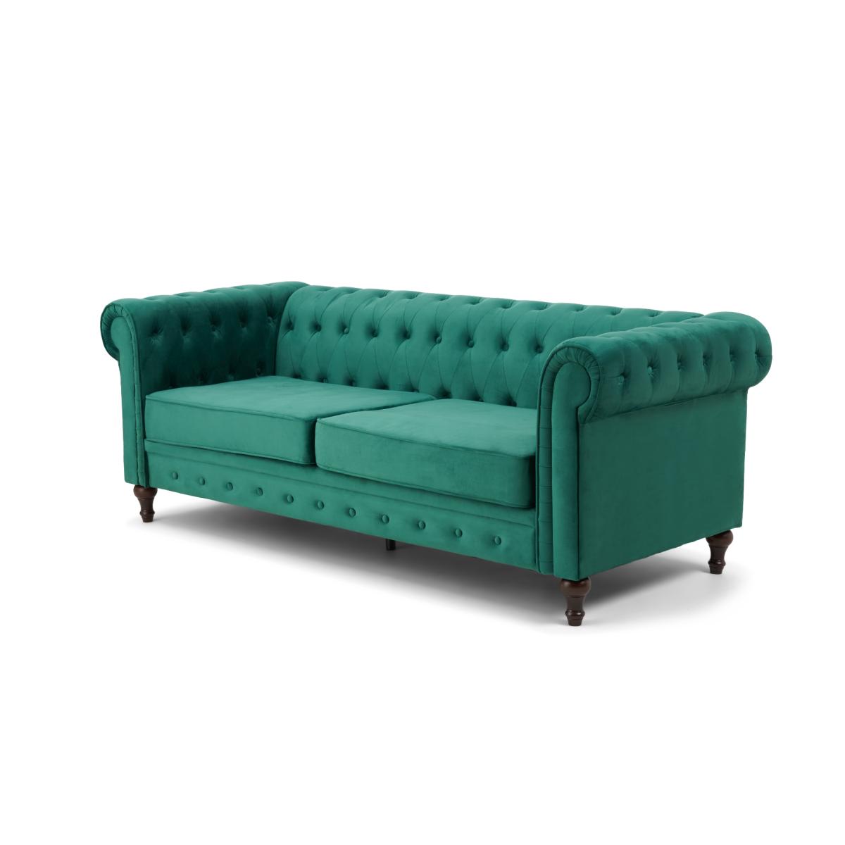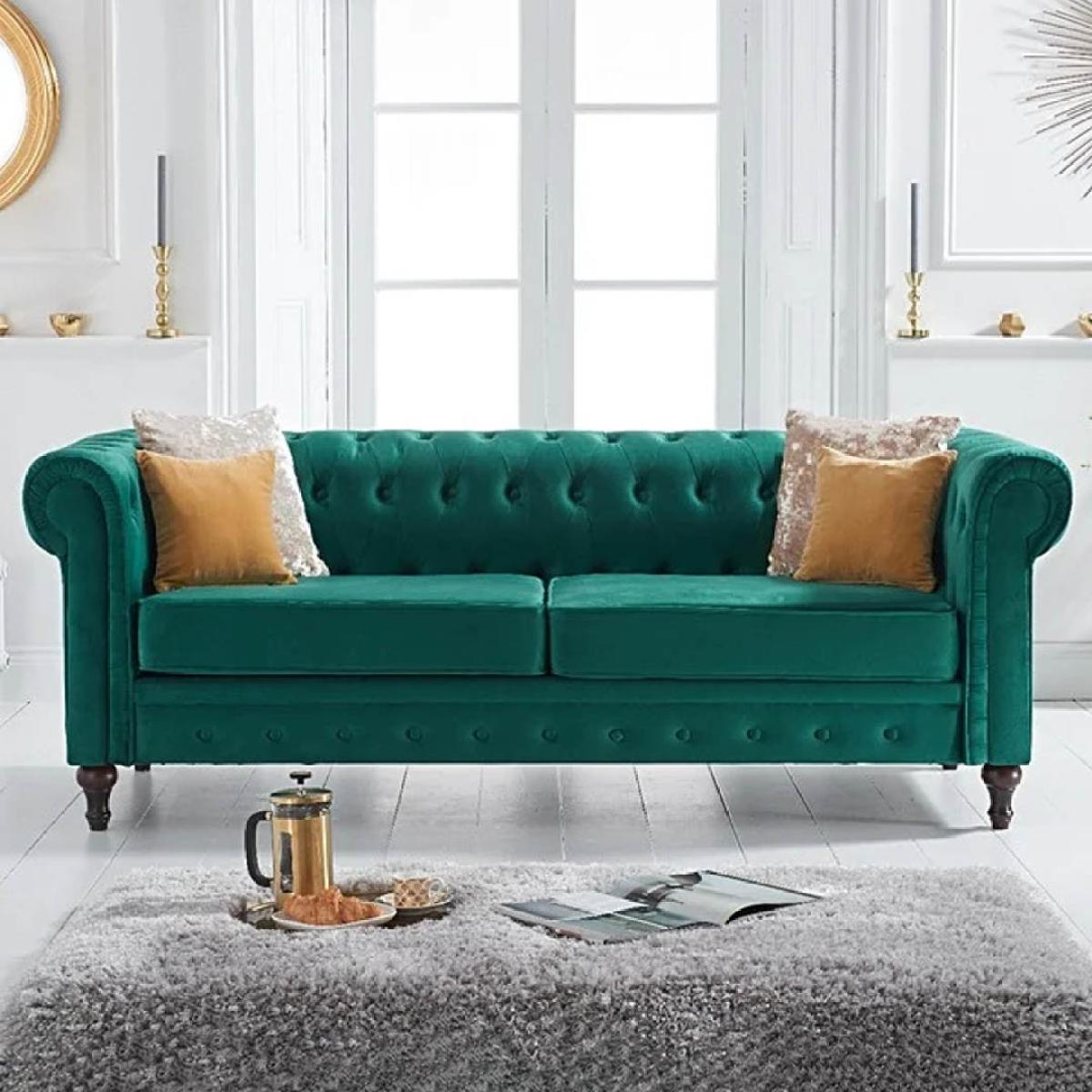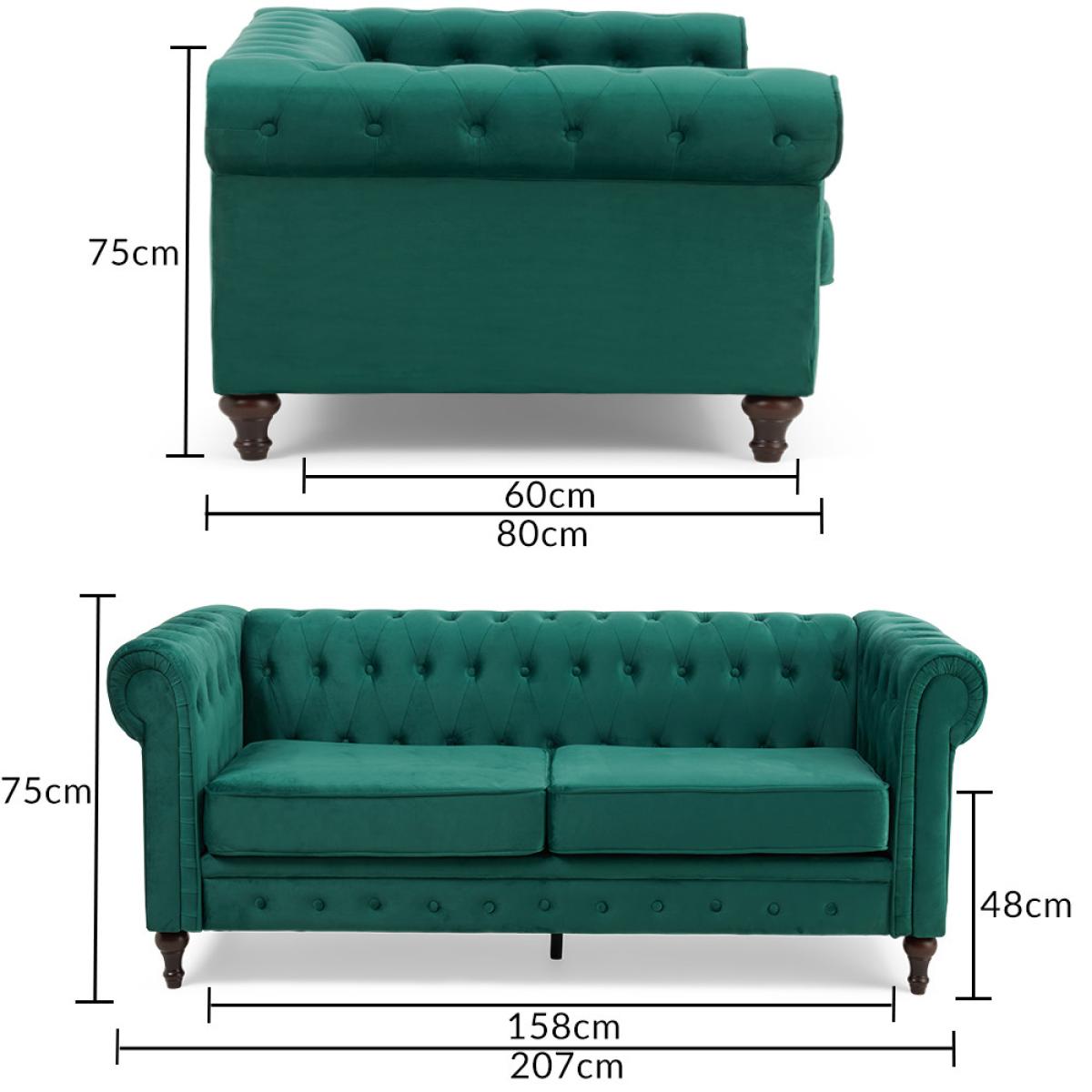 The Calama Green Velvet 3 Seater Sofa is a striking, comfortable choice for larger living spaces. With rich green velvet, the 3 seater sofa features elegant rolled arms and buttoning, with comfortable seat cushions and dark wood feet. Stunning green velvet sofa. Designed to seat 3 people Luxury green velvet makes a statement. Rolled arms and buttoned design for an elegant look. Comfortable seat cushions. Complete with ornate dark wood feet