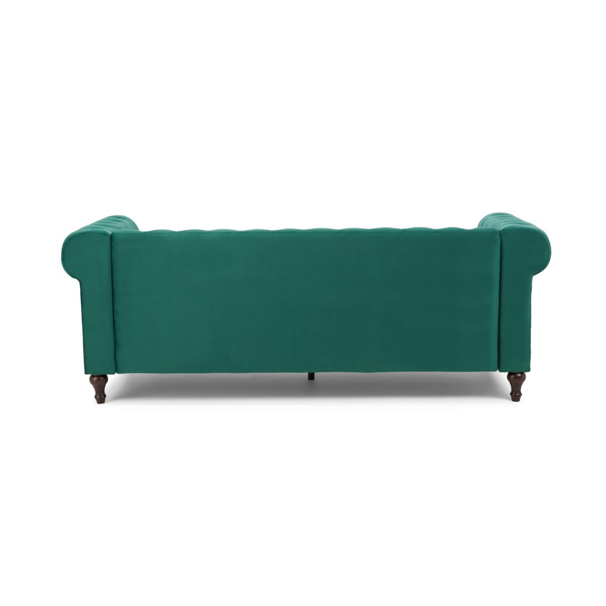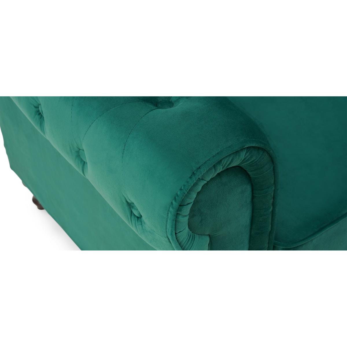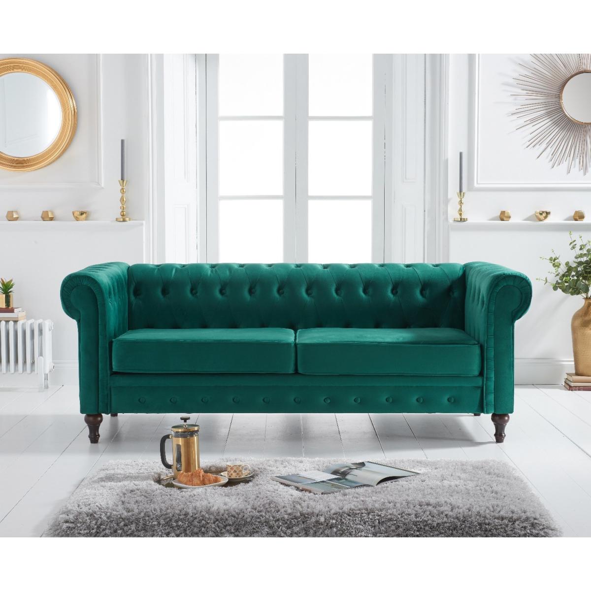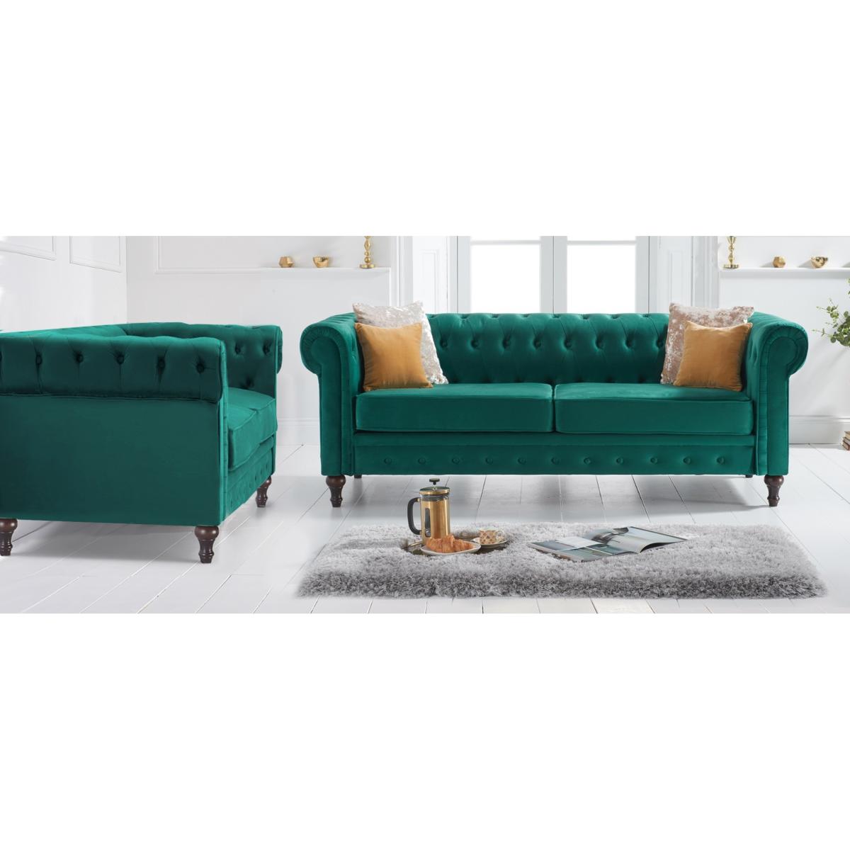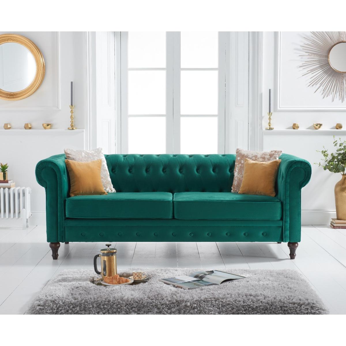 The Calama Green Velvet 3 Seater Sofa is a striking, comfortable choice for larger living spaces. With rich green velvet, the 3 seater sofa features elegant rolled arms and buttoning, with comfortable seat cushions and dark wood feet. Stunning green velvet sofa. Designed to seat 3 people Luxury green velvet makes a statement. Rolled arms and buttoned design for an elegant look. Comfortable seat cushions. Complete with ornate dark wood feet