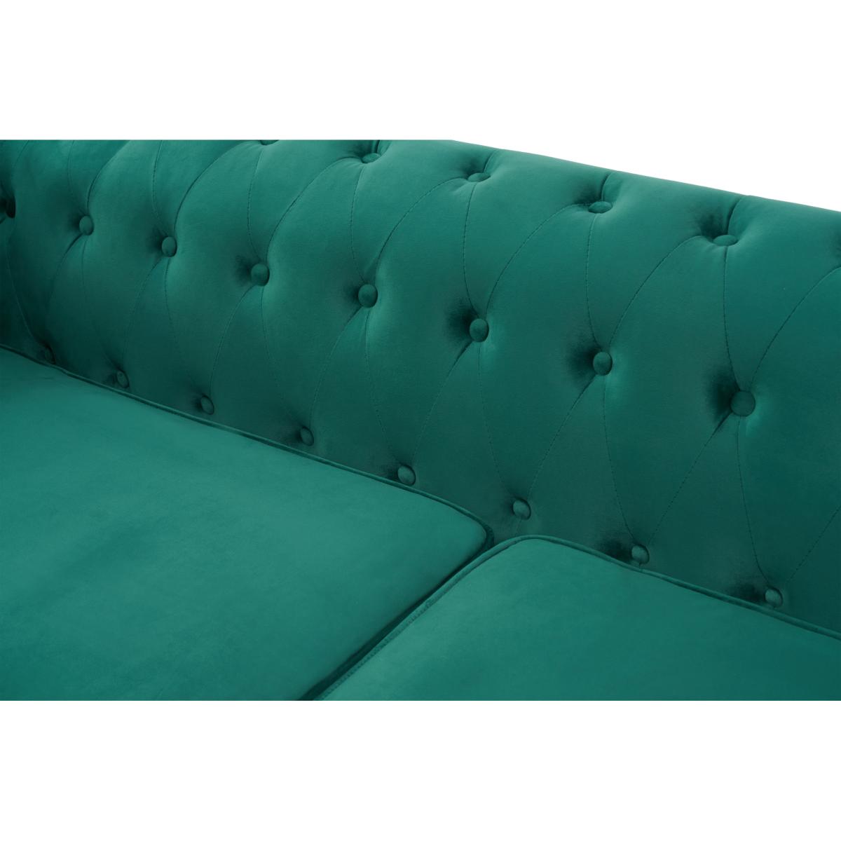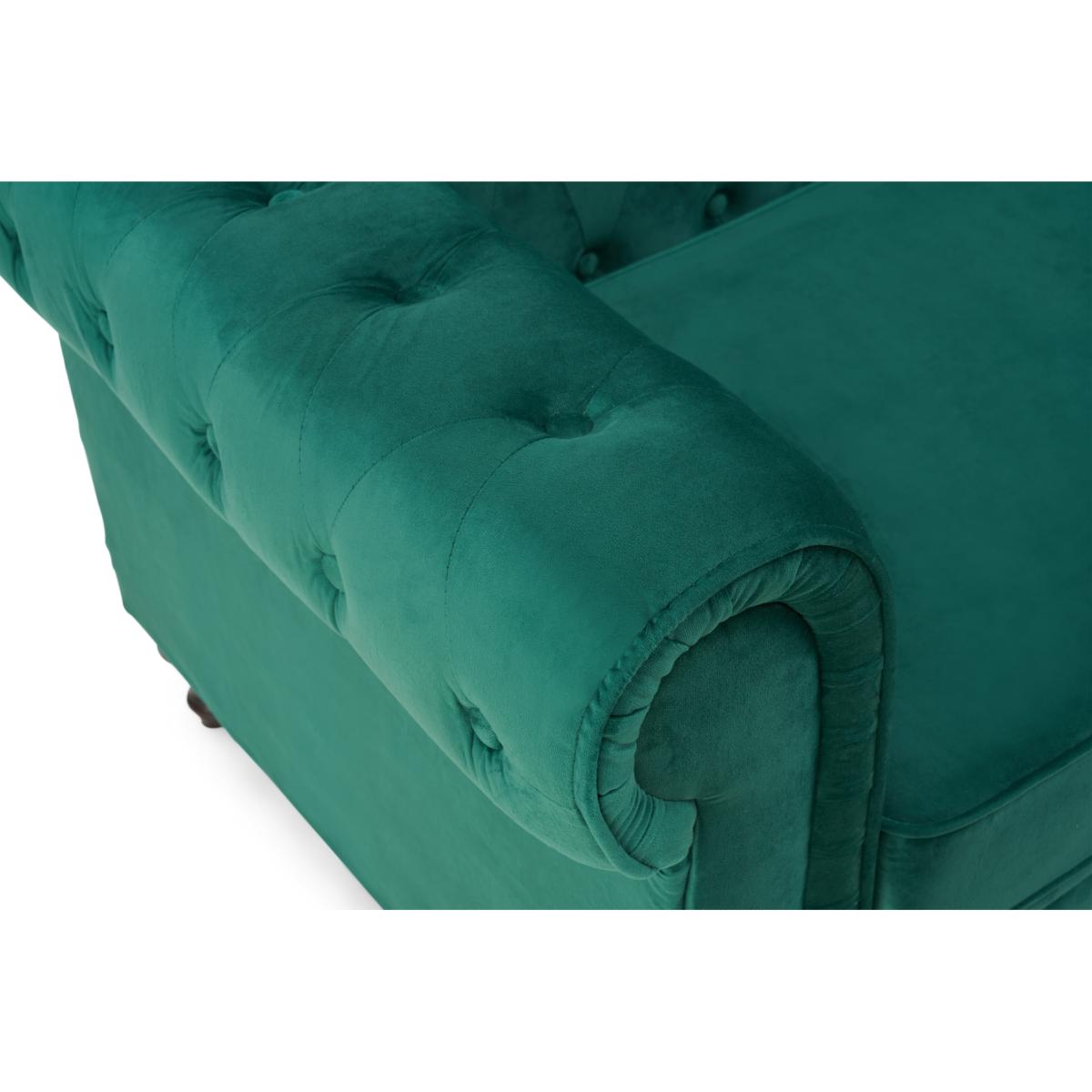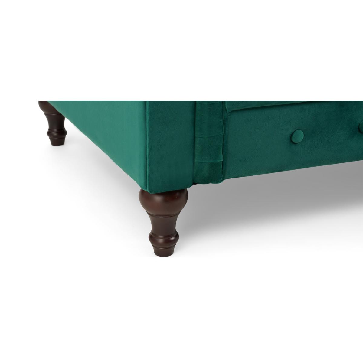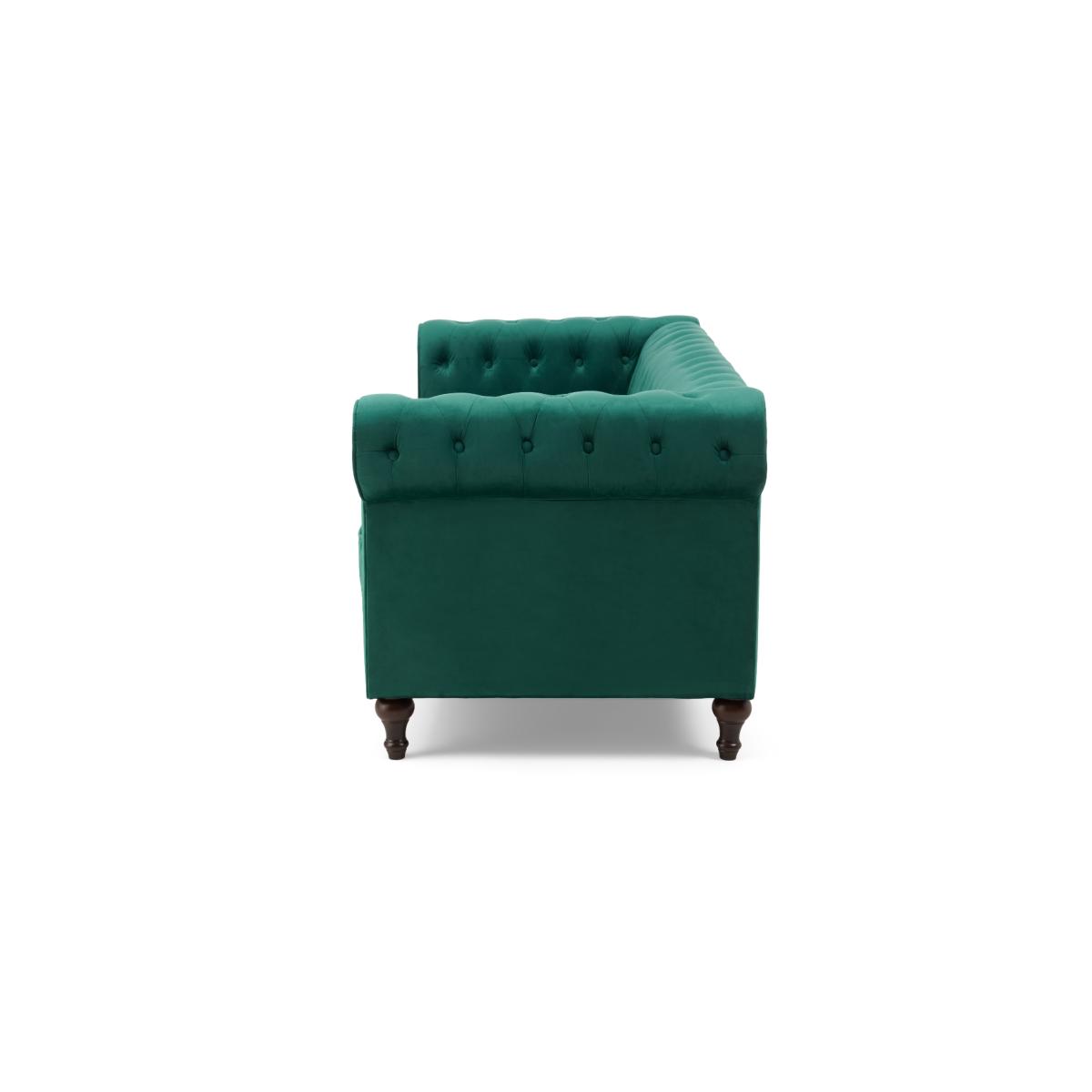 The Calama Green Velvet 3 Seater Sofa is a striking, comfortable choice for larger living spaces. With rich green velvet, the 3 seater sofa features elegant rolled arms and buttoning, with comfortable seat cushions and dark wood feet. Stunning green velvet sofa. Designed to seat 3 people Luxury green velvet makes a statement. Rolled arms and buttoned design for an elegant look. Comfortable seat cushions. Complete with ornate dark wood feet