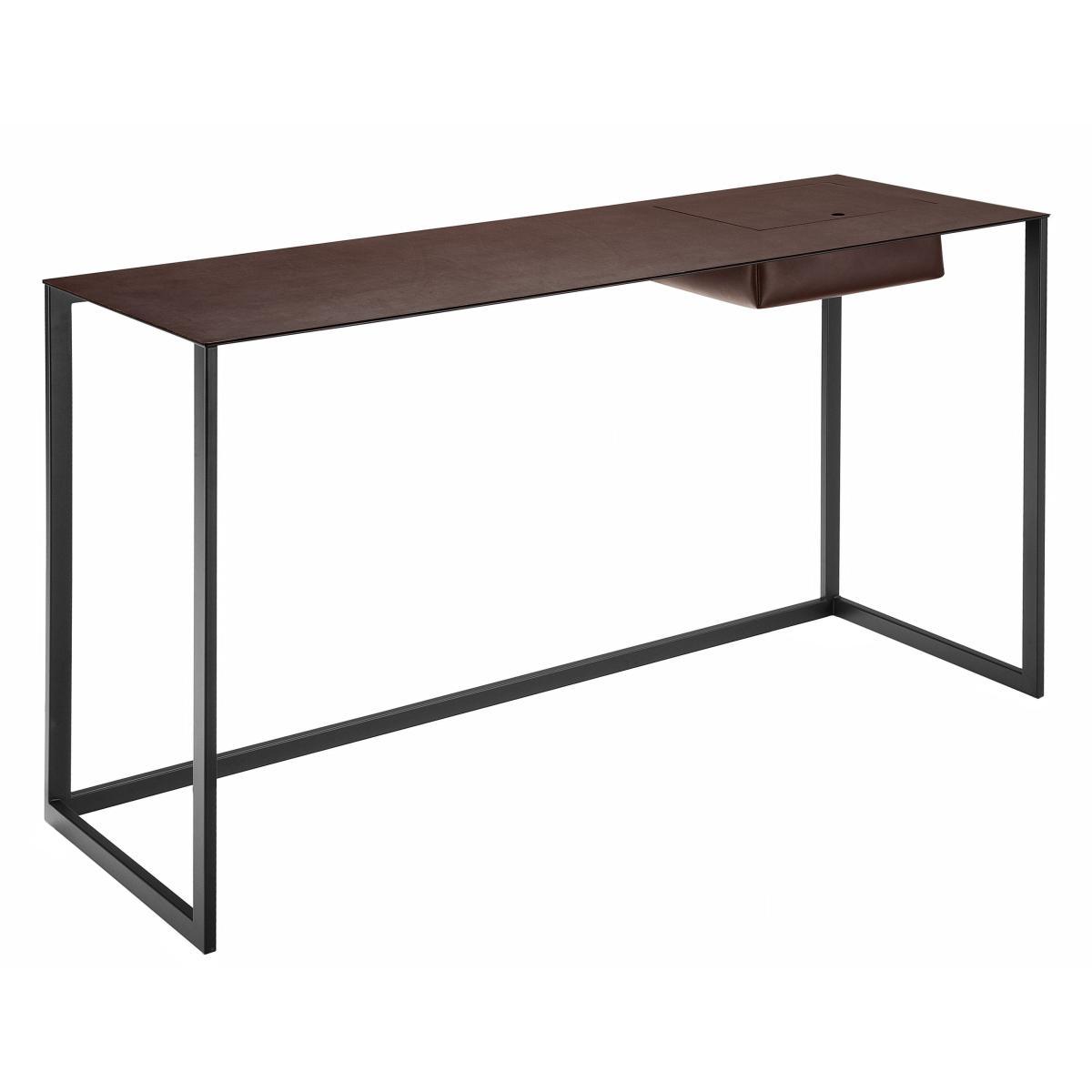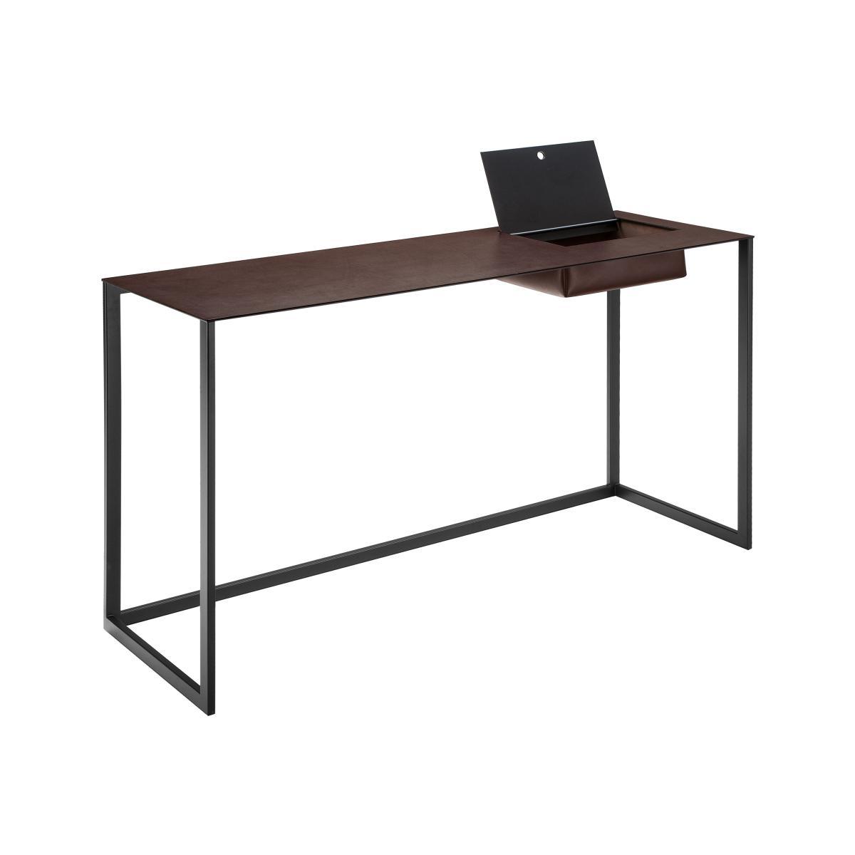The Calamo desk-console table by Gabriele Rosa. This piece fits seamlessly into the living Party collection designed by Rosa in 2012: with a painted steel structure with cowhide pigmentato cover for the surface and storage space under the folding lid.