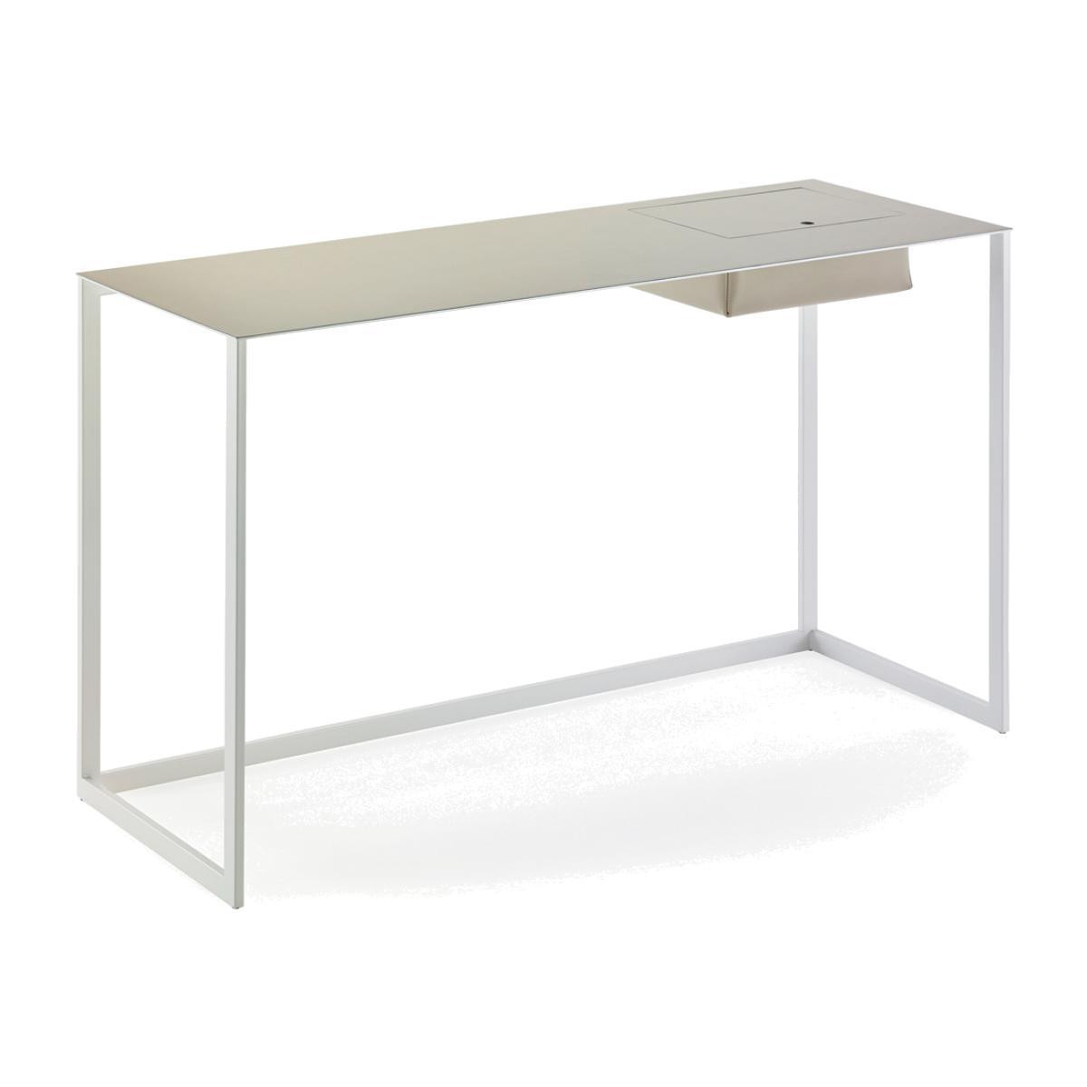 Designed by Gabriele Rosa, the Calamo desk showcases a varnished steel frame with Zanotta's rich beige-hued cowhide 'Cuoio' leather, and features storage that is subtly integrated into its slender form. The desk's 'Cuoio' leather upholstery is a full grain, beige vegetable-tanned hide with a beautifully soft finish, making the perfect enhancement to the slim, compact form of the Calamo desk, lending a pleasant and comfortable touch to the design. A contemporary and stylish design, the storage space is accessed by a drop-leaf opening. Sleek and sophisticated, the understated aesthetic of the Calamo desk in beige leather and varnished steel would complement an array of interior schemes.