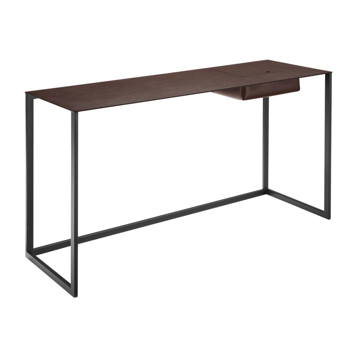 Designed by Gabriele Rosa, the Calamo desk showcases a varnished graphite steel frame with Zanotta's rich brown-hued cowhide 'Cuoio' leather, and features storage that is subtly integrated into its slender form. The desk's 'Cuoio' leather upholstery is a full grain, brown vegetable-tanned hide with a beautifully soft finish, making the perfect enhancement to the slim, compact form of the Calamo desk, lending a pleasant and comfortable touch to the design. A contemporary and stylish design, the storage space is accessed by a drop-leaf opening. Sleek and sophisticated, the understated aesthetic of the Calamo desk in brown leather and varnished graphite steel would complement an array of interior schemes.