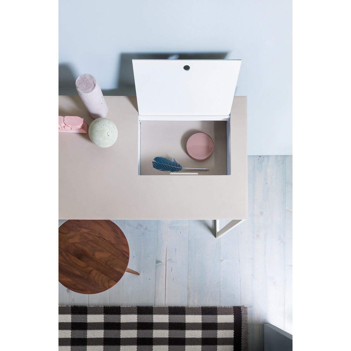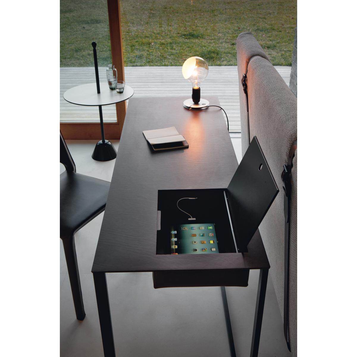 The Calamo desk-console table by Gabriele Rosa. This piece fits seamlessly into the living Party collection designed by Rosa in 2012: with a painted steel structure with cowhide pigmentato cover for the surface and storage space under the folding lid.