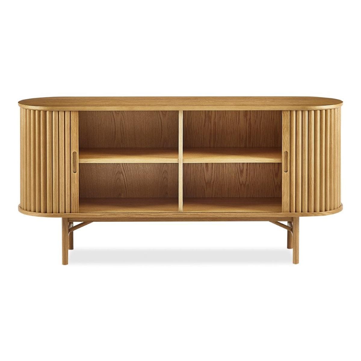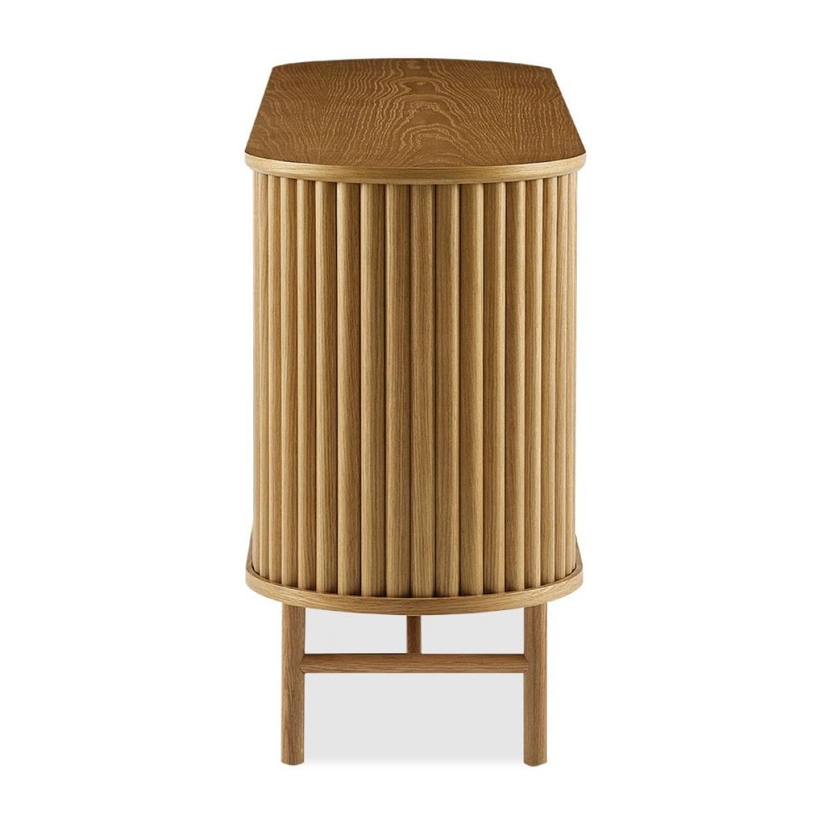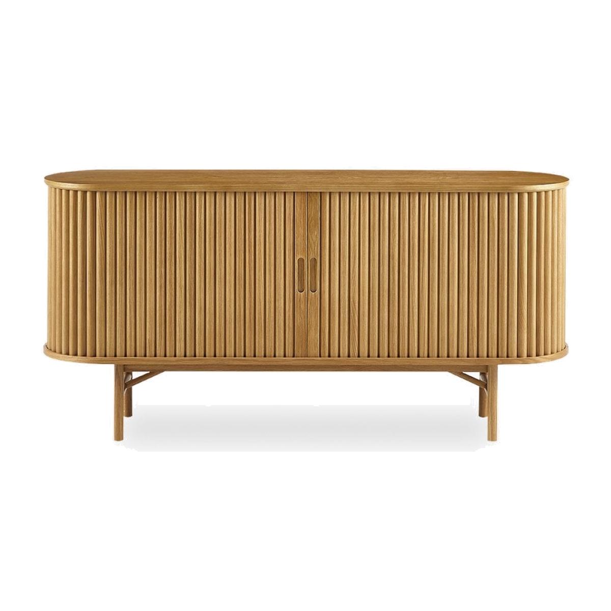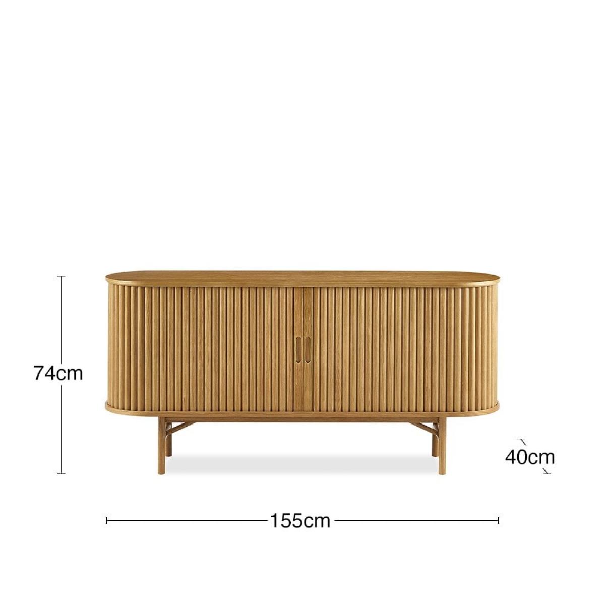The Caleb Wooden Sideboard combines soft curves with natural materials for organic Japandi design. There is added warmth and texture in the form of the light wood that is treated to showcase the natural grain of the wood from the smooth surface to the ribbed concertinaed doors. Accented with brass detailing, the Caleb Sideboard has two sliding doors on either end that join together for the minimaluxe look. View The Caleb Range