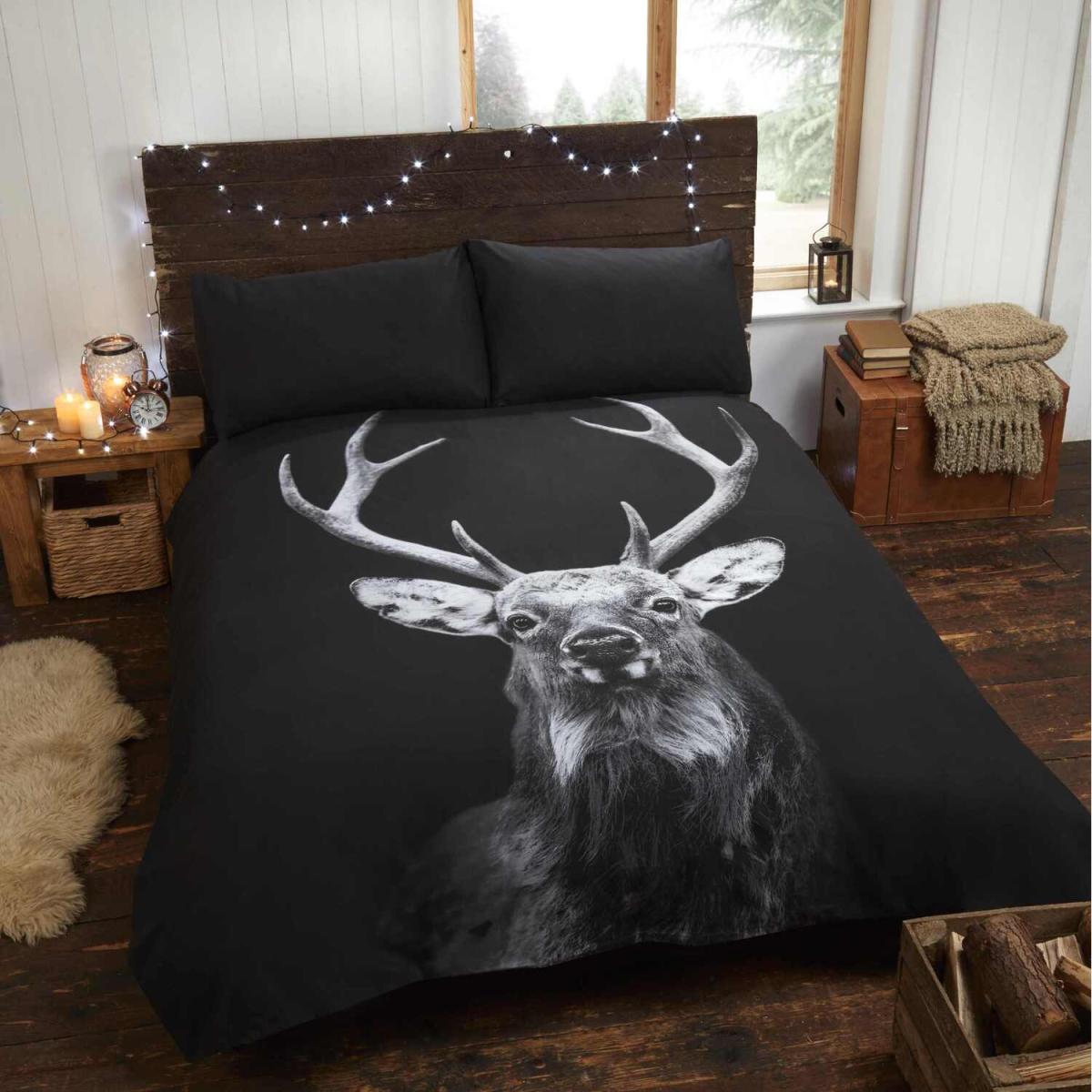 Featuring a photographic caledonian stag printed onto a black background, this soft and elegant duvet cover set makes a stylish addition to a rustic-style bedroom.