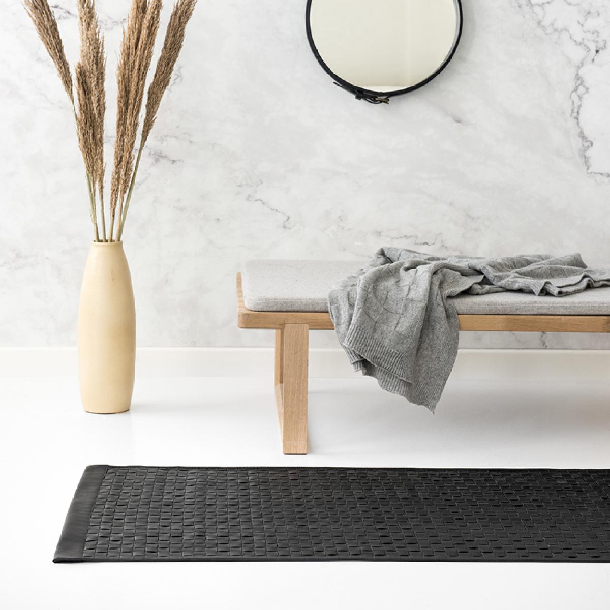 The Calf Leather Tuscany rug 65x135 cm from Rug Solid is a rug made of leather, handmade in Italy. This leather rug is crafted from excess leather from the Italian fashion industry. Instead of tossing the leather scraps that are left over after the creation of luxury leather products like clothing, shoes and bags, the scraps are collected and used to make rugs like these. This rug of recycled leather can be an elegant design element in your hall.