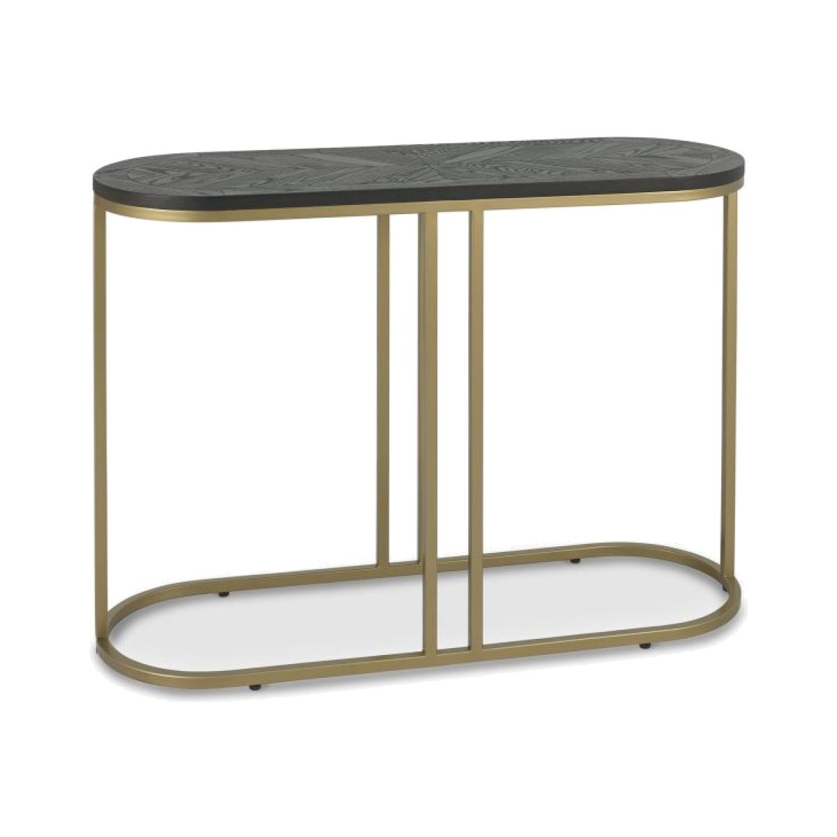 Add glamour and make a statement in your home with the Calgary Peppercorn ash occasional range. Saw cut ash marquetry tops are finished in a rich peppercorn coloured stain and married with a burnished satin brass metal base to give this range a chic and luxurious feel. Each of the hand-crafted boarded chevron patterned tops are wire brushed and distressed to give an authentic look and tactile feel, making the most of the beautiful and varied grains of ash. The radiused tops and bases combine beautifully with the linear frames to create a contemporary and slightly eclectic blend. Dimensions - W 110 x D 38 x H 77cm Console Table Finish - Peppercorn Ash Gold Metal Frame Material - Oak All screens vary in colour reproduction and whilst every effort has been made to display the colour as accurately as possible it is for guidance only.