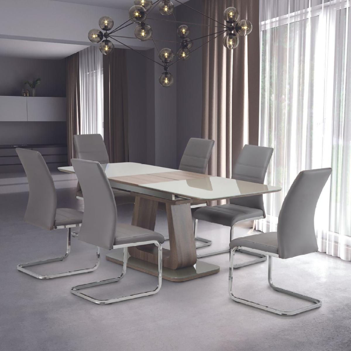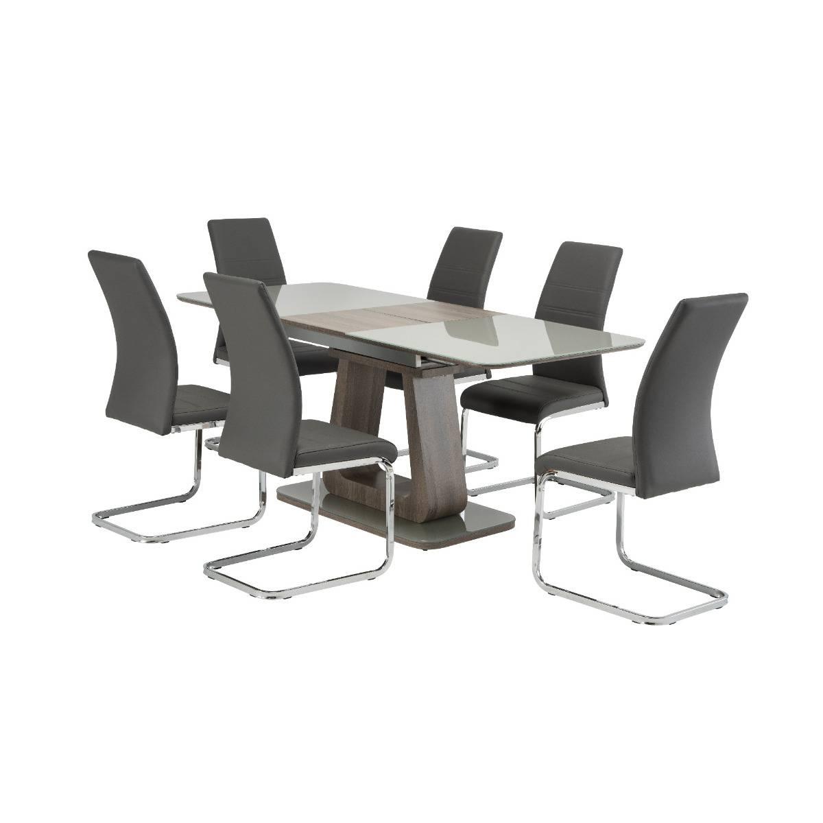 Calgery Extension Dining Table 6 Chair Set The Calgery 6 seat dining set is beautifully crafted in a high gloss and glass finish with a grey Oak centre section and trim. This elegant and contempory dining set is perfect for traditional and modern homes alike. The stunningly detailed centre section can be effortlessly extended with one hand, allowing easy accomodation of additional guests. An extendable dining table offers versatility and space efficiency. It can adapt to varying guest numbers, making it ideal for small and large gatherings. The table's flexibility enhances functionality while saving room space. Calgery Extension Dining Table 6 Chair Set The Calgery 6 seat dining set is beautifully crafted in a high gloss and glass finish with a grey Oak centre section and trim. This elegant and contempory dining set is perfect for traditional and modern homes alike. The stunningly detailed centre section can be effortlessly extended with one hand, allowing easy accomodation of additional guests. An extendable dining table offers versatility and space efficiency. It can adapt to varying guest numbers, making it ideal for small and large gatherings. The table's flexibility enhances functionality while saving room space.