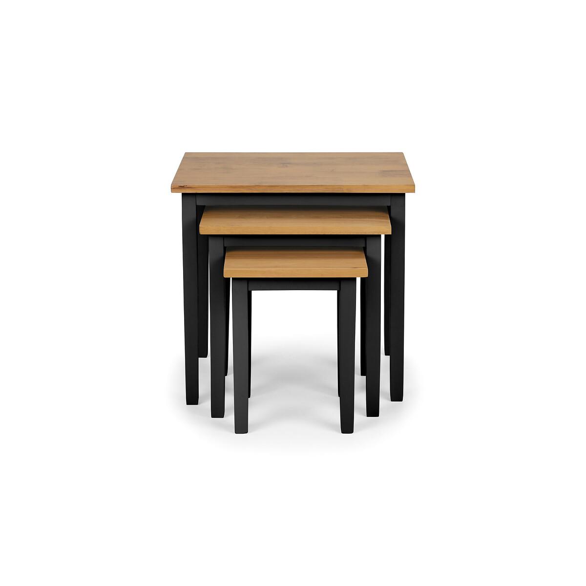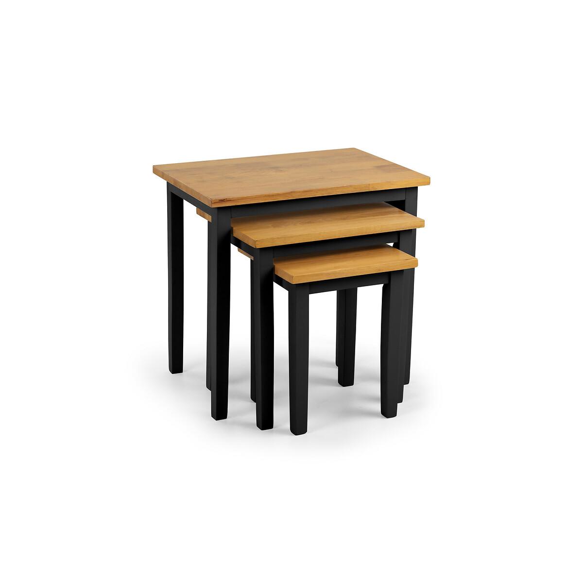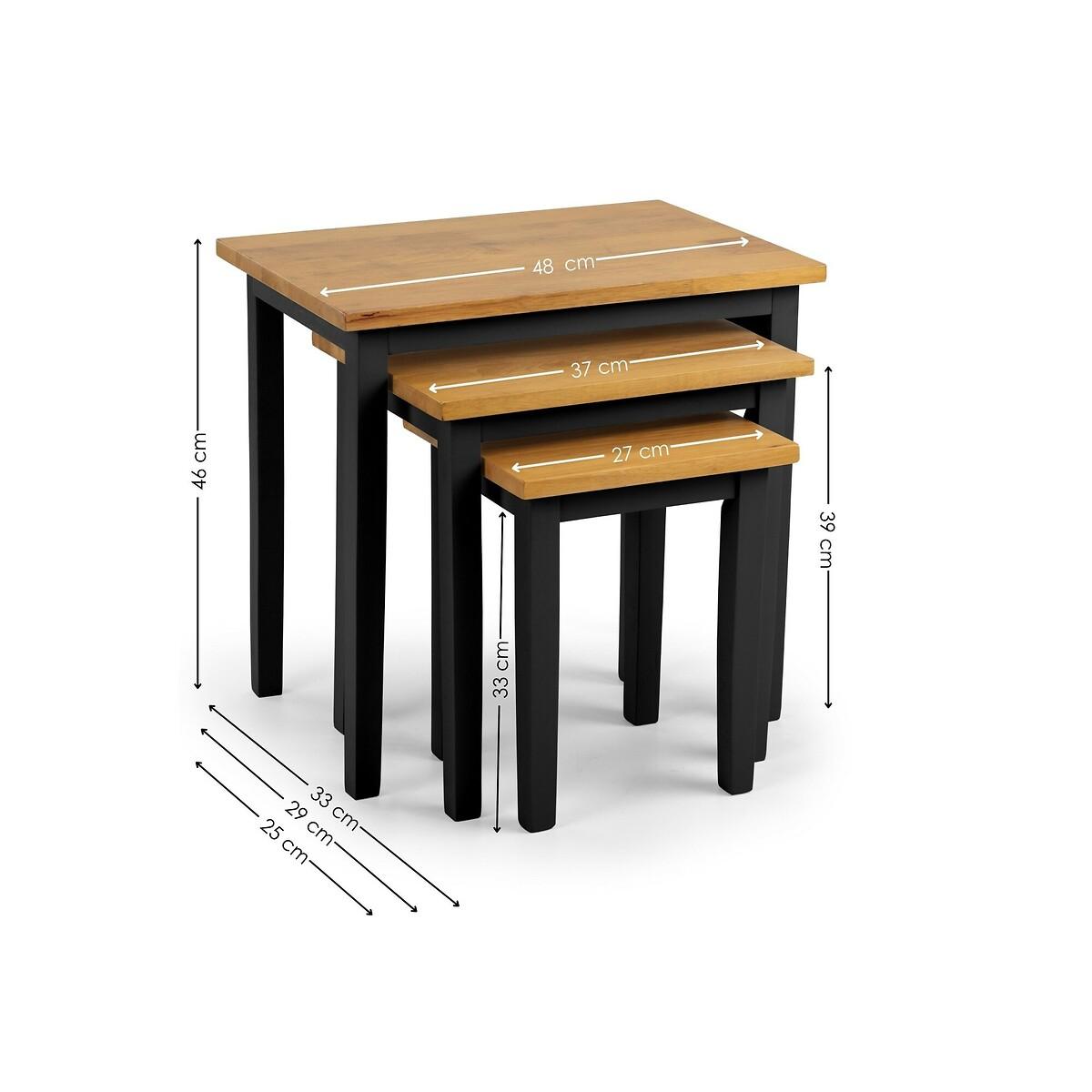 The Calia nesting tables are designed with sleek black frames and warm oak tops, bringing a timeless look to any living room. The practical stacking design keeps things neat and space-saving, while offering flexibility as side or occasional tables. A versatile blend of style and functionality, with simple assembly required – just attach the legs. Product Details• Partial assembly required (legs/feet only)Product Composition - 95% WOOD, 5% METALProduct Dimensions - 48 cm x 33 cm x 45.7 cm , Weight - 8.8 KGPackage Dimensions - 56 cm x 36 cm x 14 cm, Weight 9 KGThis product will be dispatched by one of our trusted suppliers. You’ll be contacted by their selected courier about your delivery. Please note: this product cannot be delivered to all Offshore Islands, Northern Ireland or Republic of Ireland.