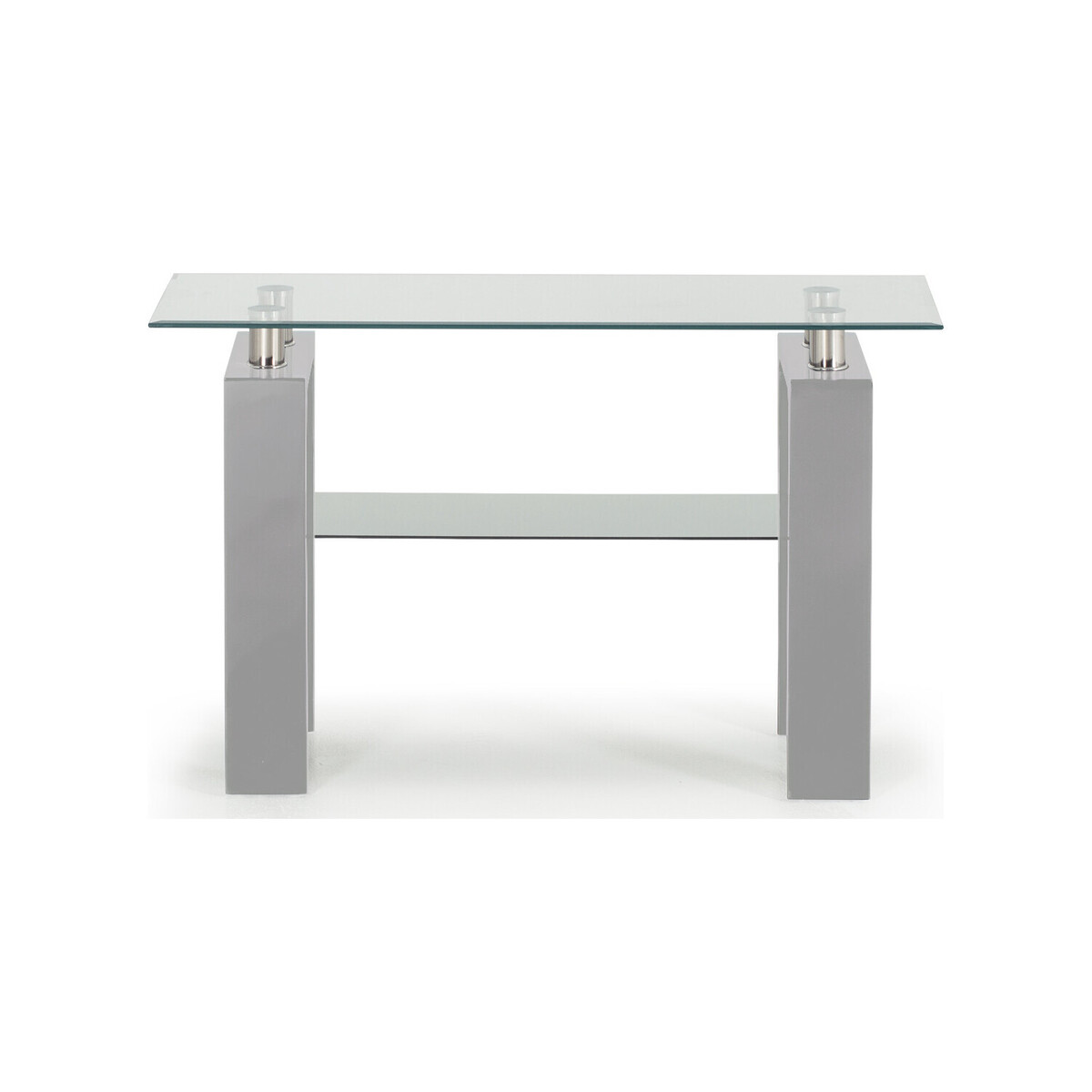 The Calico Console Table is a slimline and elegant occasional table, suitable for many styles of interior. Its bold, transparent style creates the illusion of light and space, making it great for smaller rooms and compact spaces. Its high gloss grey frame works beautifully with the clear glass tabletop. Safe bevelled edge glass tabletop. Elegant high gloss grey frame. Stainless steel uprights enhance the modern appearance. Teams easily with the wider Calico Collection.