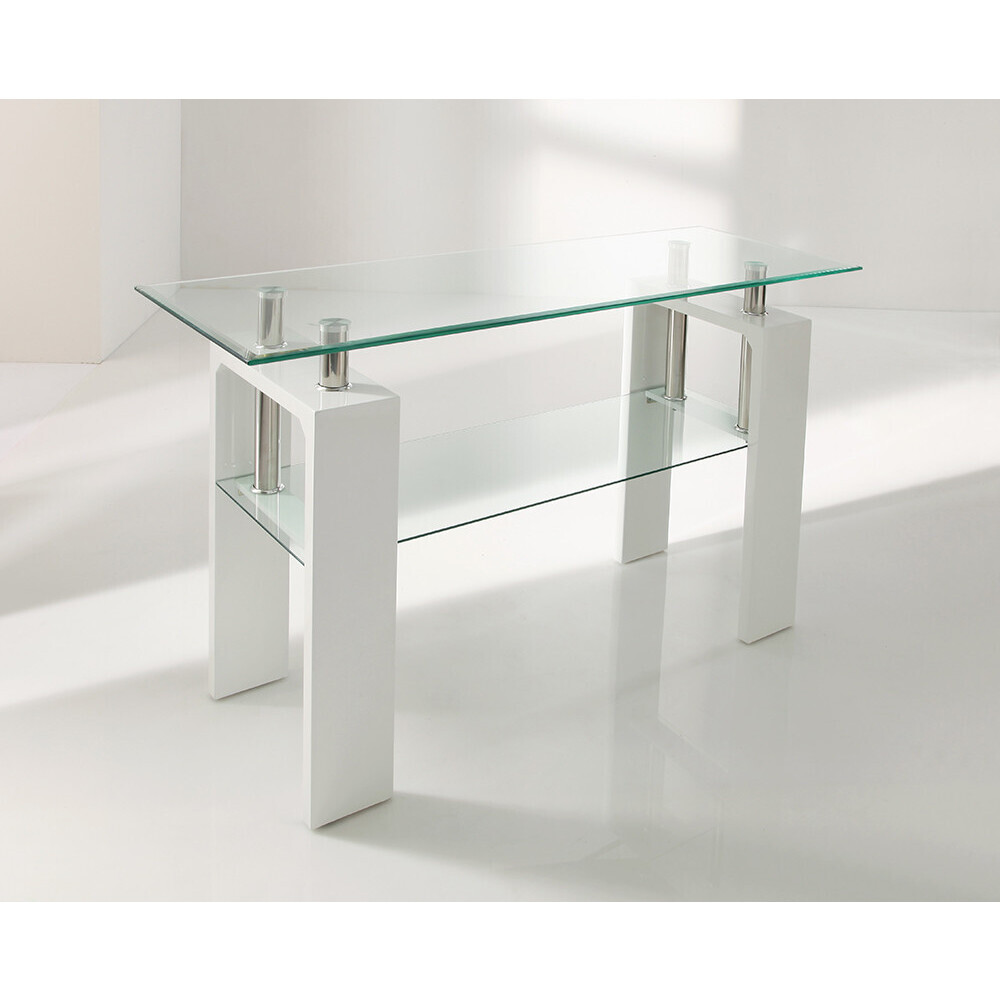 The Calico Console Table is an elegant and sophisticated way of adding additional occasional space to your home. Its slim profile makes it ideal for many rooms in the home, including in hallways, and it adds real elegant style to any room. Combining a high gloss white frame and transparent tempered glass tabletop, it brings contemporary style right to your home. Strong tempered glass tabletop. Elegant high gloss white frame. Polished stainless-steel uprights complete the look. Coordinates with the wider Calico Collection.