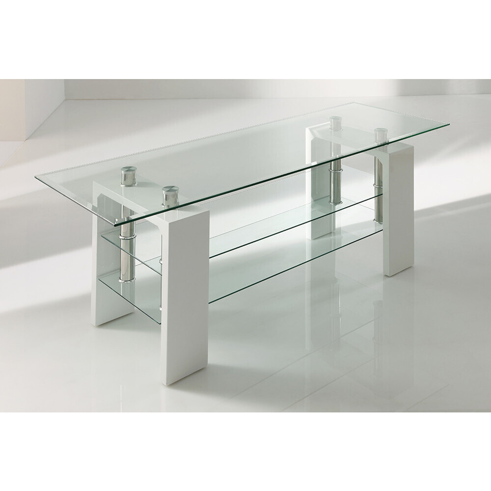The Calico TV Stand is a sleek and modern addition to your living space. It provides convenient storage space for your TV and media devices, and it blends with ease into many modern interiors. Its glass tabletop and shelves create the illusion of space and light and its high gloss white frame compliments the whole design. Elegant white glossy finish Tabletop and two shelves provide ample space Polished metal uprights enhance the modern design Coordinates easily with many modern interiors