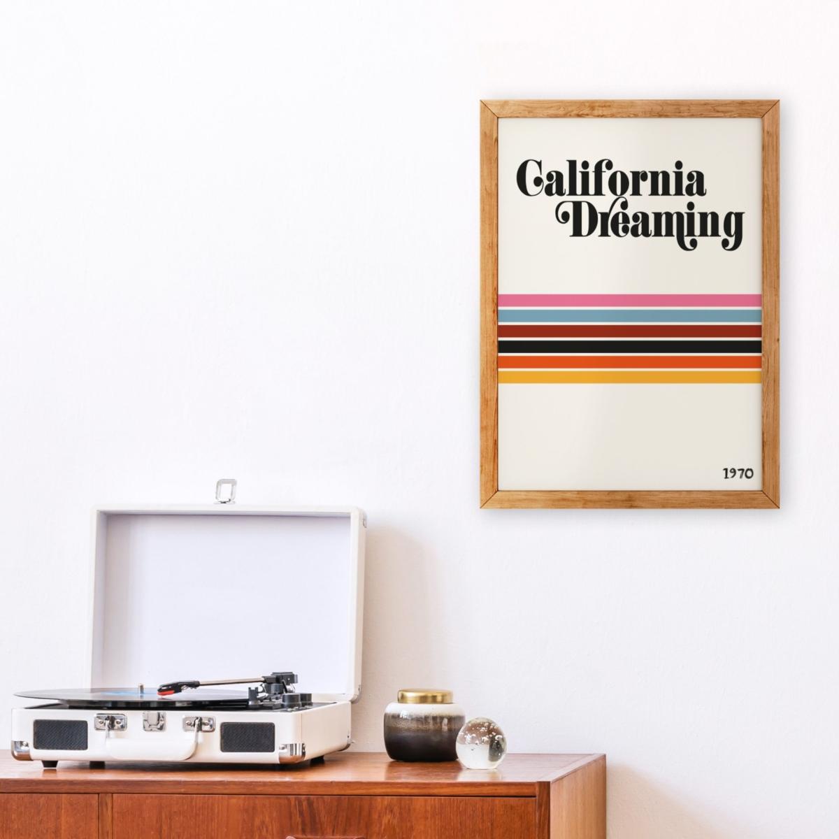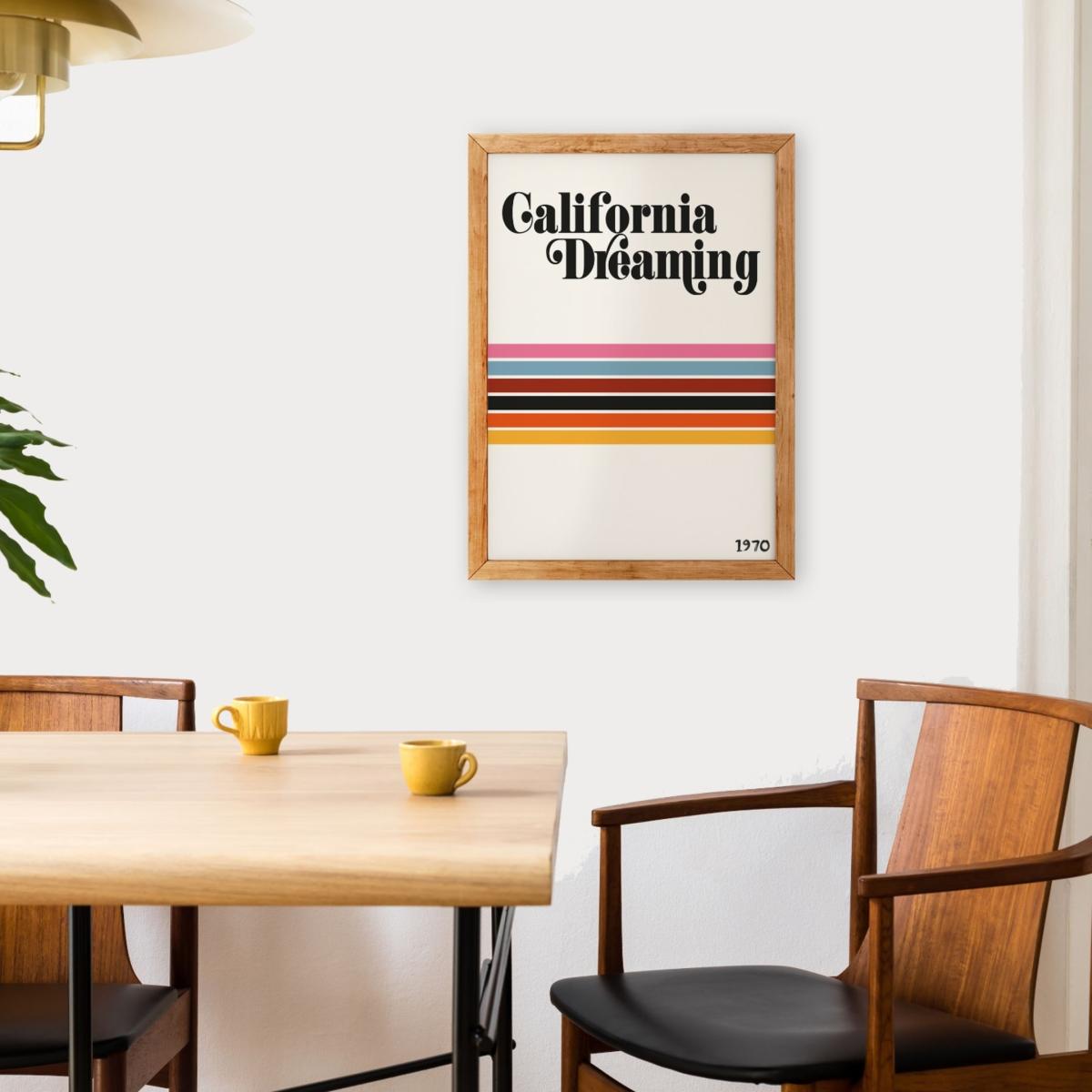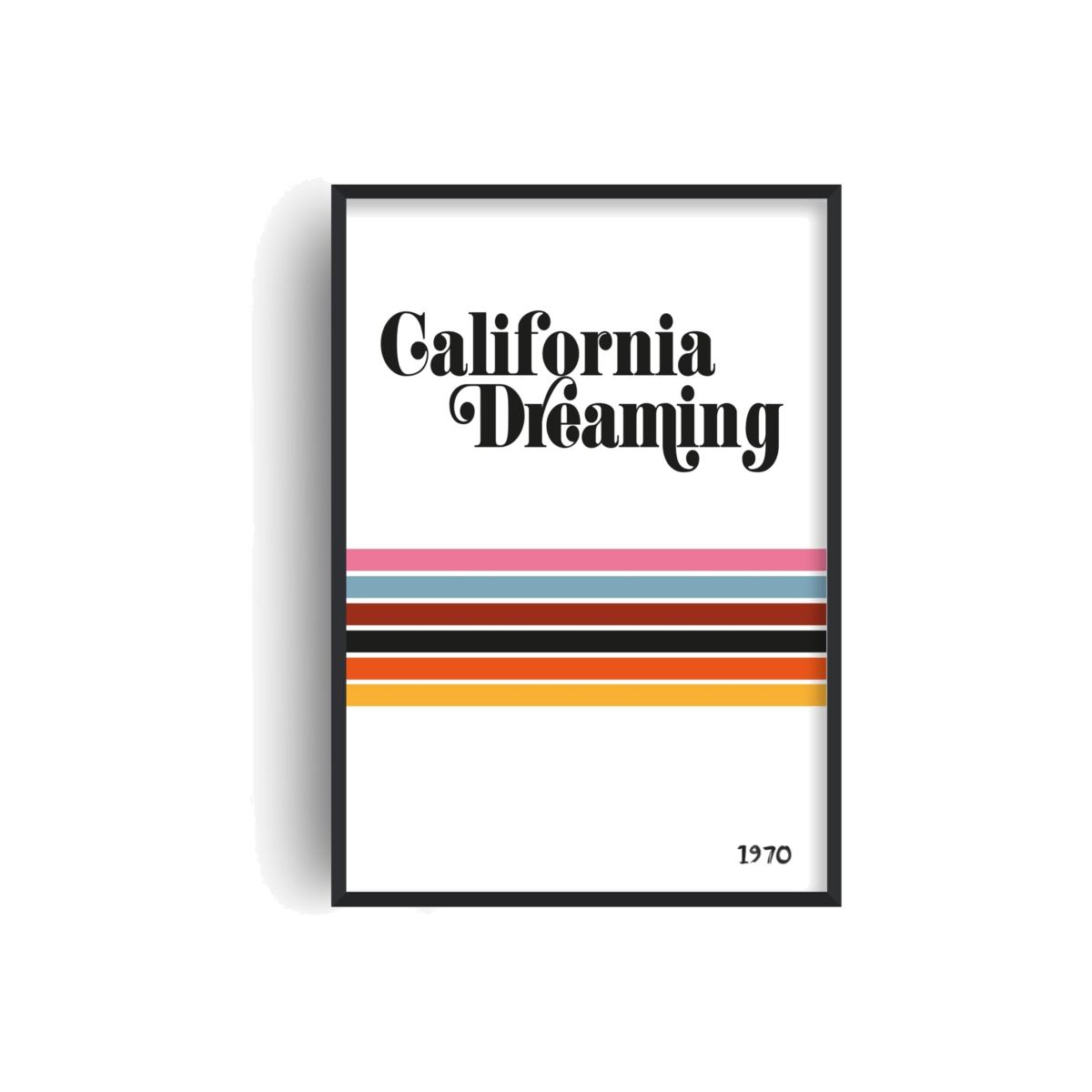 All the leaves are brown and the sky is grey..... We've gone to the west coast to seek the sun and 60s inspiration, Inspired by the legendary song California dreaming by The Mamas and Papas. Our California dreaming print fuses a 1960s/70s Californian colour palette and stripe with the San Francisco folk inspired typography. Taking influence from both the skateboarders and surfers on Venice Beach and the counter culture free spirited movement. Brighten up your walls with this fun and retro art piece. Giclée printed on Munken pure smooth cream paper which is certified by the Rainforest Alliance Program for FSC® Standards.