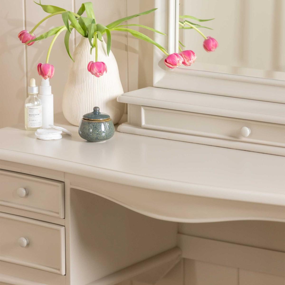 The Calista Off White Wooden Dressing Table brings timeless elegance to classic and country-style interiors. Beautifully crafted from rich mahogany and engineered wood, itrsquo;s finished in a soft off-white hue that adds charm and warmth. Its gracefully curved legs and five practical drawers offer both style and storage. A refined and functional piece, perfect for creating a serene, organised corner in your bedroom or dressing space.
