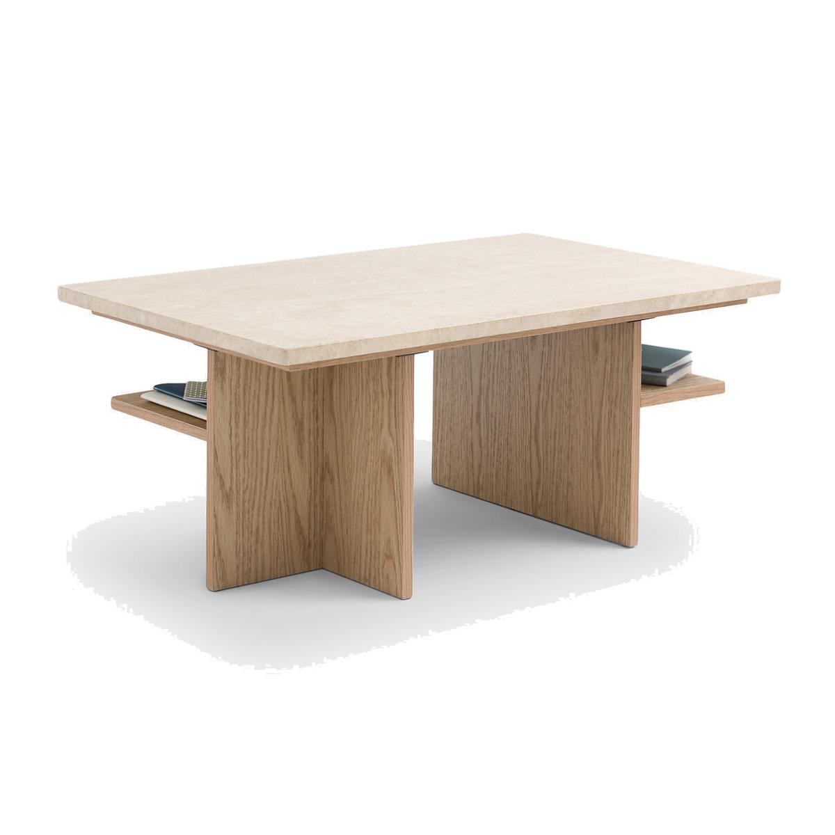Ultra-graphic geometric lines. The Caliste coffee table displays a contemporary style, and brilliantly combines travertine and oak veneer. An original creation by La Redoute Intérieurs. Product Details • Travertine top with nitrocellulose varnish finish • Base in oak veneered MDF, nitrocellulose varnish finish • Matte finish black steel glides. Care instructions • To protect your coffee table, consider trivets, coasters and placemats. Dimensions Total • Width: 100cm • Height: 40cm • Depth: 60cm • Weight: 41kg Shelf under top • Width: 27.2cm • Height: 13.7cm • Depth: 19.1cmDelivery:. This product is sold ready to assemble. Note! Please check that all access points are large enough to accommodate your delivery (doors, stairs, lifts).Parcel dimensions and weight • 2 parcels • L115 x H14 x D76cm, 39kg • L59 x H45 x D49cm, 16kg