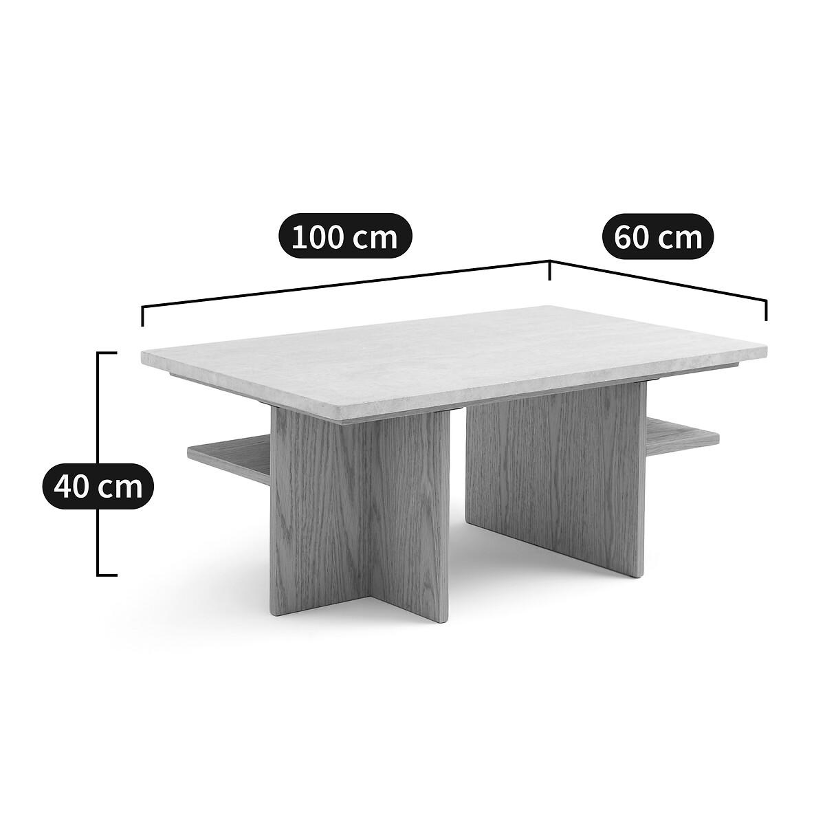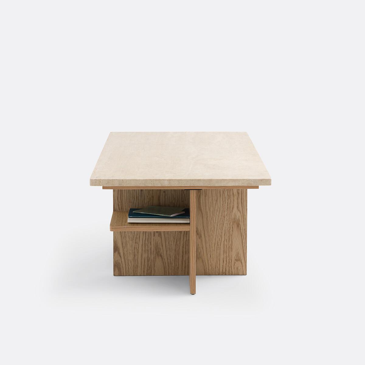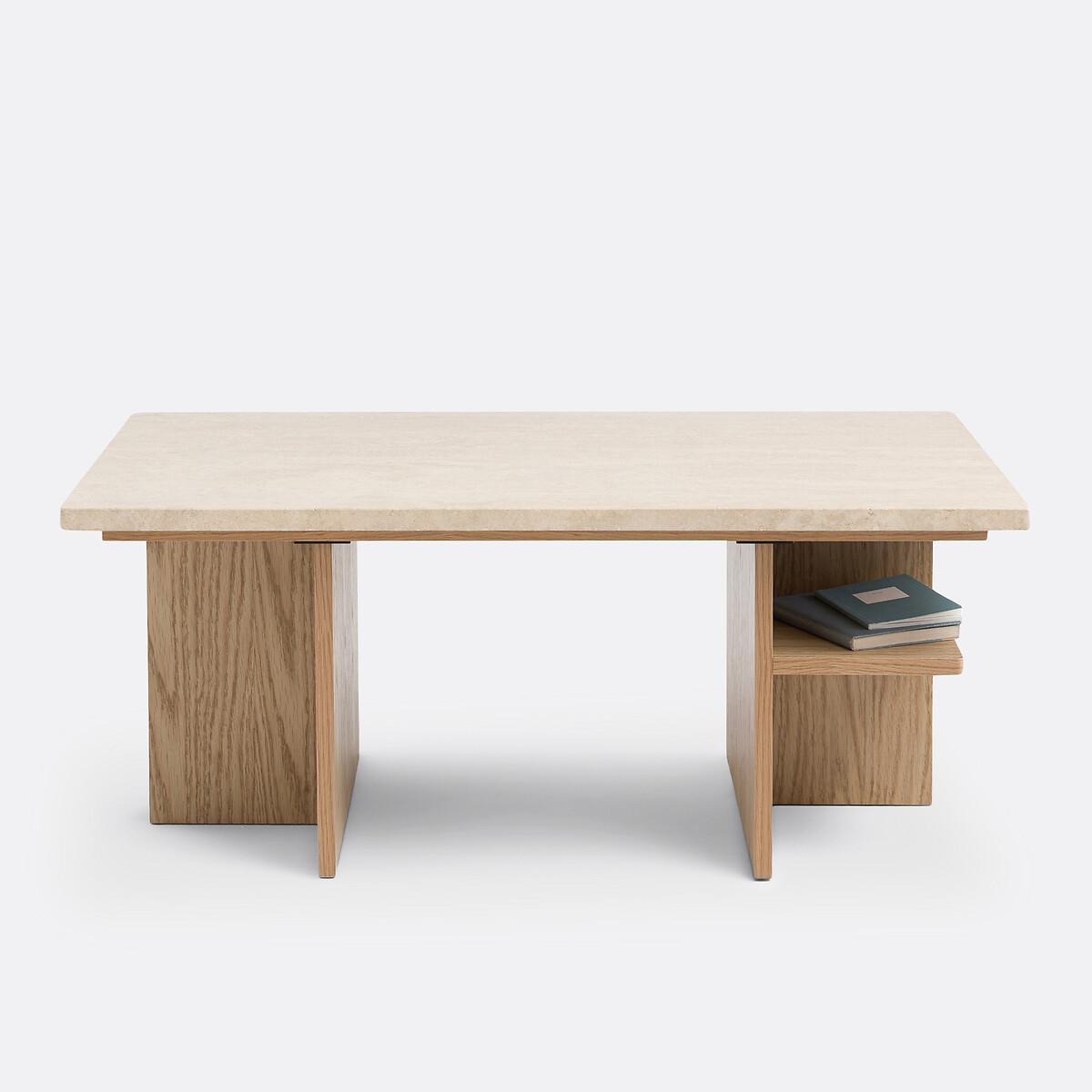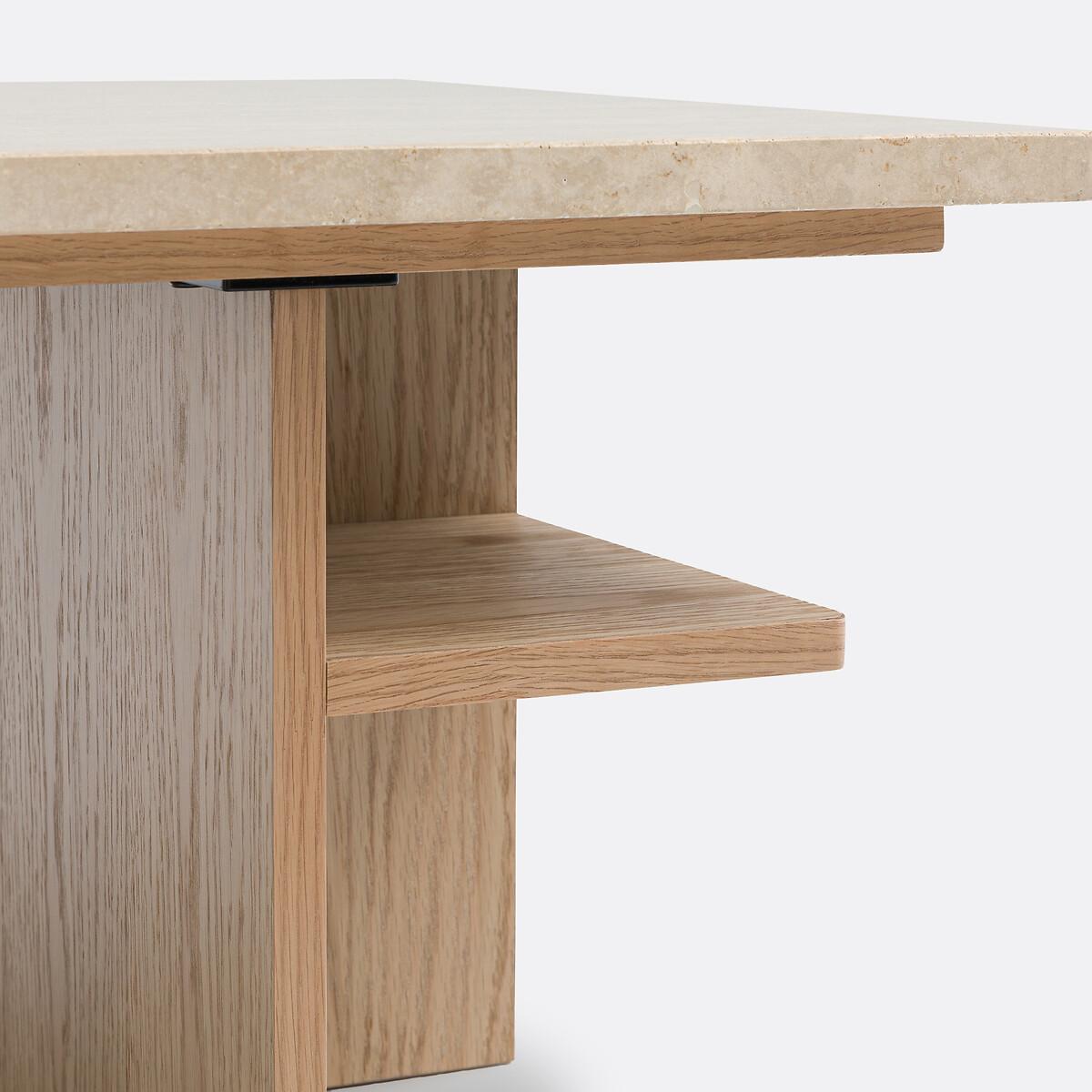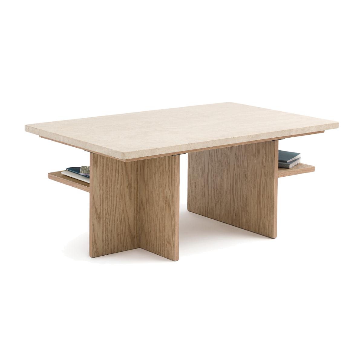 Ultra-graphic geometric lines. The Caliste coffee table displays a contemporary style, and brilliantly combines travertine and oak veneer. An original creation by La Redoute Intérieurs. Product Details • Travertine top with nitrocellulose varnish finish • Base in oak veneered MDF, nitrocellulose varnish finish • Matte finish black steel glides. Care instructions • To protect your coffee table, consider trivets, coasters and placemats. Dimensions Total • Width: 100cm • Height: 40cm • Depth: 60cm • Weight: 41kg Shelf under top • Width: 27.2cm • Height: 13.7cm • Depth: 19.1cmDelivery:. This product is sold ready to assemble. Note! Please check that all access points are large enough to accommodate your delivery (doors, stairs, lifts).Parcel dimensions and weight • 2 parcels • L115 x H14 x D76cm, 39kg • L59 x H45 x D49cm, 16kg