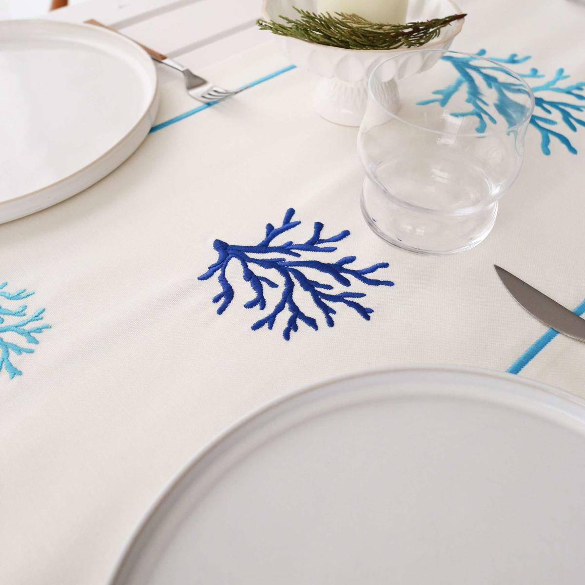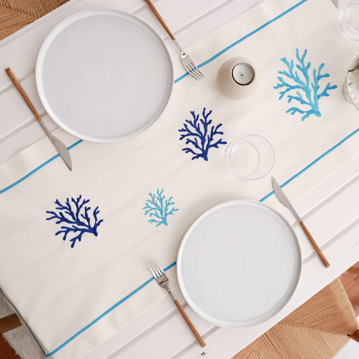 I love the Callaina runner for its vibrant turquoise coral embroidery; it adds a pop of colour and texture without overwhelming a space. It works particularly well in coastal-inspired interiors, casual dining areas, or paired with neutral tones to bring a fresh, aquatic feel. Practical styling tips include layer it over a plain wooden or white table to let the embroidery stand out, or use it on a sideboard or buffets for a visually appealing surface. Its versatile one-size fit makes it ideal for lengthening tables or adding interest along a countertop. Keep in mind that its delicate embroidery pairs best with simple dinnerware and minimal accessories to prevent visual clutter.