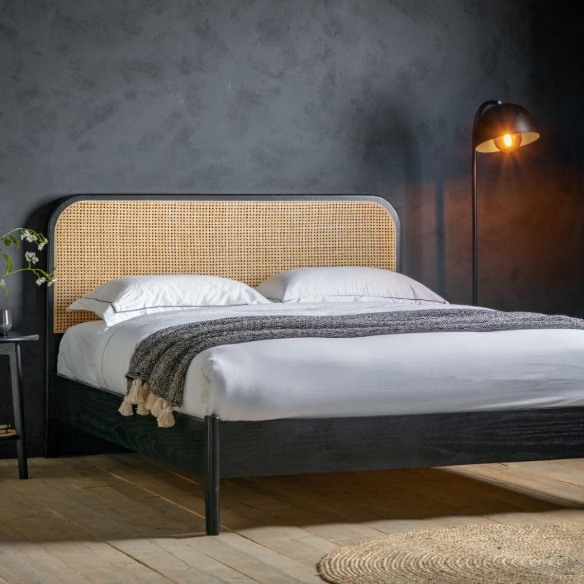 Dramatic statement style sure to become a modern classic. The solid black stand oak frame combines comfort and style ease, with curved corner headboard featuring a woven rattan panel creating a stunning stand out contrast of colours and materials. Available in 4’6″ and 5″ sizes. Material:Oak / Oak Veneer / Pine / Rattan. Colour/Finish: Natural.