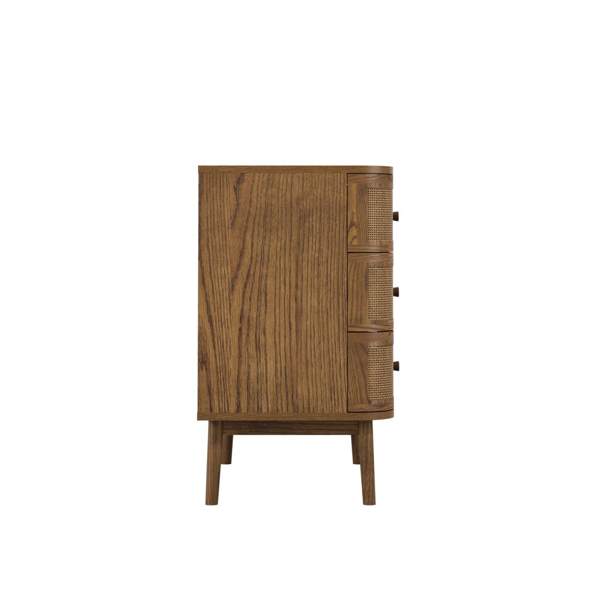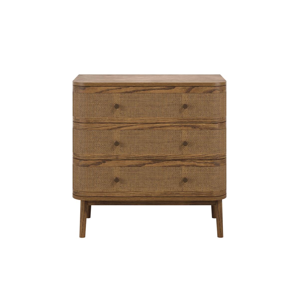 * Wood grain finish* Curved edges* 3 large drawers This chest features a distinctive smoked colour and is crafted with curved edges on the drawers, adding a touch of elegance to its design. Made from durable wood, this chest of drawers offers three spacious drawers, each equipped with drawer stoppers to ensure smooth and secure operation.
