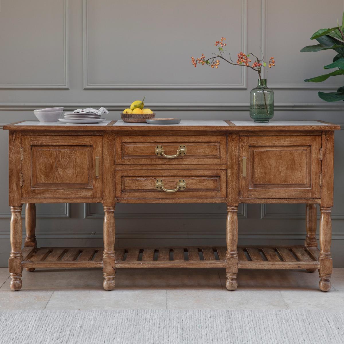 The Callie sideboard is the perfect combination of rustic and traditional style. Featuring beautifully craftedmango wood topped with three elegant pieces of marble stone. The Callie sideboard consists of two drawers and two doors which conceal ample closed storage space, and with an open shelf at the base creating a practical and beautiful sideboard.