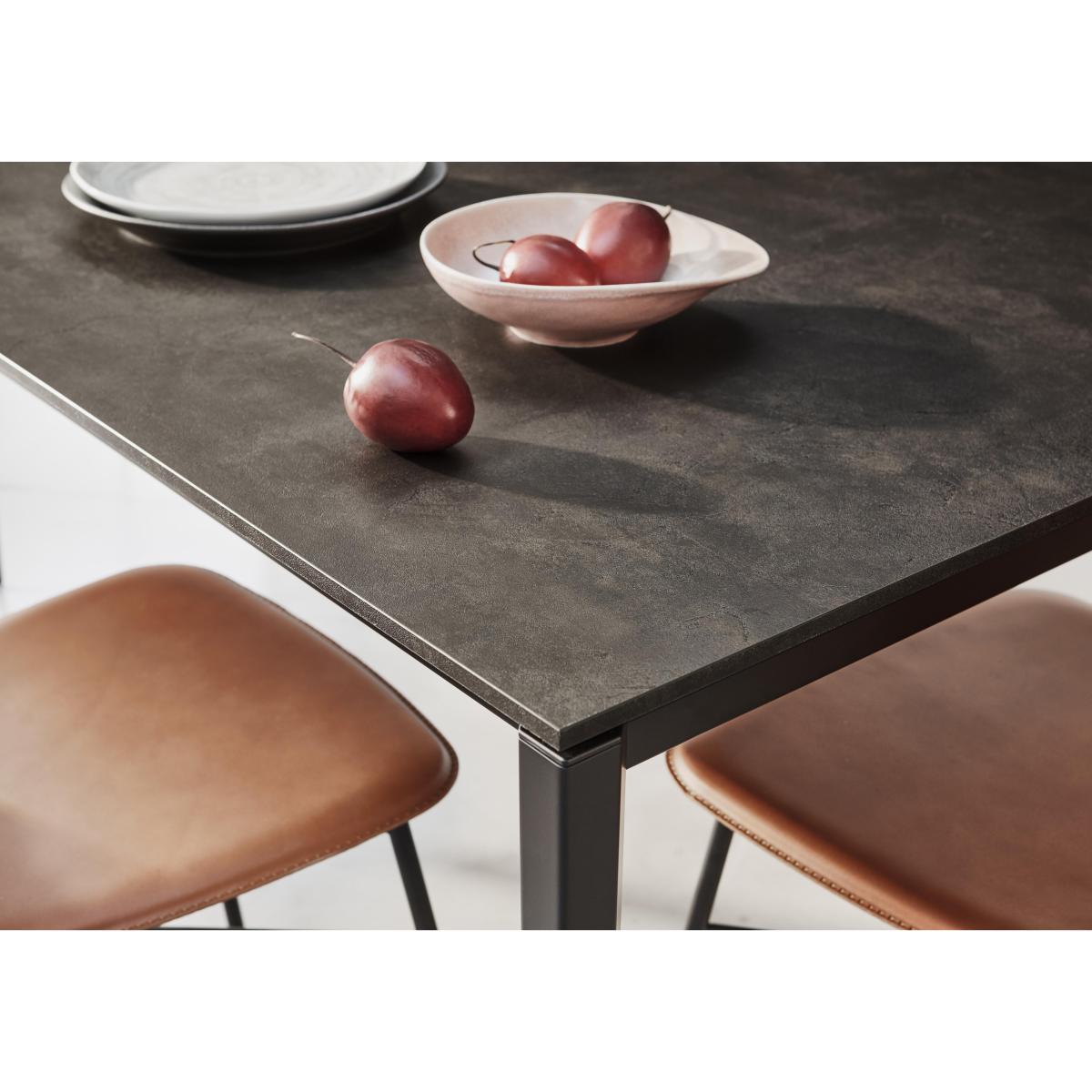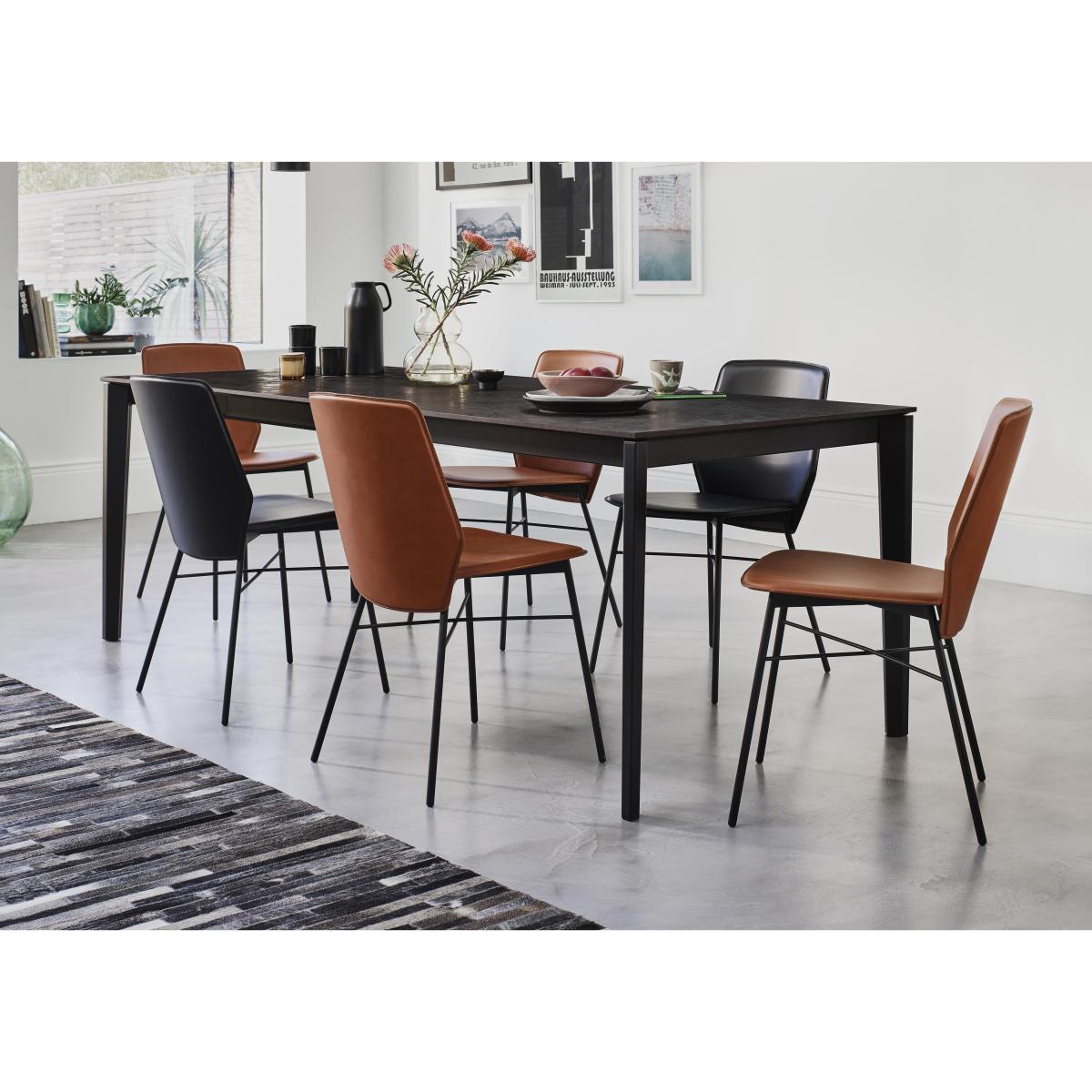 Contemporary dining style, designed and made in Italy. On trend melamine and matt metal table seats up to 12. With 6 stylish faux leather dining chairs. Bring home cool Italian dining style with the contemporary Calligaris Pentagon extending dining table with oxide bronze top and 6 Sibilla dining chairs dining set. Your guests will love the melamine-topped extending dining table in oxide bronze with matt metal frame and legs. And you’ll appreciate its durable, easy-clean and heat- and scratch-resistant properties. Legs are tapered and have pentagon-shaped profiles. This table comes withtwo pattern-matched extension leaves. It alsoseats eight and extends to seat ten or 12. Leaves are stored in a hidden drawer within the table, and legs cleverly stay at the table corners even when fully extended. Slim and stylish, the six metal-framed Sibilla dining chairs in this set have hexagonal backs and matt black metal legs. Comfortably cushioned, they’re upholstered in faux leather with piping detail. Choose from either cognac or black faux feather chairs. The Calligaris Pentagon extending dining table with oxide bronze top and 6 Sibilla dining chairs dining set is part of the Calligaris Pentagon collection. A Connubia by Calligaris range. Did you know?. Melamine is highly durable, and heat and scratch resistant. To keep the table’s surface in perfect condition, be sure to clean up any spills quickly.