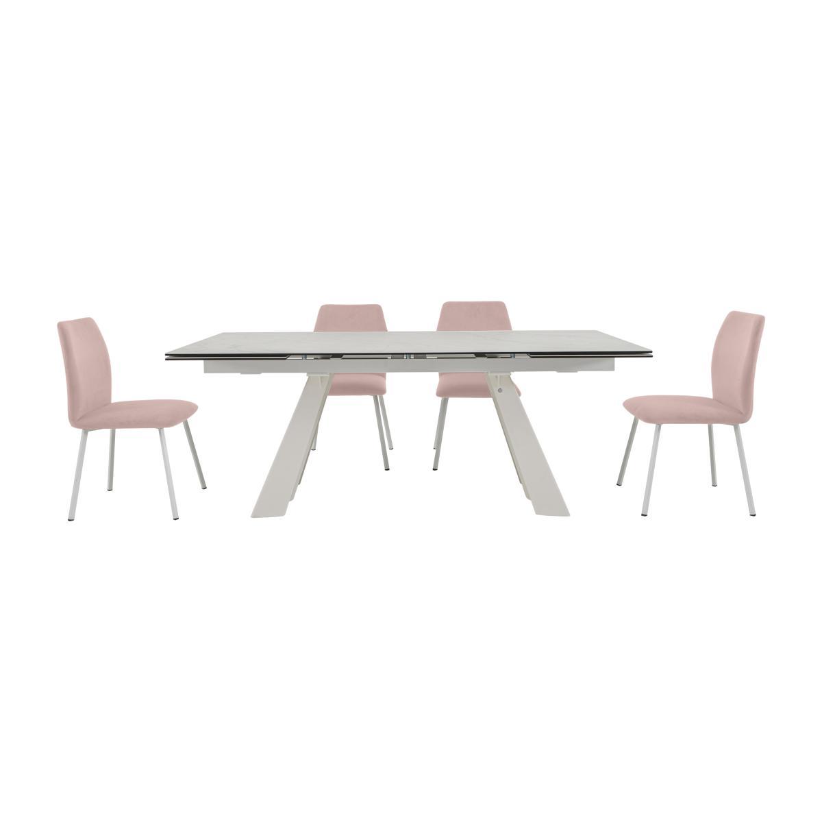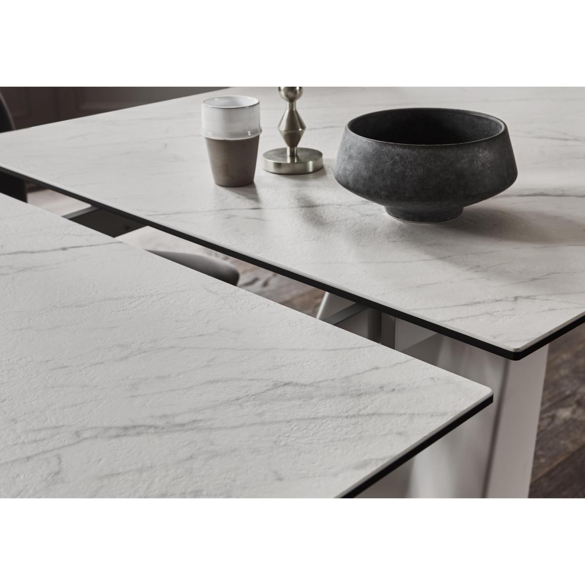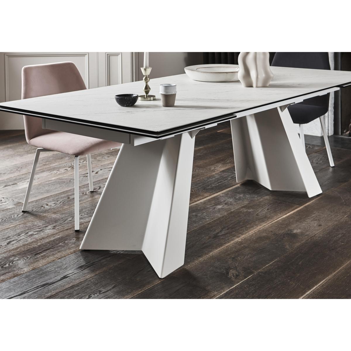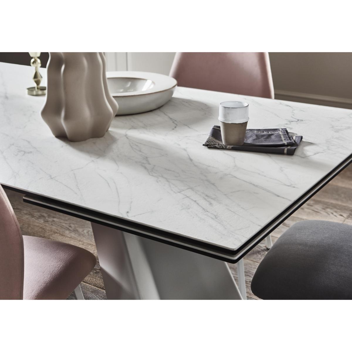 Calligaris Wings takes Italian designed dining luxury to new heights. Discover extending ceramic and glass topped dining tables on a striking metal base. In a choice of contemporary finishes, including a white Alpine marble effect. The dining table is available in two sizes for seating up to 12, perfect for entertaining a crowd. A sleek, spacious sideboard and fixed or swivel velvet-upholstered dining chairs in a choice of four colours complete this stunning collection. Luxurious Italian designed dining set. A glass and ceramic topped dining paired with four fabric upholstered chairs. Calligaris style and quality at a fantastic value price. Why you'll love it. Stylish contemporary luxury from Calligaris. Ceramic and glass topped extending dining table. In a stunning Alpine marble finish. Modern metal base in white. Table is in a choice of two sizes, seating 8-10 or 10-12. Ceramic is beautiful, hardwearing and easy to care for. With 4 modern fabric dining chairs in a choice of exclusive shades. What you need to know. Matt optic metal table base and chair legs. Table has 2 easy extension leaves, pattern matched to the table top, one at each end. Leaves slide smoothly under the table when not in use. Ceramic-glass is made by coupling one ceramic plate (porcelain tile) to tempered floating glass. It is very hygienic as it does not absorb liquids or release harmful substances. Ceramic is highly durable, heat and scratch resistant. Please note ceramic is not 100% heat-proof. We recommend using coasters and placemats at all times. Easy to care for, simply wipe with a clean damp cloth. Table’s finish is uniform and as shown. The table base is folded metal sheet, which is strong and sturdy. Be sure to tighten legs and bolts every 3 to 4 months. The chairs’ velvet upholstery is 100% polyester, easy care microfibre. Be sure to tighten table base and chair legs every 3 to 4 months. Part of the high-end Calligaris Wings dining range.