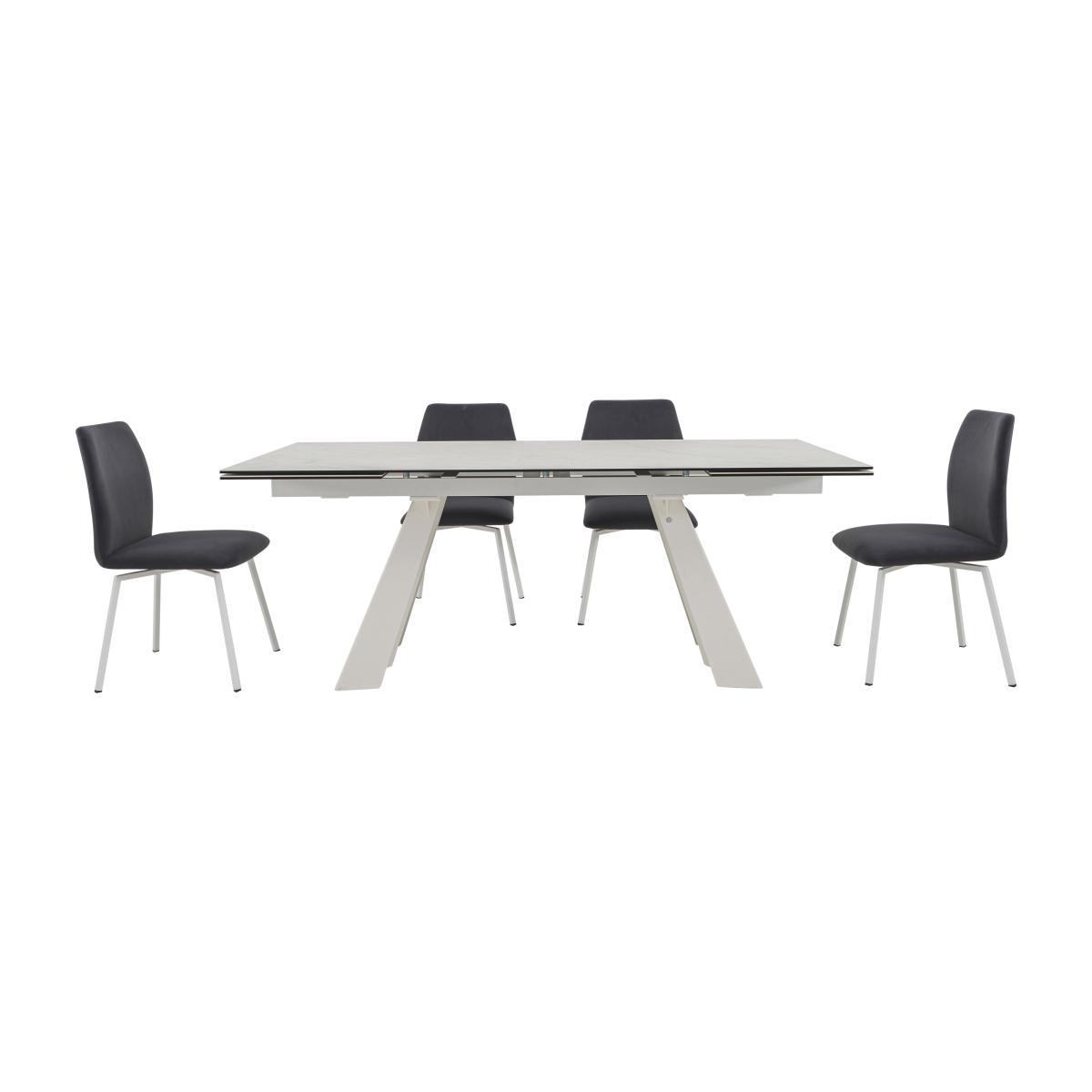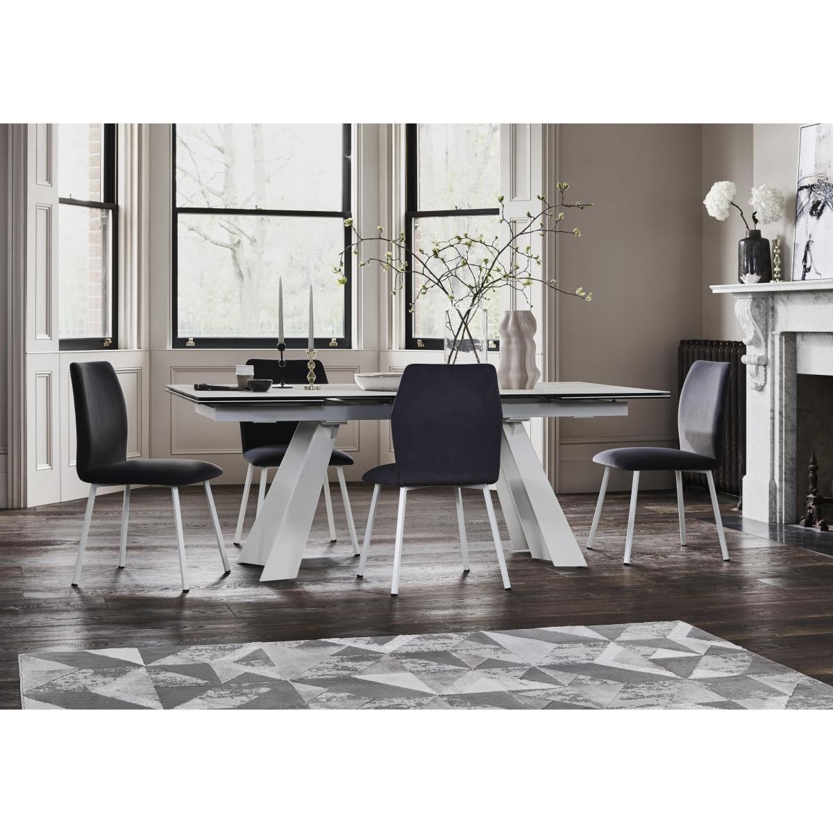 Calligaris Wings takes Italian designed dining luxury to new heights. Discover extending ceramic and glass topped dining tables on a striking metal base. In a choice of contemporary finishes, including a white Alpine marble effect. The dining table is available in two sizes for seating up to 12, perfect for entertaining a crowd. A sleek, spacious sideboard and fixed or swivel velvet-upholstered dining chairs in a choice of four colours complete this stunning collection. From Calligaris, modern Italian design at its finest. A glass and ceramic topped dining table with four swivel fabric chairs. Luxurious style, at a great value price. Why you'll love it. Stylish contemporary luxury from Calligaris. Ceramic and glass topped extending dining table. In a stunning Alpine marble finish. Modern metal base in white. Table is in a choice of two sizes, seating 8-10 or 10-12. Ceramic is beautiful, hardwearing and easy to care for. With 4 swivel fabric dining chairs in a choice of exclusive shades. What you need to know. Matt optic metal table base and chair legs. Table has 2 easy extension leaves, pattern matched to the table top, one at each end. Leaves slide smoothly under the table when not in use. Ceramic-glass is made by coupling one ceramic plate (porcelain tile) to tempered floating glass. It is very hygienic as it does not absorb liquids or release harmful substances. Ceramic is highly durable, heat and scratch resistant. Please note ceramic is not 100% heat-proof. We recommend using coasters and placemats at all times. Easy to care for, simply wipe with a clean damp cloth. Table’s finish is uniform and as shown. The table base is folded metal sheet, which is strong and sturdy. The chairs’ velvet upholstery is 100% polyester, easy care microfibre. Be sure to tighten table base and chair legs every 3 to 4 months. Part of the high-end Calligaris Wings dining range.