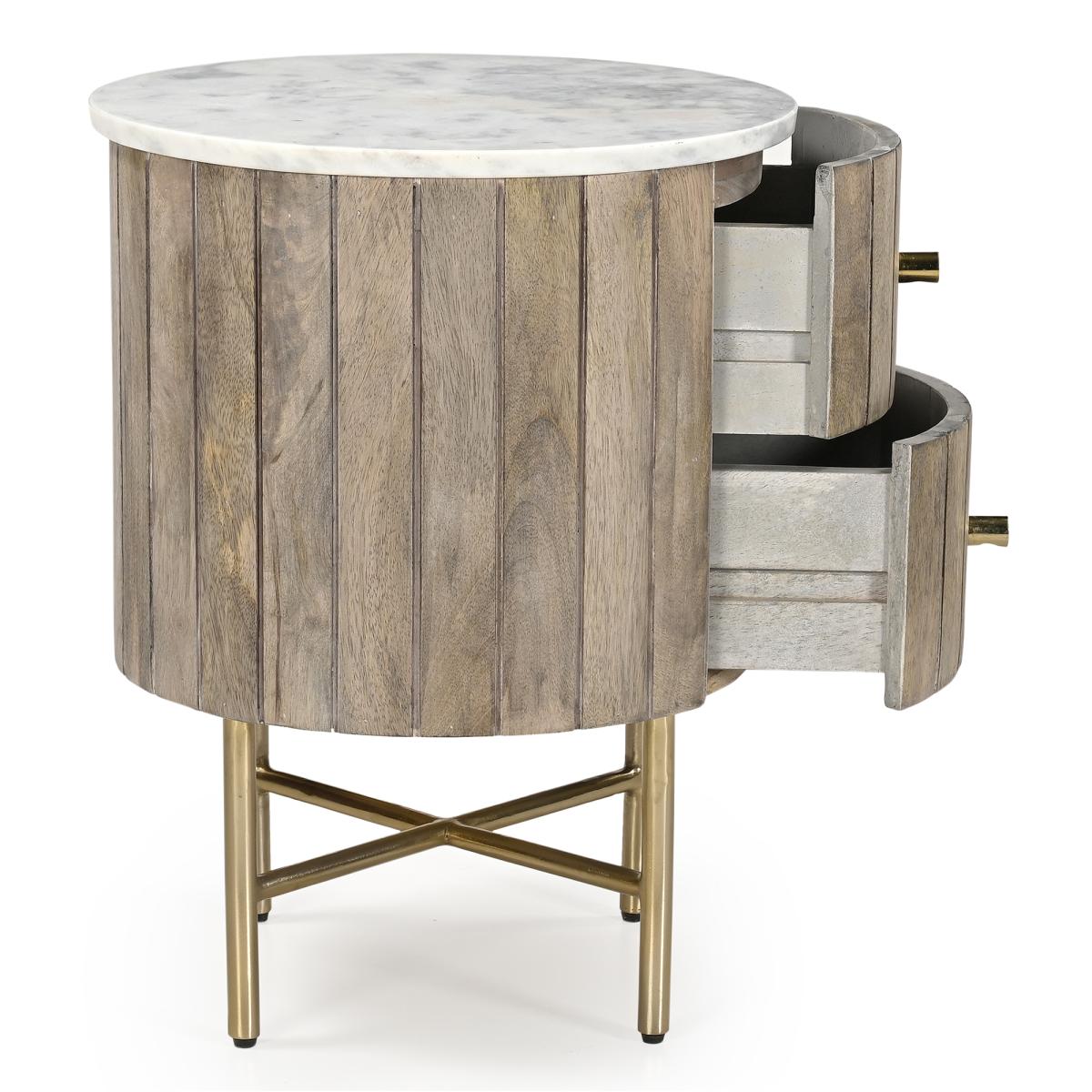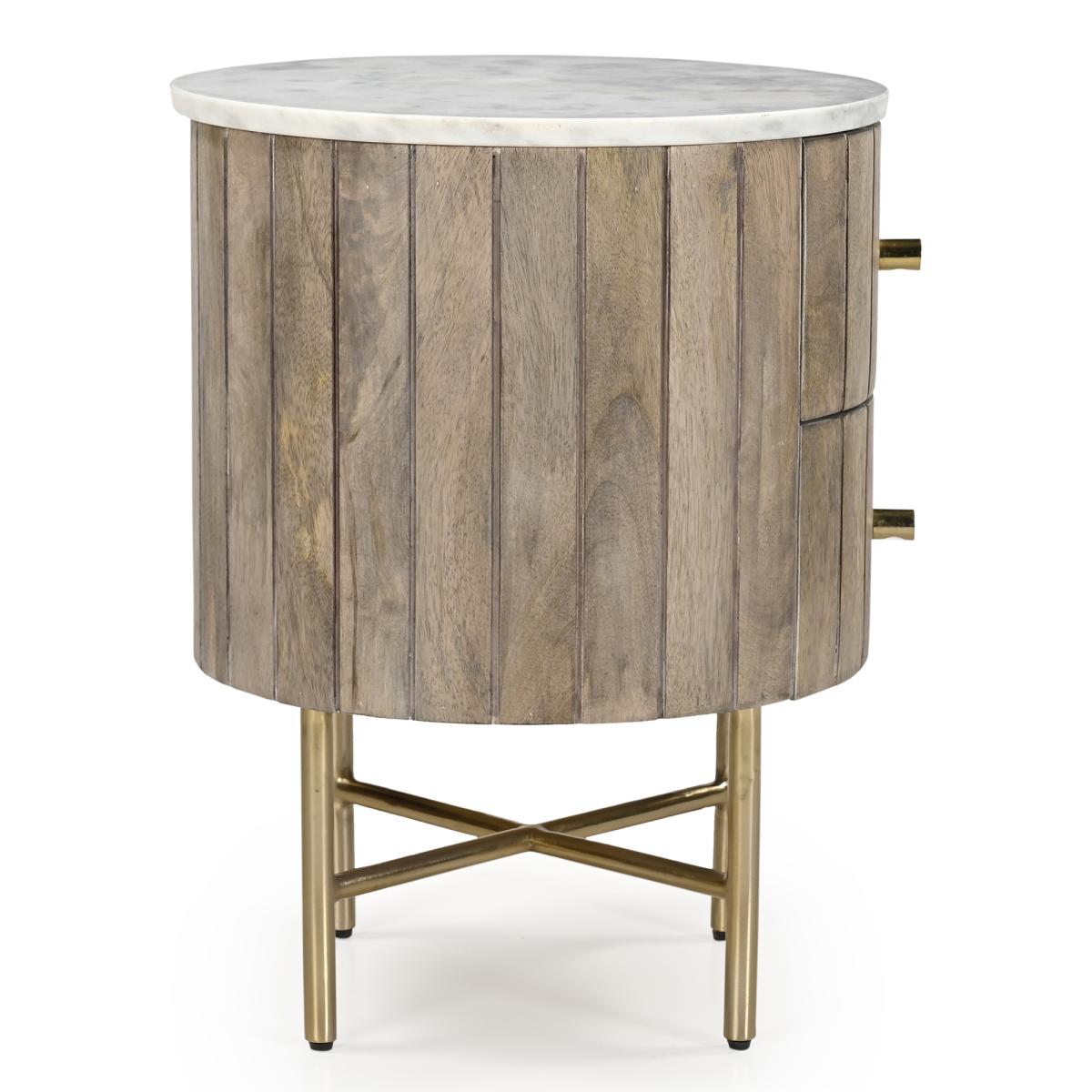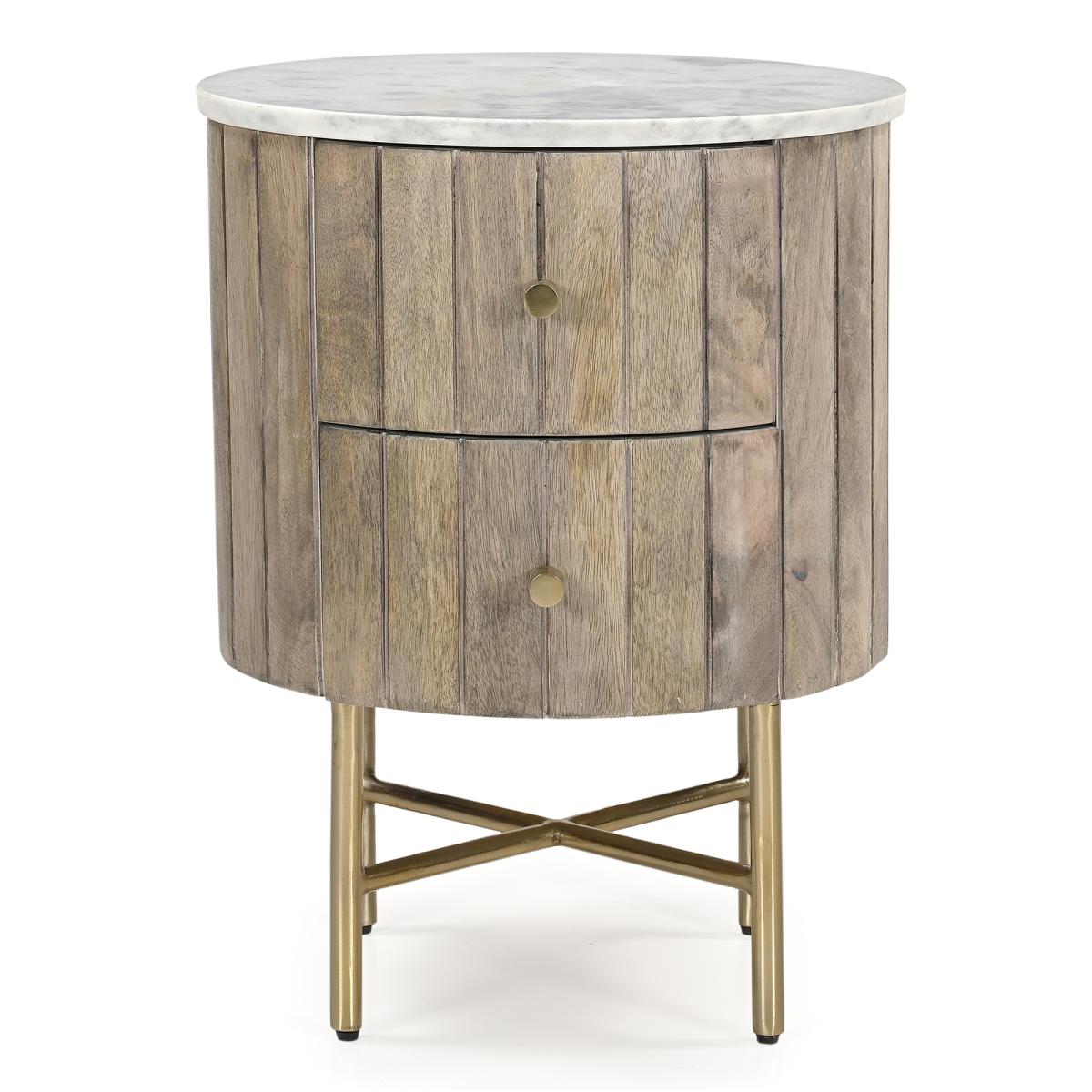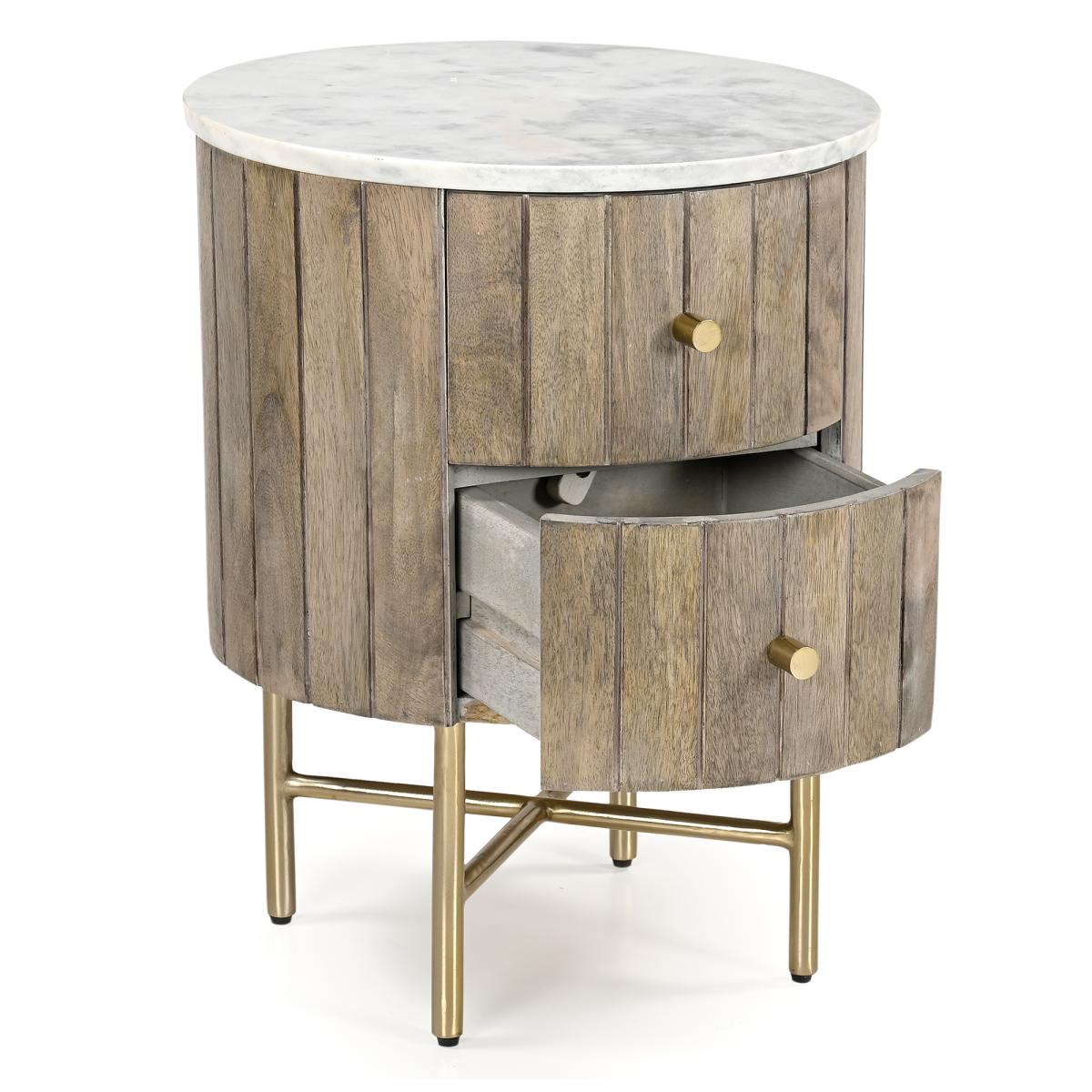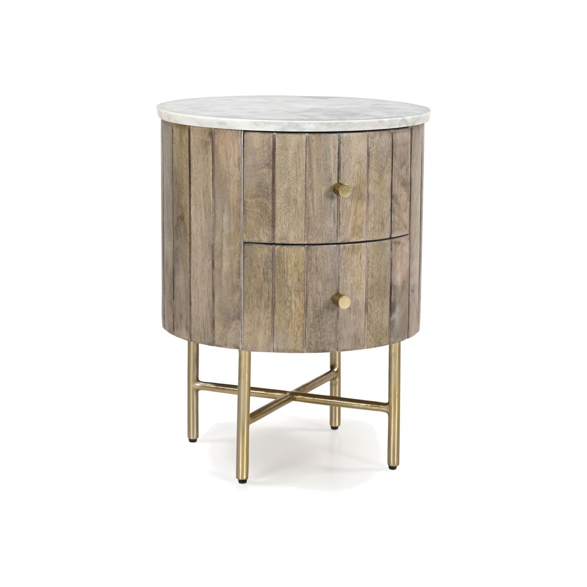 The Calliope Side Table displays a gorgeous grey whitewashed mango wood, displaying a rustic and natural appearance which will work alongside various interior setting styles. The slim brass legs and cross detailing, along with subtle brass circular handles, add to the elegant appearance. The gorgeous white marble tabletop is the perfect finishing touch, enhancing the complexity to ensure even a small piece of furniture creates a large impact.