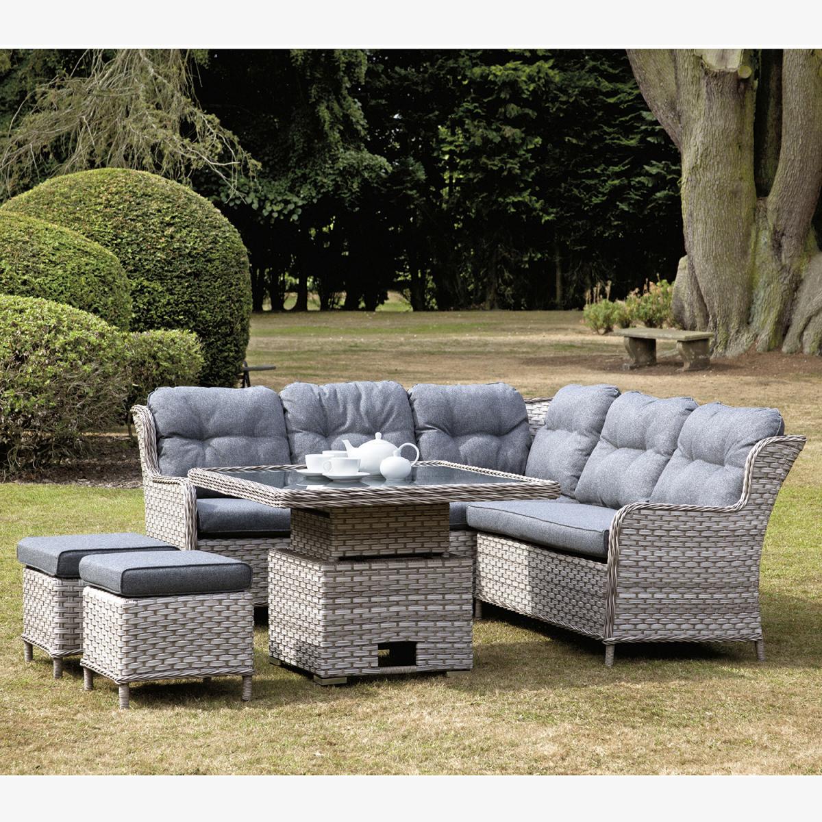 This very comfortable dining/coffee suite is hand-woven in attractive two-tone grey weather-proof rattan, finished around each edge with braided round rattan. It has an adjustable table which can be raised for dining or lowered to coffee table height. The Callisto Rattan Collection comfortably seats seven people and consists of 2 sofas, which placed together form a corner sofa, two stools all with deep cushions and an adjustable table with a matching grey glass top. Made from durable, robust and colourfast materials, the suite is UV & weather-resistant (cushions are not water-proof) and requires little or no maintenance. The smart matching seat cushions have wipe-clean removable covers.