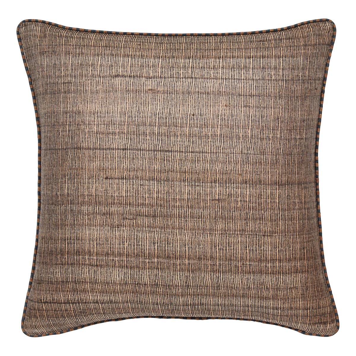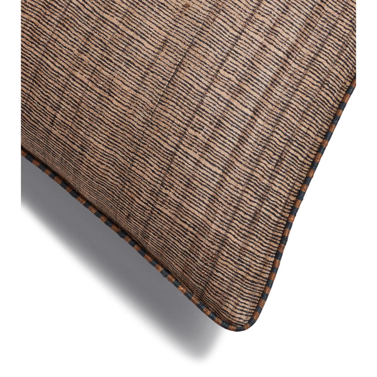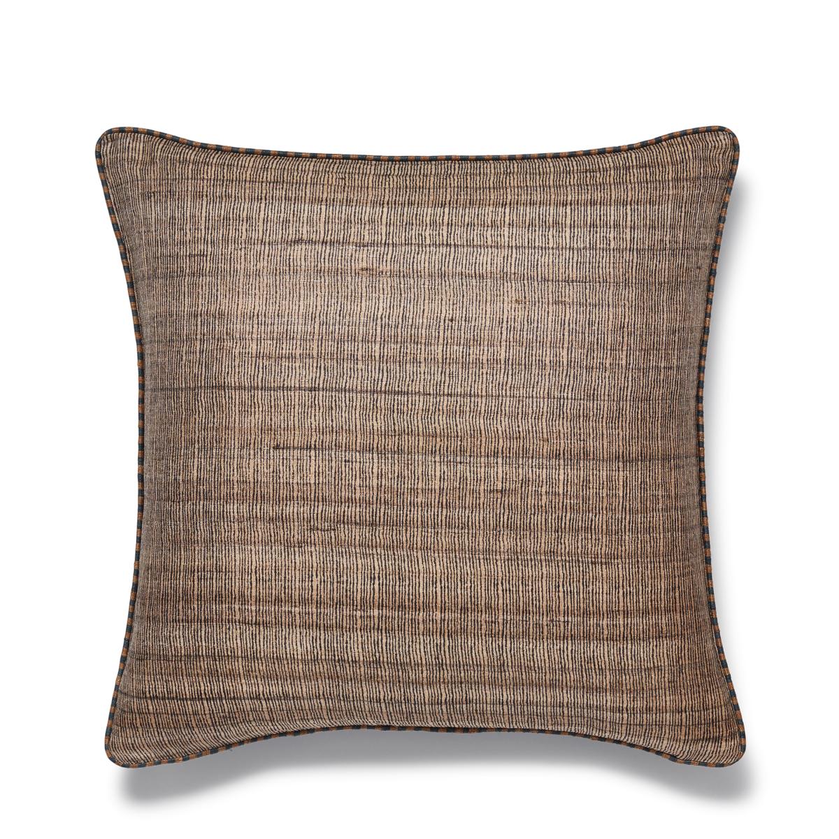 Originally designed for a lampshade, our Callot print, with its appealingly fine stripe, now adorns a cushion. Not too straight, not too precise, the pattern is pleasingly imperfect and artistically subtle. It’s hand block printed in black and gold hues onto the handwoven natural tussar silk base.