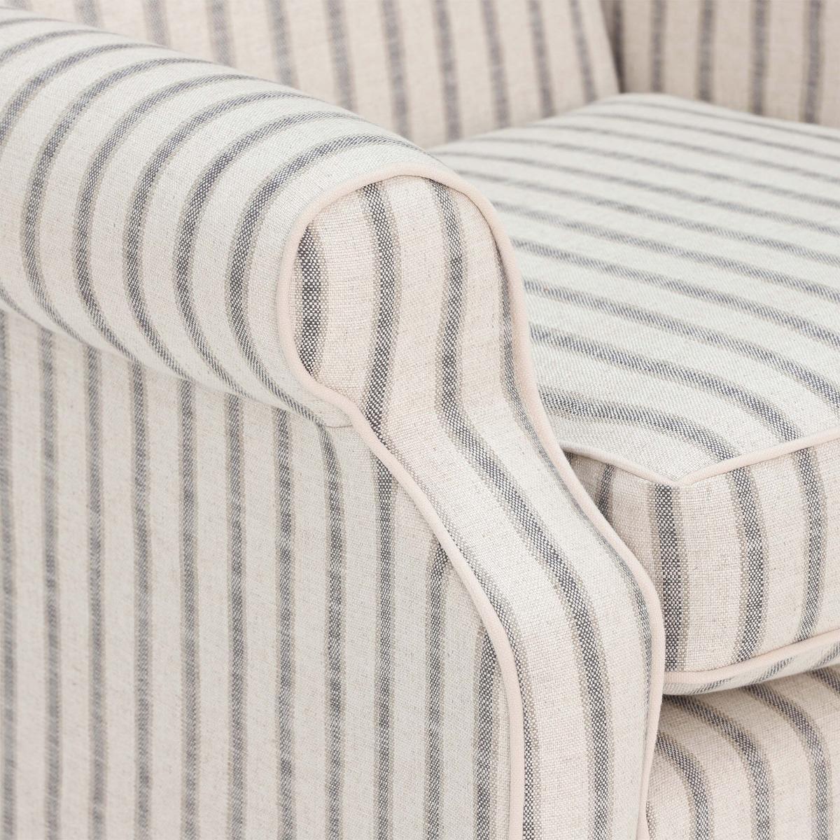 This armchair is a versatile piece that effortlessly adds a classic, cosy feel to a variety of interiors. I love how the stri ped fabric strikes a balance between traditional charm and modern appeal, making it suitable for both period properties and contemporary scheme. It works particularly well in living rooms or bedrooms where you want a comfortable, stylish accent. For styling, consider pairing it with neutral or soft-toned cushions to highlight the fabric’s subtle pattern, or layer it with a textured throw for added warmth. Its timeless design makes it adaptable, so it’s ideal for creating inviting reading corners or accent seating in more open-plan spaces.