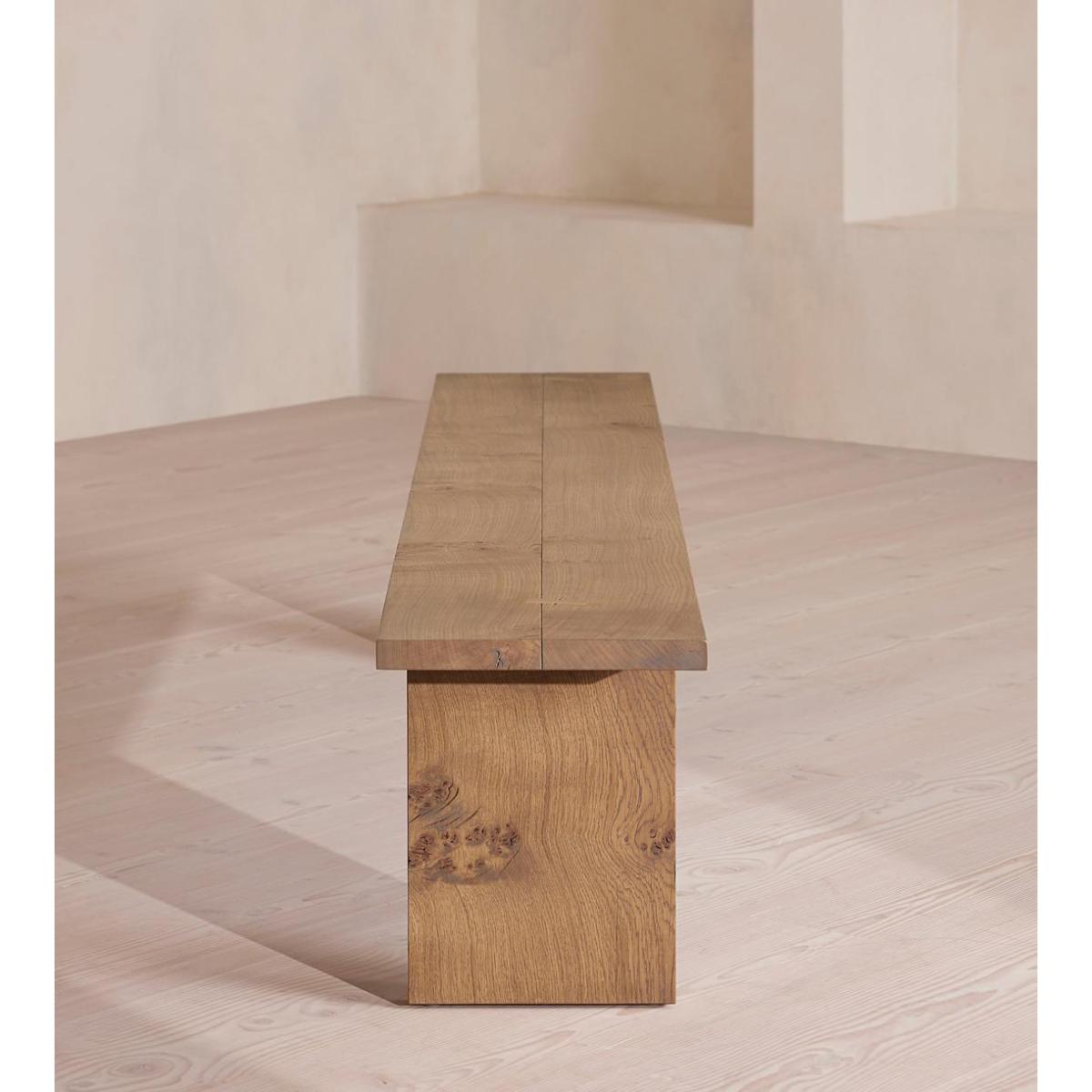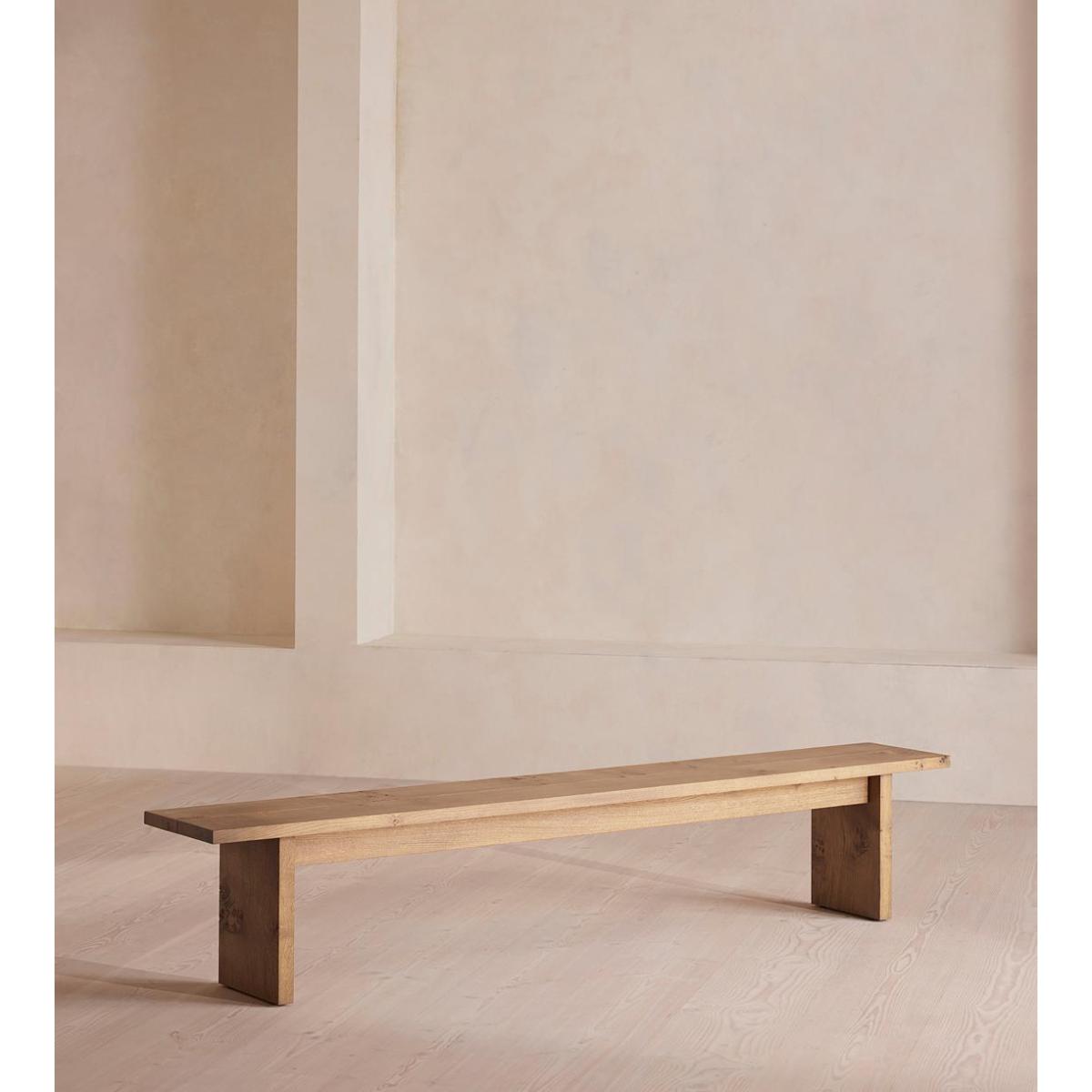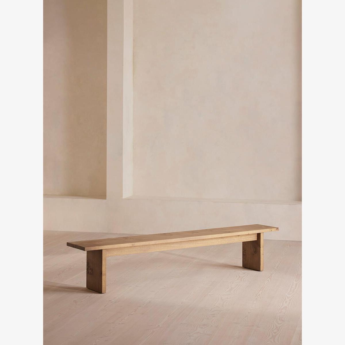 Built to last a lifetime and serve generations to come, the Calne bench is carved from premium British light oak, with a characteristic live edge. The chunky heirloom piece is inspired by biophilic design, a concept that connects people to nature. Visible knots and cracks are featured throughout and considered charming features of natural timber. Pair with the Calne dining table to recreate the rustic settings at Soho Farmhouse. Solid oak wooden bench Made in the UK Crafted from British light oak Characteristic live edge Bow tie detail Visible knots and cracks Each bench is unique due to natural characteristics of timber Available in different sizes and wood stains Inspired by Soho Farmhouse