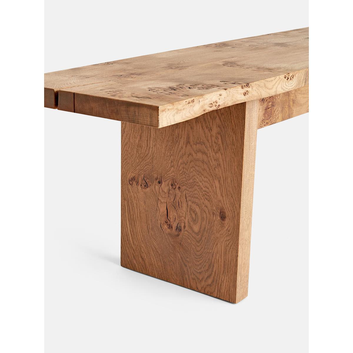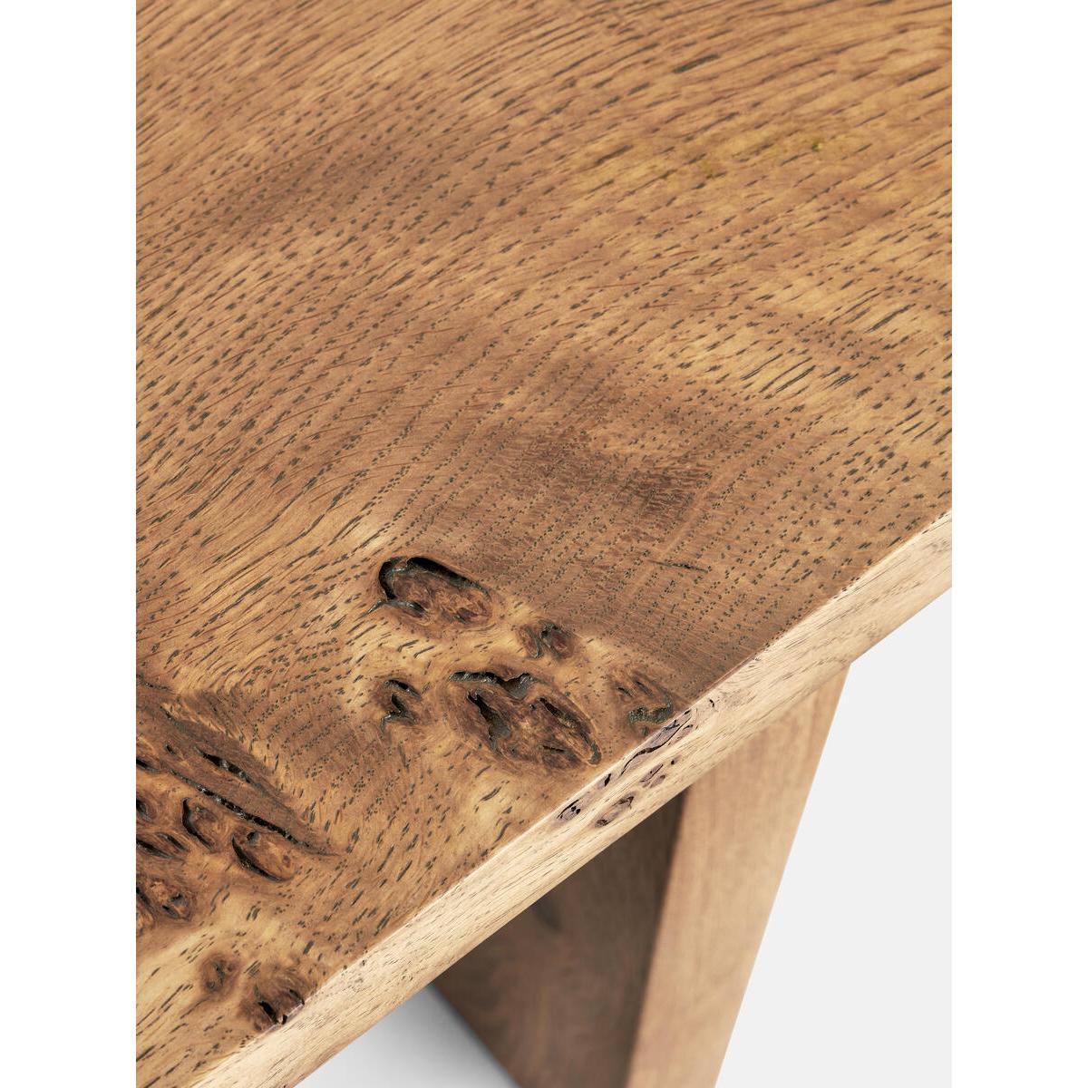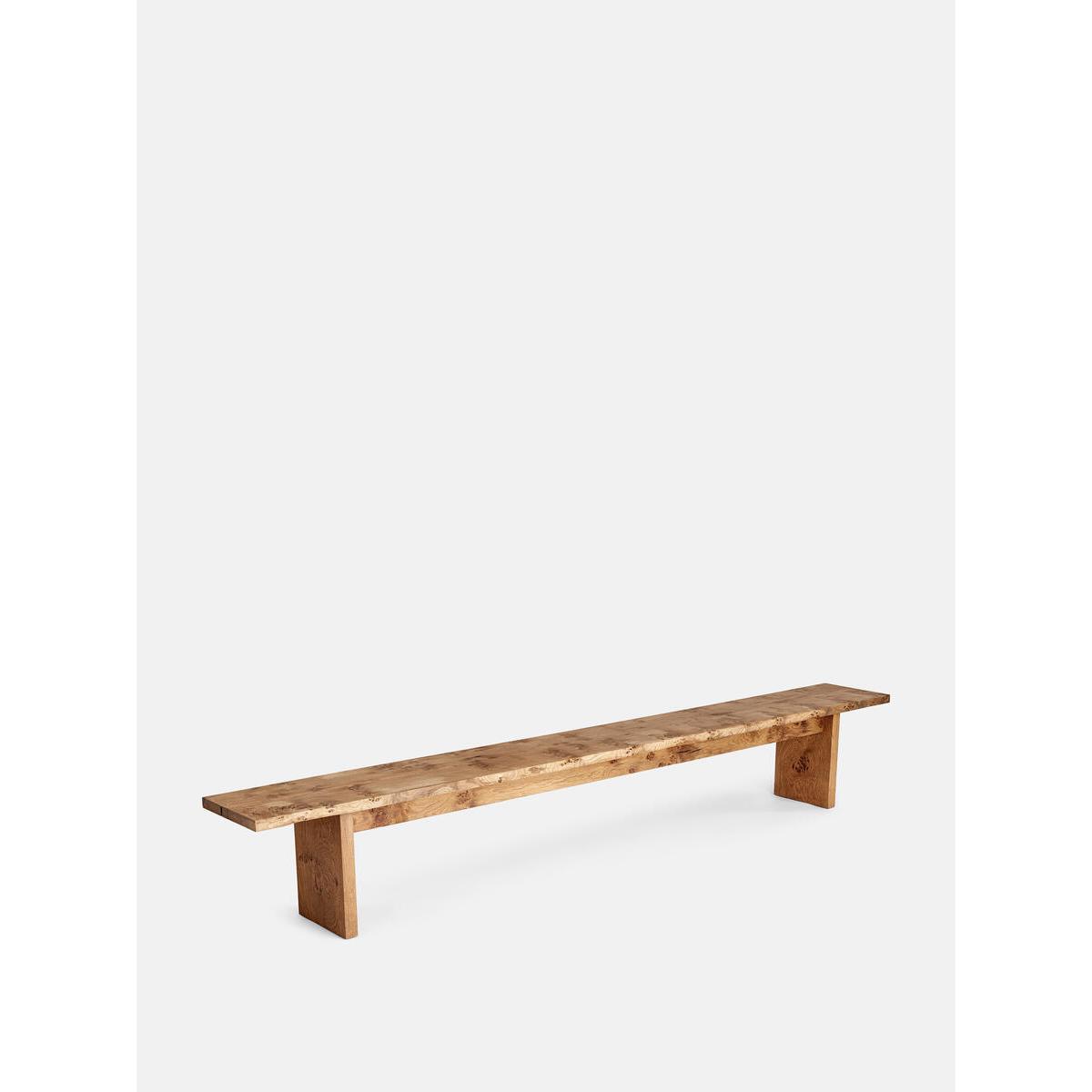 Built to last a lifetime and serve generations to come, the Calnebench is carved from premium British Pippy oak, with acharacteristic live edge. The chunky heirloom piece is inspired bybiophilic design, a concept that connects people to nature. Visibleknots and cracks are featured throughout and considered charmingfeatures of natural timber. Pair with the Calne dining table torecreate the rustic settings at Soho Farmhouse. Solid oak wooden bench. Live edge detail. Bow tie detail. Visible knots and cracks. Each bench is unique due to natural characteristics oftimber. Seats four to five people. Available to order in natural and dark stains. Three sizes: 240cm, 270cm and 300cm. Inspired by Soho Farmhouse. Made to order in Wiltshire, UK.
