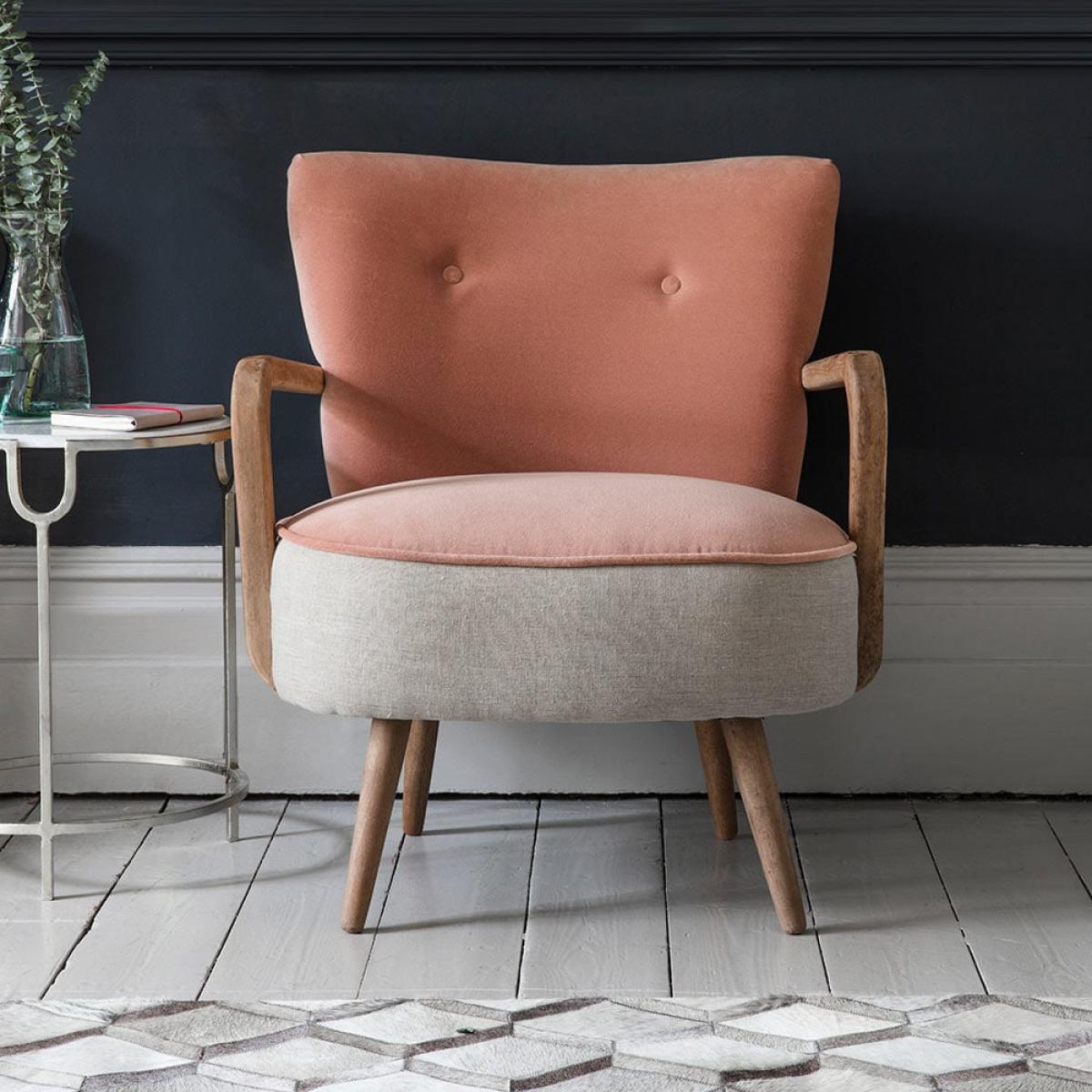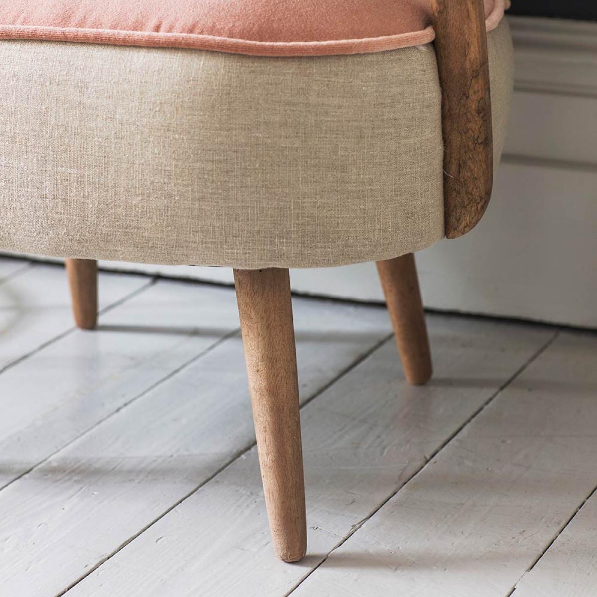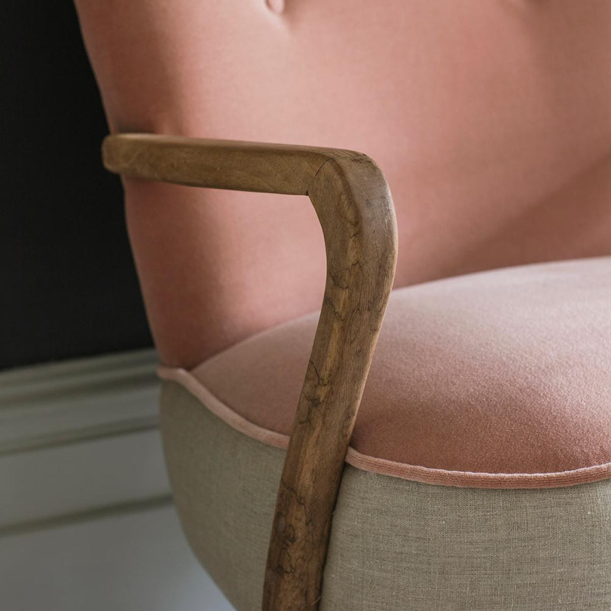 Sit back and relax in the ergonomic comfort of our Calvin chair in champagne pink velvet and linen. This mid-century style design is the ultimate occasional chair, perfect for a cosy reading corner in the living area or bedroom. The champagne velvet offers both comfort and style, with a matching button back and contrasting natural linen base. The sleek wooden handles have an elegant sweeping curve design while the contoured legs are both sturdy and stylish. Suitable for both classic and contemporary interiors, the Calvin Chair will never go out of fashion and is set to be a classic piece.