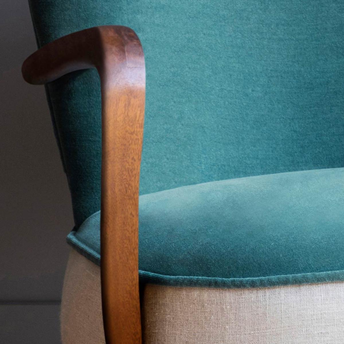 Sit back and relax in the ergonomic comfort of our Calvin Green Armchair, specifically designed for both comfort and style. This mid-century style design is the ultimate occasional chair, perfect for a cosy reading corner in the living area or bedroom. The green velvet chair offers both comfort and style, with a matching button back and contrasting natural linen base. The sleek wooden handles of this green armchair have an elegant sweeping curve design while the contoured legs are both sturdy and stylish. Suitable for both classic and contemporary interiors, the Calvin Green Chair will never go out of fashion and is set to be a classic piece.