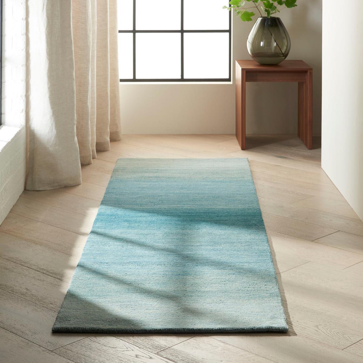 Hand-dyed yarns combine with hard twisted wool to create a subtle striated effect in this Calvin Klein Linear Runner. Hand-loomed of wool with a cotton backing, the colour palette of cool turquoise tones will highlight any room for a more striking floor covering appeal. Don’t forget to buy our anti-slip mat. Here. , available in a choice of sizes. Please note, unfortunately we cannot deliver this item to the Channel Islands.