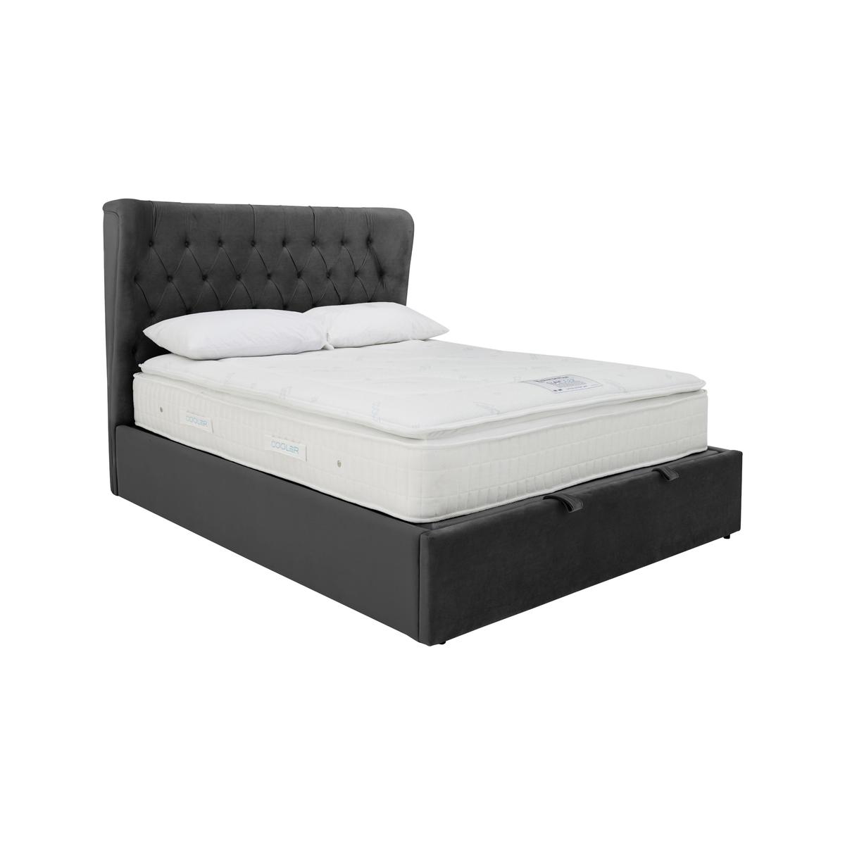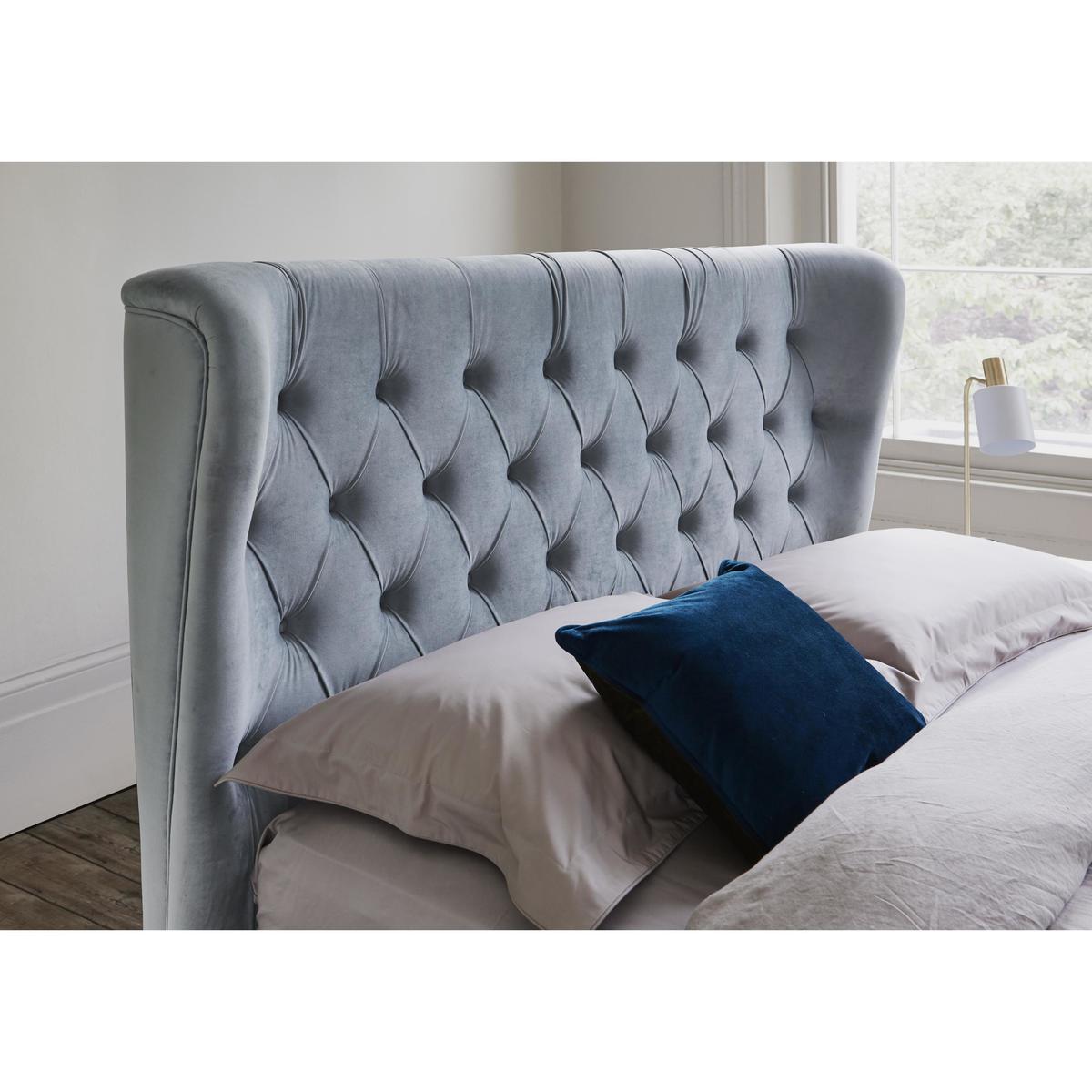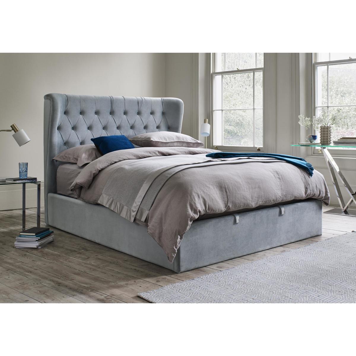 Beautiful winged bed frame with ottoman storage. Available for quick delivery. Great value and only at Furniture Village. Sleek and opulent, the handcrafted Calypso ottoman bed frame can’t help but make an impact – both for its sophisticated style and for its impressive storage capacity. It’s amazing value, too. Opulent in style and sumptuously padded, the high headboard has gently winged sides and beautiful pleating. It’s upholstered in a soft high-quality fabric. The almost weightless gas-lift ottoman base reveals a large storage space that’s perfect for duvets, pillows and other bedding. However, as the base sits on the floor, the storage compartment has no weight limit so you really can use it to store anything you choose. The Calypso ottoman bed frame is offered in three bed sizes – double, king and super king – and accommodates any standard type of mattress on its sturdy ottoman base. Only at Furniture Village and available for quick delivery. Headboard comes as a single piece. Mattress available separately. Top Tip: The flattening and shading of heavy wear areas on pile fabrics like chenille and velvet is unavoidable. Pile fabrics may be vacuumed lightly using the curtain attachment, and brushed regularly in the direction of the pile with a soft brush.