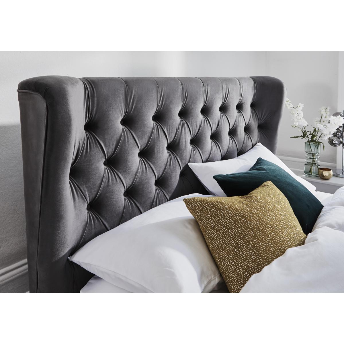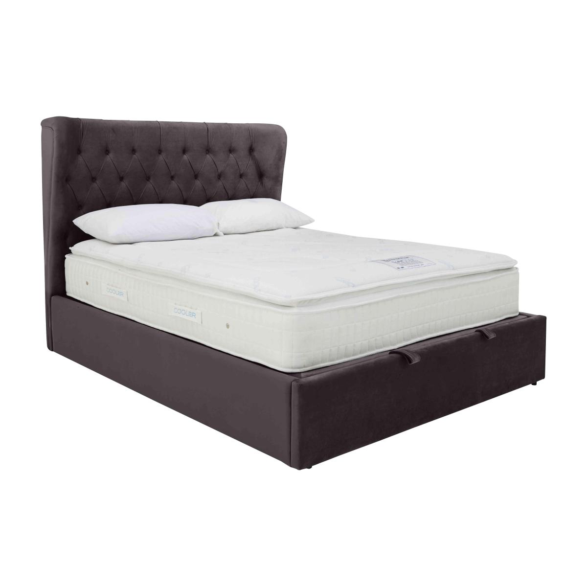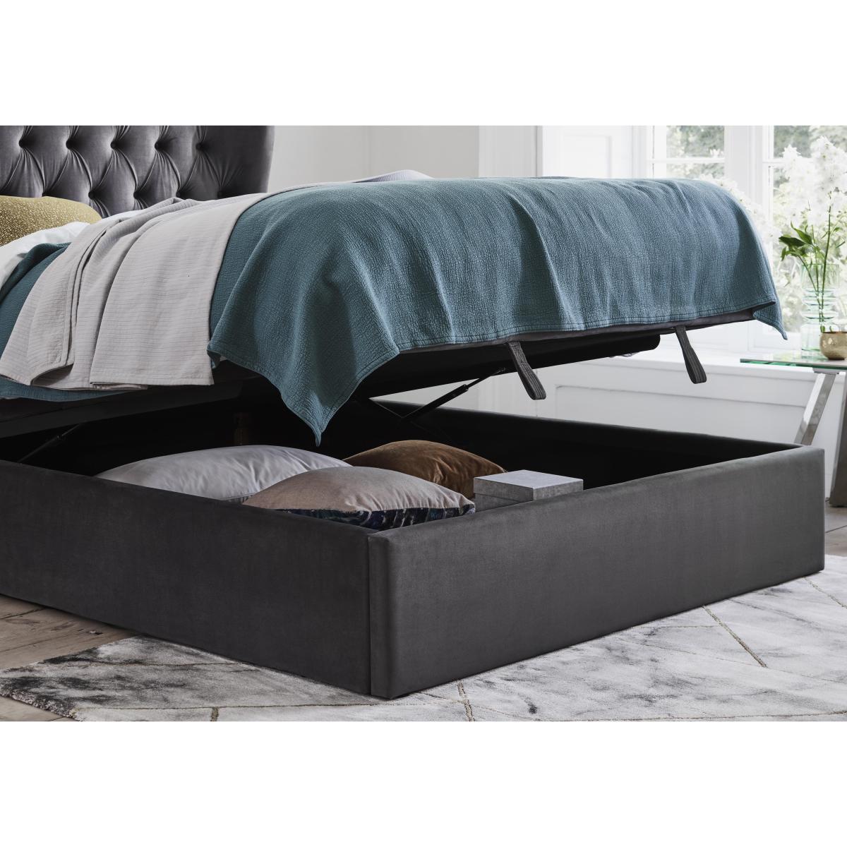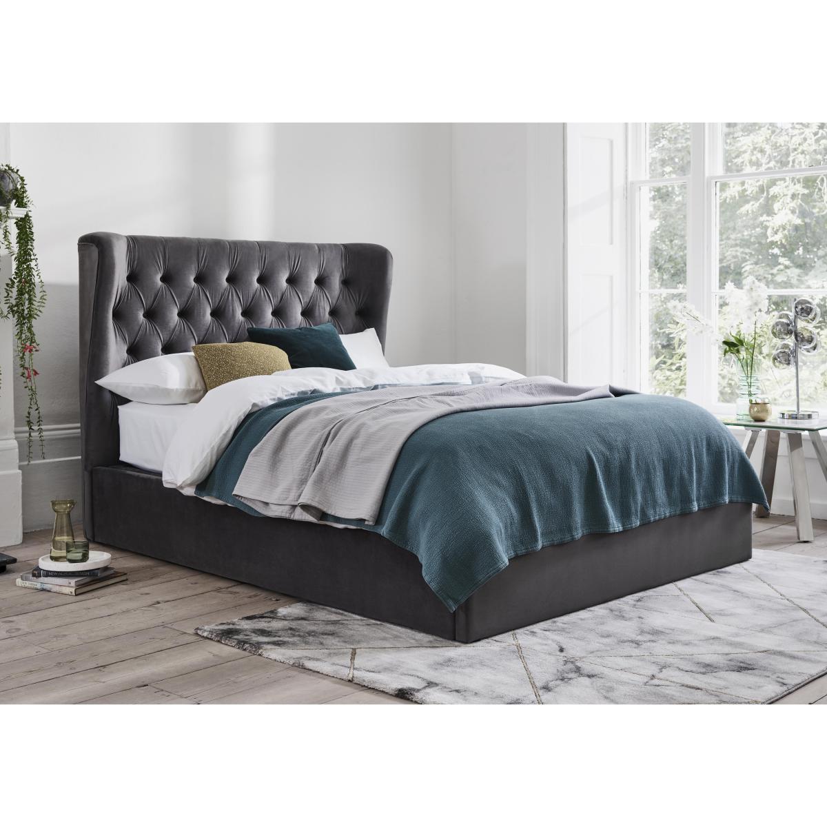 Give your bedroom more than a touch of luxury with the Calypso range of upholstered bedroom furniture. With its high winged headboard, pleated upholstery and versatile ottoman under bed storage space, the handcrafted Calypso ottoman bed frame combines sumptuous comfort with well-designed practicality. Traditional in style, this bed frame takes modern convenience to a whole new level – the ottoman base has an easy gas-lift mechanism, and there’s no storage weight limit. It’s offered in double, king and super king sizes, and looks even more stylish when paired with the matching Calypso bedside cabinet. The great-value Calypso bedroom range is only available at Furniture Village.. Beautiful winged bed frame with ottoman storage. Available for quick delivery. Great value and only at Furniture VillageSleek and opulent, the handcrafted Calypso ottoman bed frame can’t help but make an impact – both for its sophisticated style and for its impressive storage capacity. It’s amazing value, too. Opulent in style and sumptuously padded, the high headboard has gently winged sides and beautiful pleating. The almost weightless gas-lift ottoman base reveals a large storage space that’s perfect for duvets, pillows and other bedding. However, as the base sits on the floor, the storage compartment has no weight limit so you really can use it to store anything you choose. The Calypso ottoman bed frame is offered in three bed sizes – double, king and super king – and accommodates any standard type of mattress on its sturdy ottoman base. Only at Furniture Village and available for quick delivery. Headboard comes as a single pieceMattress available separatelyTop Tip:The flattening and shading of heavy wear areas on pile fabrics like chenille and velvet is unavoidable. Pile fabrics may be vacuumed lightly using the curtain attachment, and brushed regularly in the direction of the pile with a soft brush..
