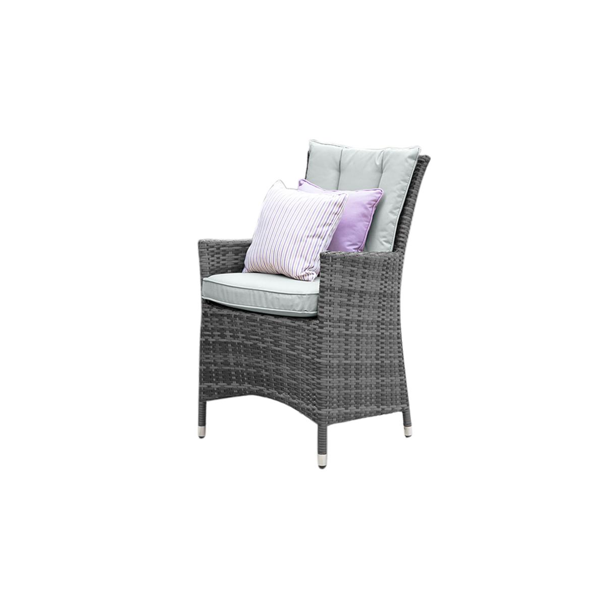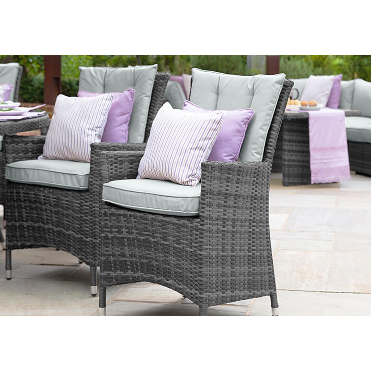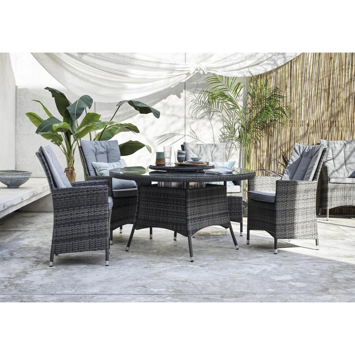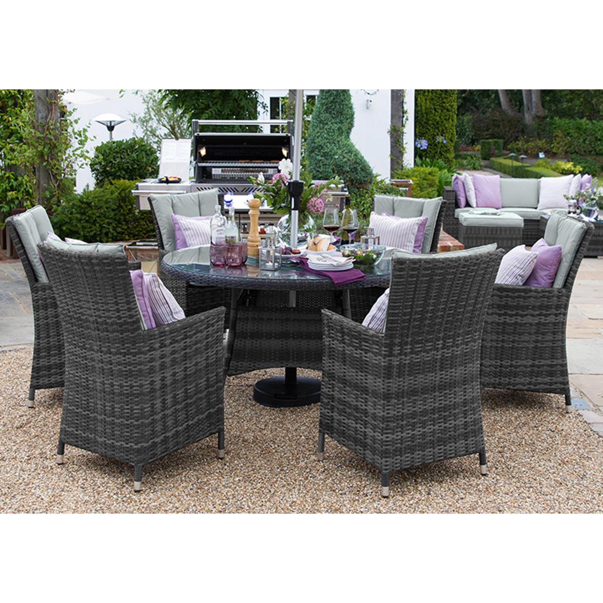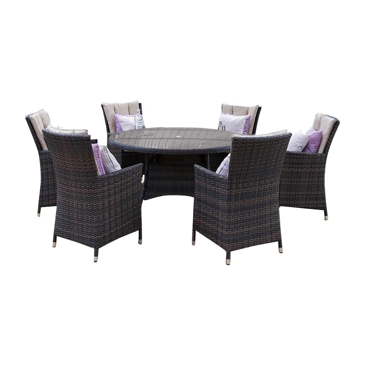 Stylish, completely weather-proof and luxuriously comfortable. Dine outside in real luxury with this gorgeous PE rattan dining set with elegantly high-backed, cushioned chairs. Why you’ll love it. This large dining set seats eight in high-backed, cushioned comfort. 100% weather-proof, high quality PE rattan. Contemporary style in soft grey or natural brown. Chairs have beautifully curved backs. Sink into the deep and sumptuous seat and back cushions. The round dining table has a tempered glass top with parasol hole. Easy to maintain and clean. Light yet strong aluminium frames. Shower-proof cushions. 5-year manufacturer’s warranty. What you need to know. Powder-coated aluminium frames are rust and weather-proof. 100% PE rattan is durable and very hard wearing. UV stabilised and fade-proof, it can withstand weather, strong sunlight and temperature changes. Unlike cheaper alternatives, it will not crack or fade. Dining set seats six. Round dining table is topped with strong 5mm tempered safety glass. Parasols are available to buy separately. This garden furniture can be left outside all year long, excluding the cushions. The cushions are shower-proof and should as a rule be stored when not being used, and in bad weather. Foam with fibre cushion fillings. Zipped cushion covers can be machine washed up to 30 °C. Clean with water and a soft cloth. Avoid abrasive cloths or chemical cleaners. If your furniture is exposed to the salt of coastal winds we advise regular wiping down and covering of the furniture in winter and in stormy weather.