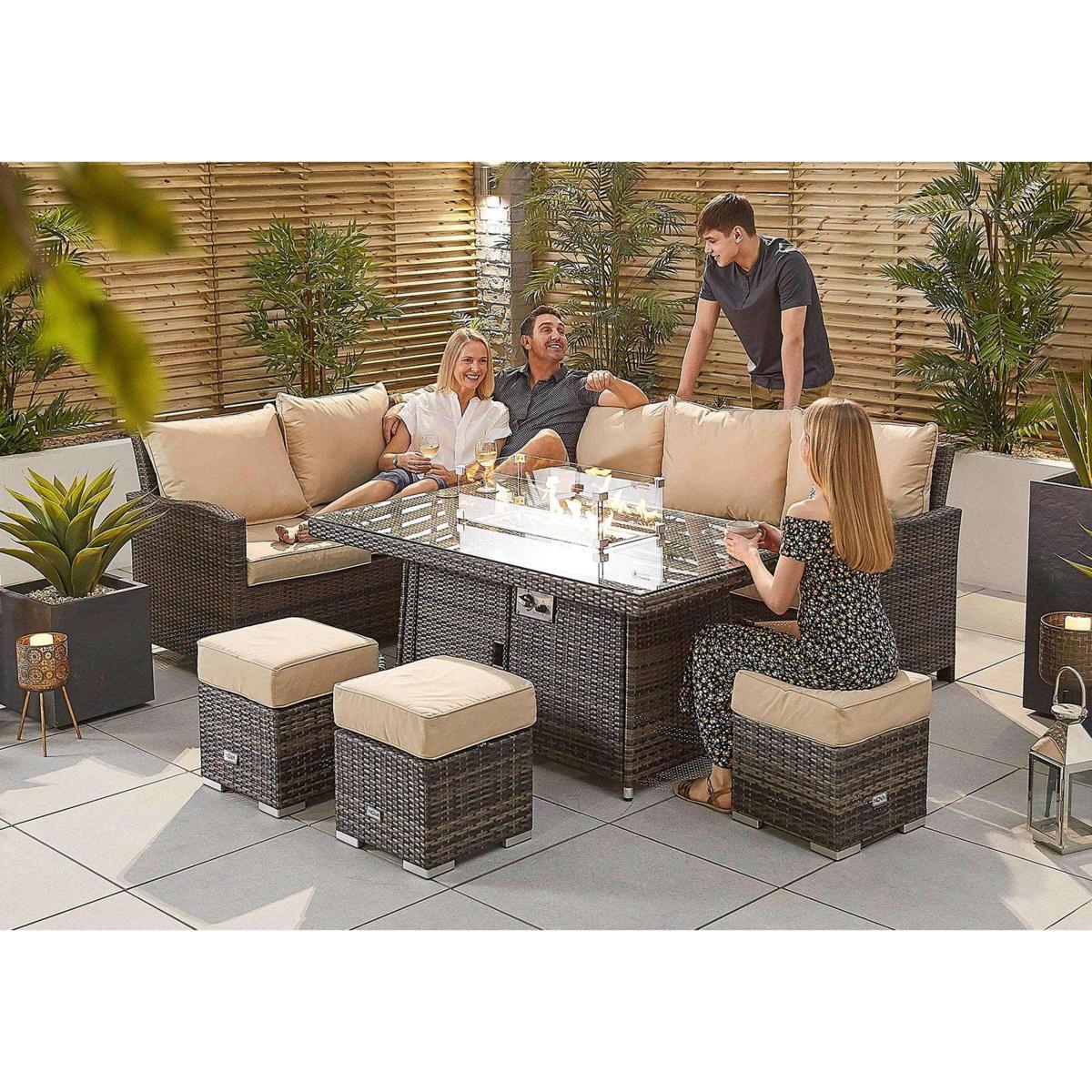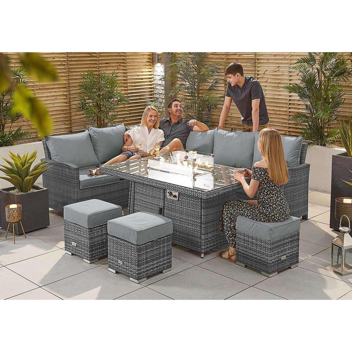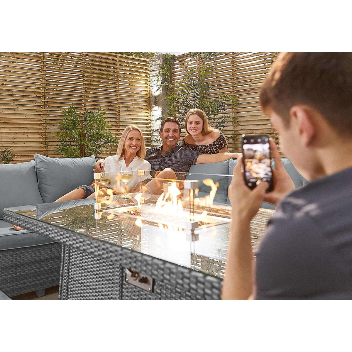 Lounge, dine and entertain in real comfort with the added bonus of a fire-pit dining table, giving light and warmth in the evenings. In 100% weather-proof PE rattan. 5-year warranty. Why you’ll love it. Dine outside by firelight, in cushioned comfort. In high quality PE rattan in grey or brown. Roomy corner sofa, 4 footstools and dining table. Dining table has an inbuilt fire-pit with wind-guard. Beautiful glass filled fire-pit gives heat and light in the evenings. This garden furniture is easy to maintain and clean. Light yet strong aluminium frames. Comfy, shower-proof cushions. 5-year manufacturer’s warranty. What you need to know. Powder-coated aluminium frames are rust and weather-proof. 100% PE rattan is durable and very hard wearing. UV stabilised and fade-proof, it can withstand weather, strong sunlight and temperature changes. Unlike cheaper alternatives, it will not crack or fade. Left hand facing corner sofa and 4 footstools, which can be used as extra seating. Dining table topped with strong 5mm tempered safety glass. The gas-powered fire-pit has a wind-guard and is filled with attractive crushed glass. It has an easy to use control panel. A standard green 5kg patio propane gas canister will fit inside the table, Please buy separately. The fire-pit system is CE Certified and manufactured using grade 304 stainless steel ensuring it is weather-proof. Cover the fire-pit with metal lid provided to convert to a normal dining table. This garden furniture can be left outside all year long, excluding the cushions. The cushions are shower-proof and should as a rule be stored when not being used, and in bad weather. Foam with fibre cushion fillings. Zipped cushion covers can be machine washed up to 30 °C. Clean with water and a soft cloth. Avoid abrasive cloths or chemical cleaners. If your furniture is exposed to the salt of coastal winds we advise regular wiping down and covering of the furniture in winter and in stormy weather. Dimensions. Corner Sofa. Height: 90cm (36 in). Depth: 71cm (29 in). Left Width: 247cm (98 in). Right Width: 191cm (76 in). Small Stool. Height: 43cm (17 in). Depth: 40cm (16 in). Width: 40cm (16 in). Fire Pit table. Height: 70cm (28 in). Depth: 90cm (36 in). Width: 150cm (60 in).