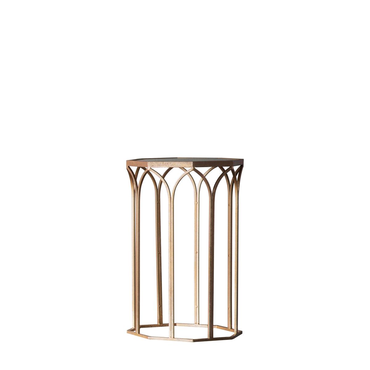 * Octagonal shape* Glass bevelled top* Golden finish This octagonal table features a glass bevelled top in a gold finish, creating a luxurious and sophisticated look. Perfect for any space, the Camber Side Table adds a touch of glamour to your decor. Pair it with the matching side table to create a cohesive and stylish set.