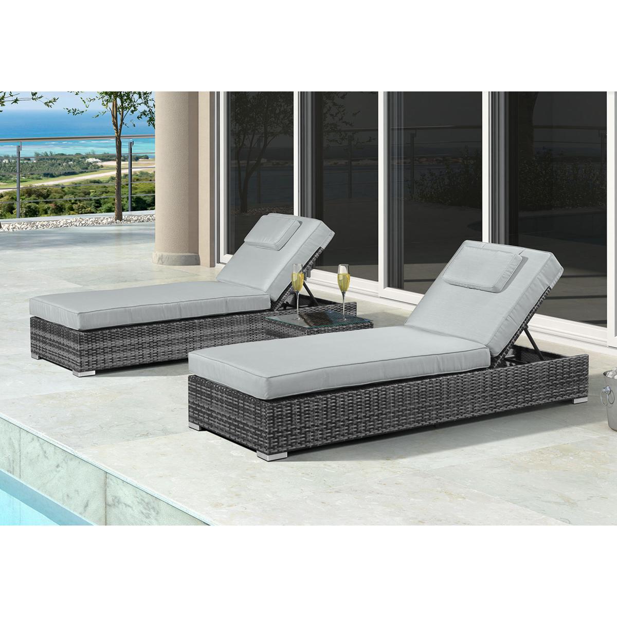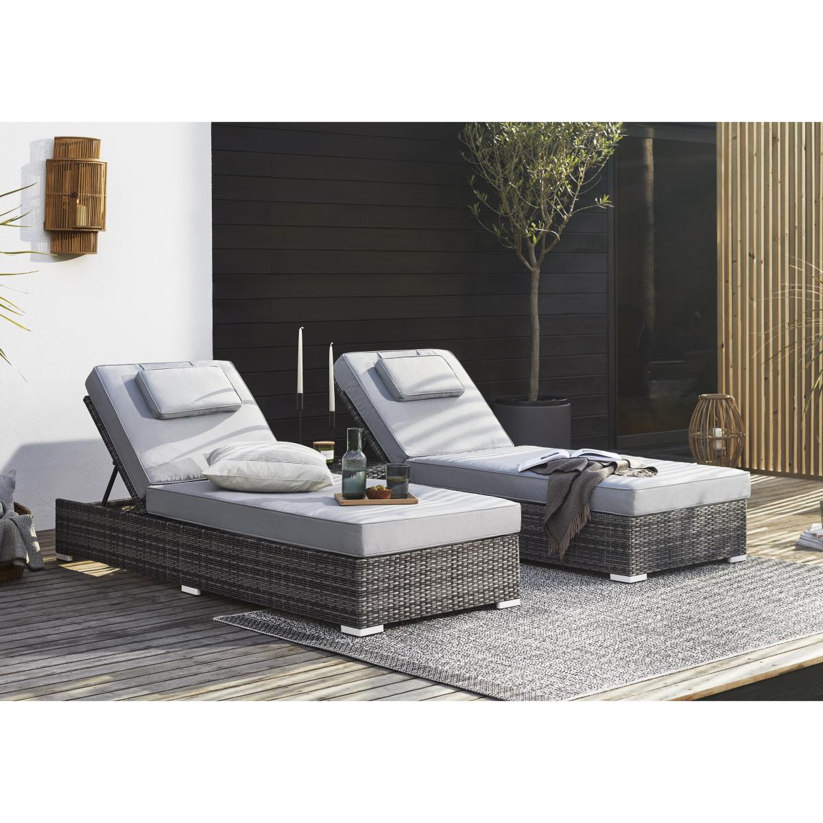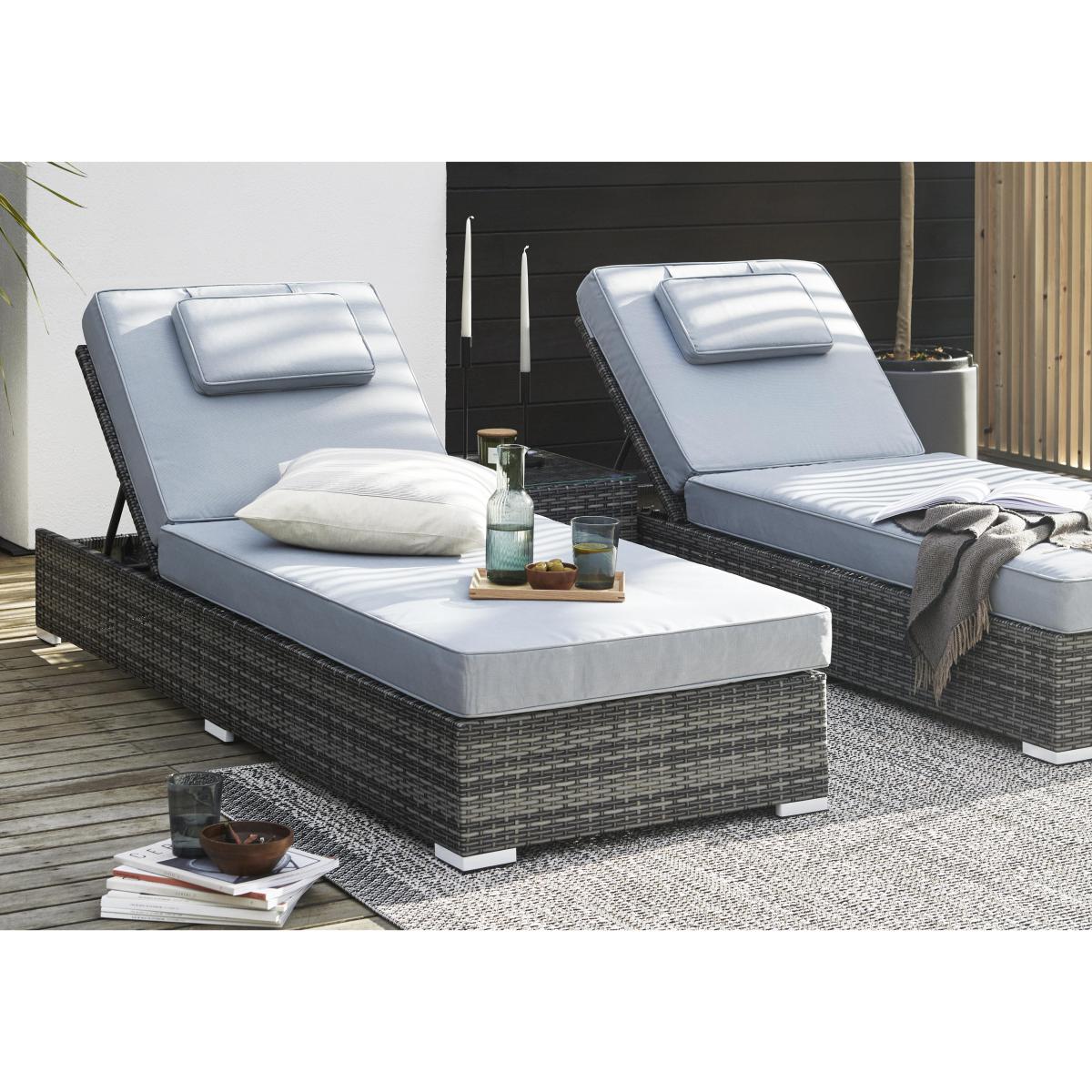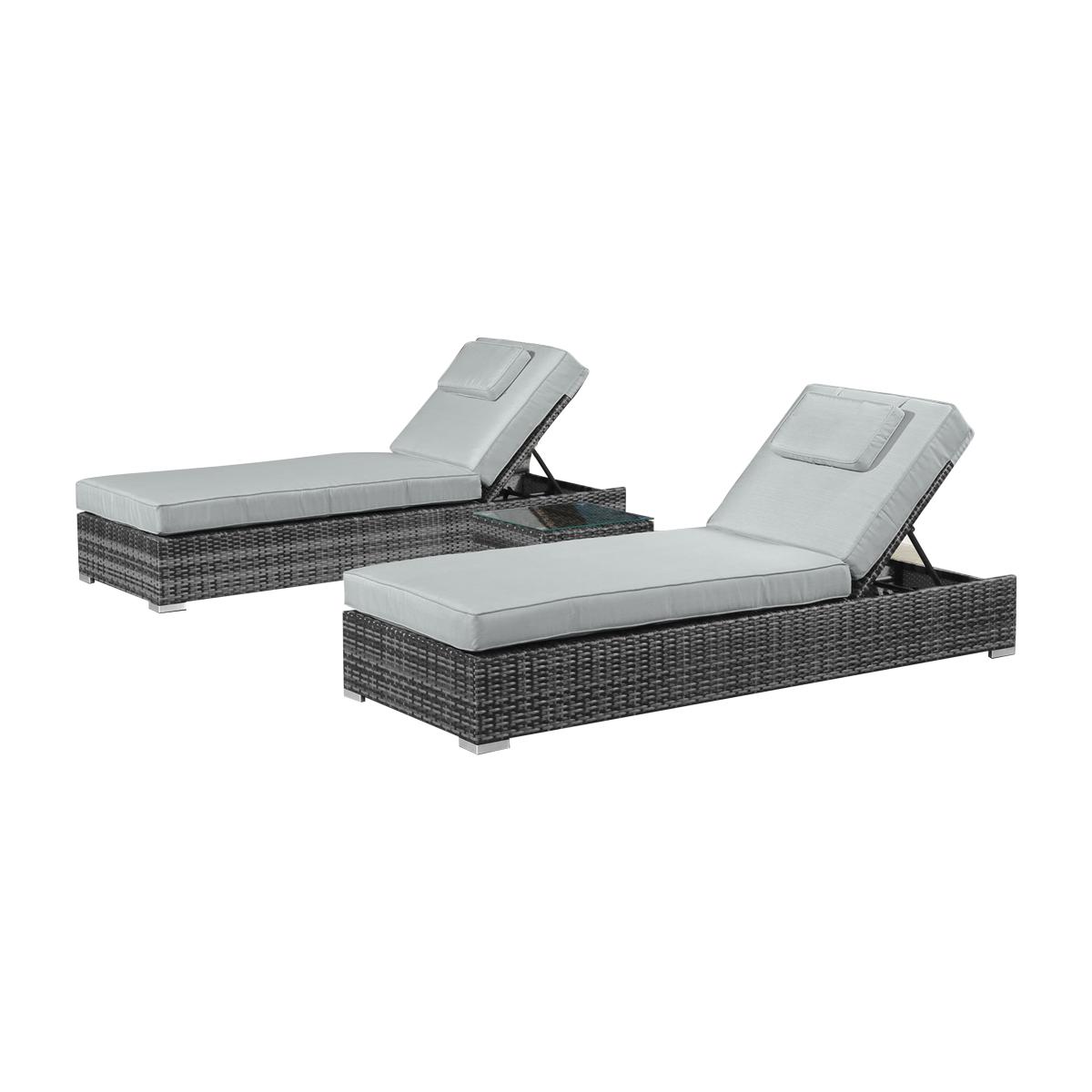 Lounge in luxury with a friend on the patio or by the poolside. This set of two cushioned loungers with a glass topped coffee table is made in grey or brown weather-proof PE rattan. Why you’ll love it. Relax on your patio, lawn or poolside with drinks within easy reach. Loungers and table in textured, high quality PE rattan. In soft grey or natural brown. Adjust to your perfect reclining position. Comfy lounger cushions. Moveable, padded headrests. The small coffee table has a tempered glass top. Light yet strong aluminium frames. Shower-proof cushions. Rust-proof, 100% weather-proof and made to last, with a 5-year warranty. What you need to know. Powder-coated aluminium frames are rust and weather-proof. 100% PE rattan is durable and very hard wearing. UV stabilised and fade-proof, it can withstand weather, strong sunlight and temperature changes. Unlike cheaper alternatives, it will not crack or fade. Set is made up of two sun loungers with a small coffee table. Coffee table is topped with strong 5mm tempered safety glass. This garden furniture can be left outside all year long, excluding the cushions. The cushions are shower-proof and should as a rule be stored when not being used, and in bad weather. Foam with fibre cushion fillings. Zipped cushion covers can be machine washed up to 30 °C. Clean with water and a soft cloth. Avoid abrasive cloths or chemical cleaners. If your furniture is exposed to the salt of coastal winds we advise regular wiping down and covering of the furniture in winter and in stormy weather.