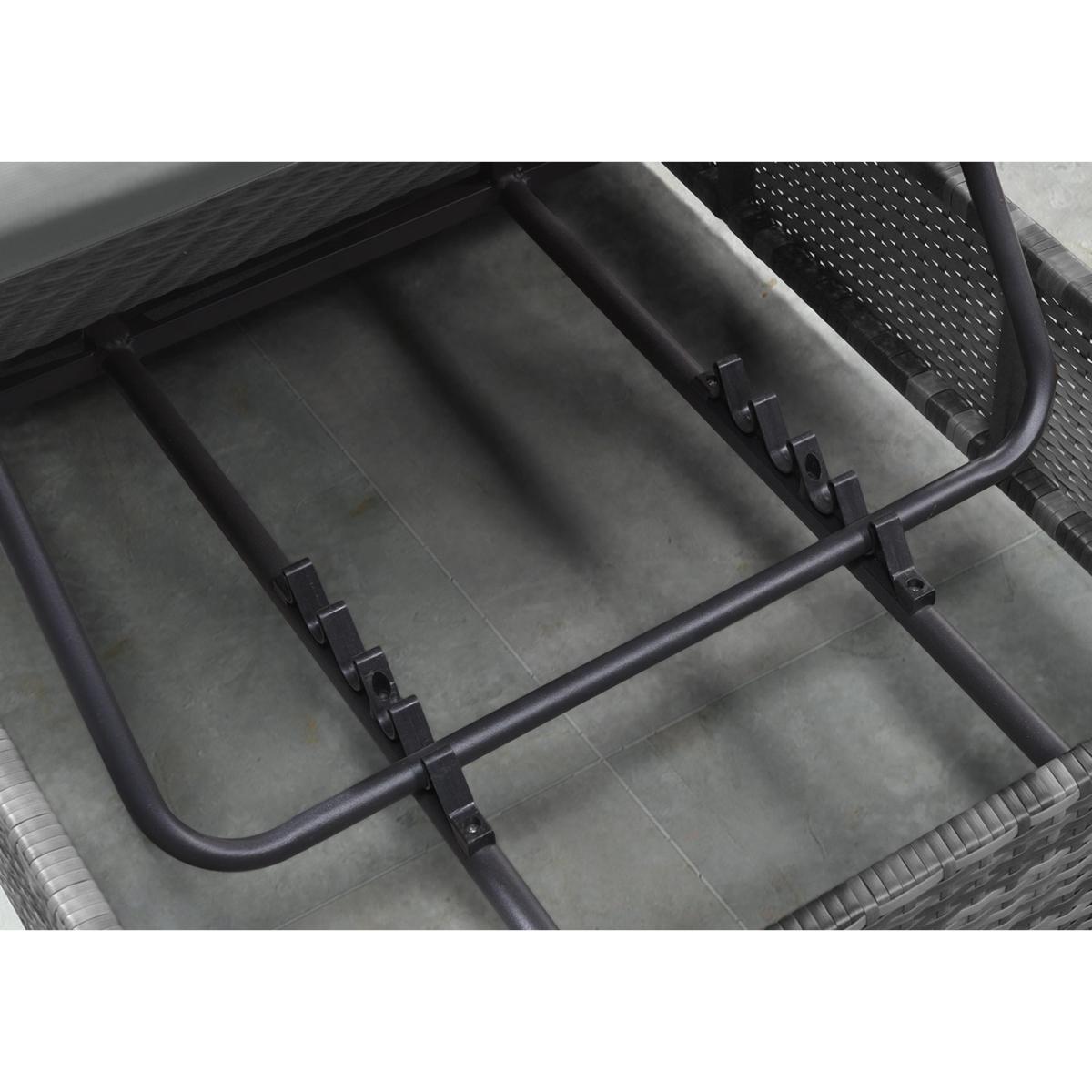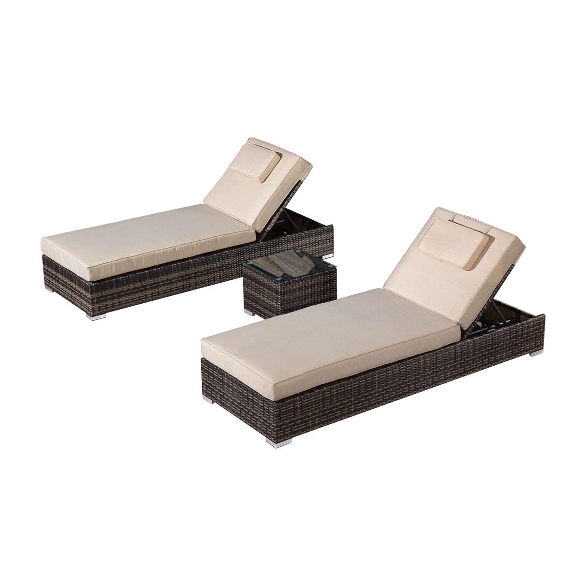 Lounge in luxury with a friend on the patio or by the poolside. This set of two cushioned loungers with a glass topped coffee table is made in grey or brown weather-proof PE rattan. Why you’ll love it. Relax on your patio, lawn or poolside with drinks within easy reach. Loungers and table in textured, high quality PE rattan. In soft grey or natural brown. Adjust to your perfect reclining position. Comfy lounger cushions. Moveable, padded headrests. The small coffee table has a tempered glass top. Light yet strong aluminium frames. Shower-proof cushions. Rust-proof, 100% weather-proof and made to last, with a 5-year warranty. What you need to know. Powder-coated aluminium frames are rust and weather-proof. 100% PE rattan is durable and very hard wearing. UV stabilised and fade-proof, it can withstand weather, strong sunlight and temperature changes. Unlike cheaper alternatives, it will not crack or fade. Set is made up of two sun loungers with a small coffee table. Coffee table is topped with strong 5mm tempered safety glass. This garden furniture can be left outside all year long, excluding the cushions. The cushions are shower-proof and should as a rule be stored when not being used, and in bad weather. Foam with fibre cushion fillings. Zipped cushion covers can be machine washed up to 30 °C. Clean with water and a soft cloth. Avoid abrasive cloths or chemical cleaners. If your furniture is exposed to the salt of coastal winds we advise regular wiping down and covering of the furniture in winter and in stormy weather.