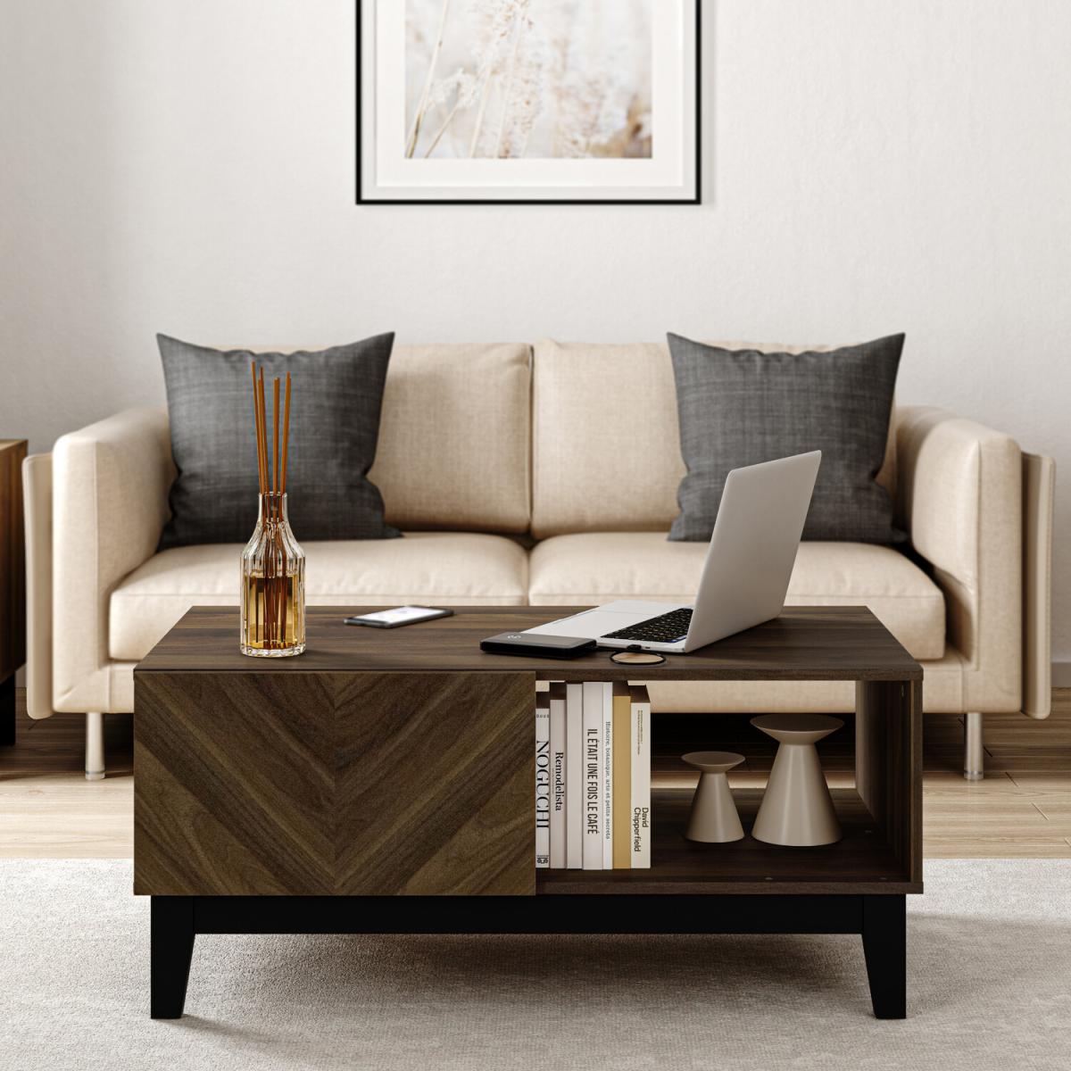 This Camborne Coffee Table perfectly matches your living room with a modern dark finish and contrasting black sleek legs. It's easy to assemble and clean for convenience, adding a sophisticated finishing touch to your living room. The coffee table has plenty of storage space on the shelf, drawer, and tabletop, helping to keep your area organised. The oak finish also makes coordinating with your existing furniture and decor easy.