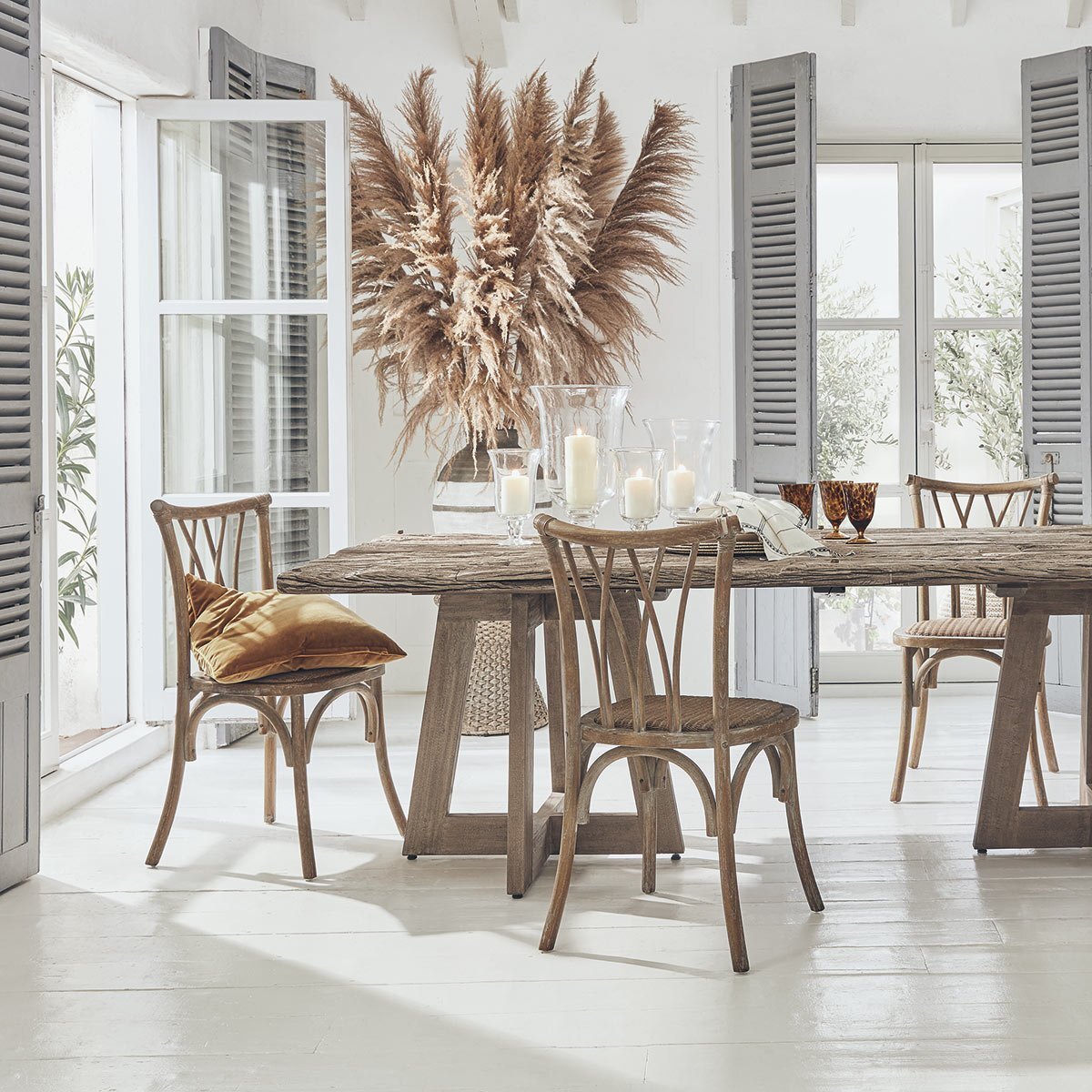 I love this table for its rustic charm and versatile appeal; the aged natural finish makes it ideal for both traditional and modern interiors seeking a lived-in, cosy feel. It works particularly well in open-plan spaces or kitchens that embrace natural textures and raw materials. To style around it, consider pairing with a mix of vintage and contemporary chairs to add visual interest, or keep it simple with understated tableware for a relaxed, family-friendly look. Because of its sturdy, substantial design, it’s perfect for informal gatherings but also adapts well to more dressed-up dining setups, making it a flexible piece for various interior styles.