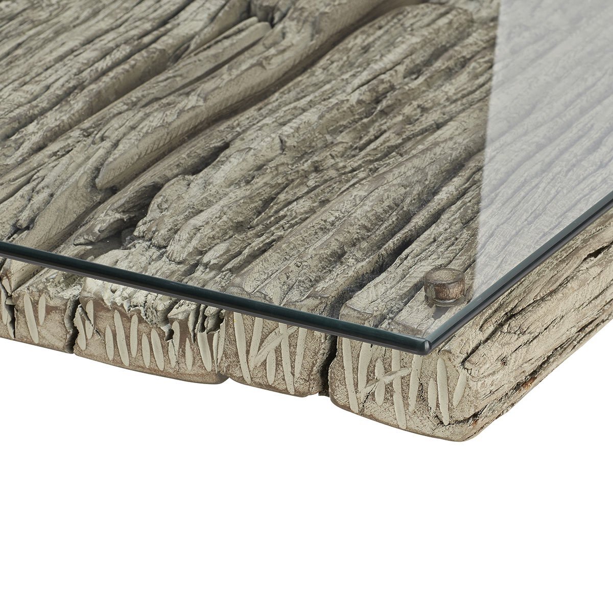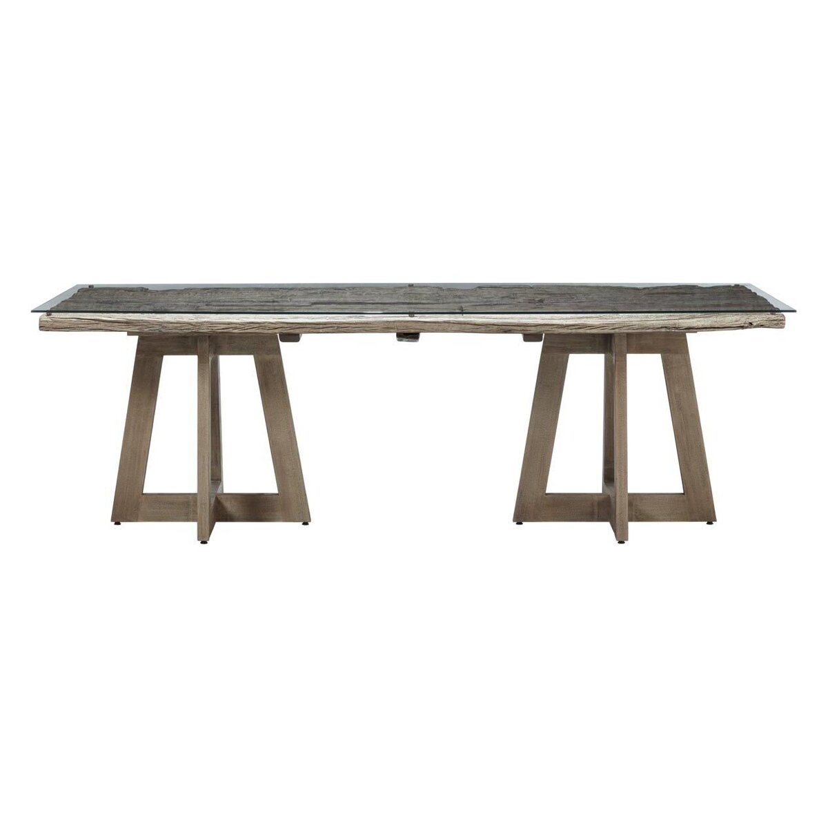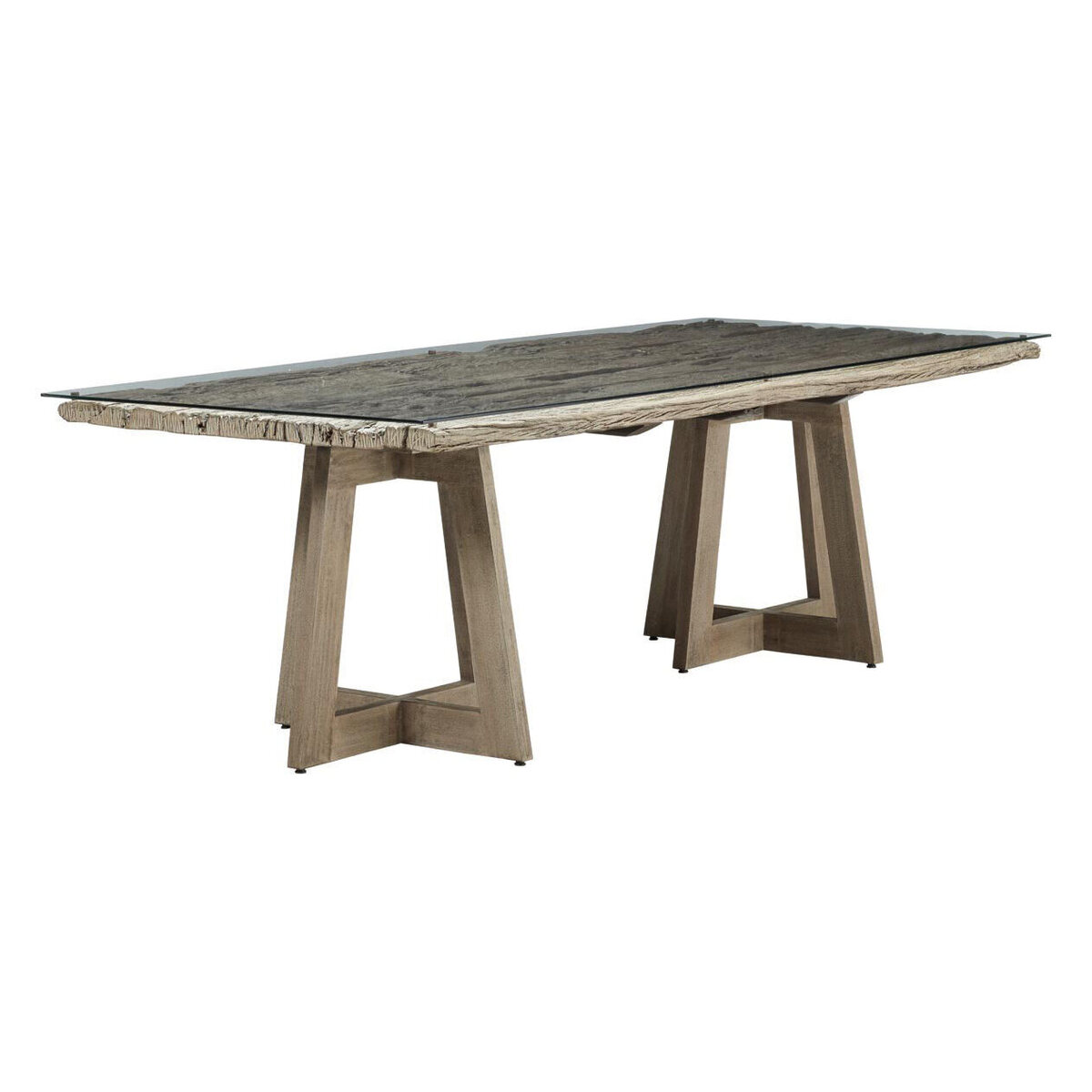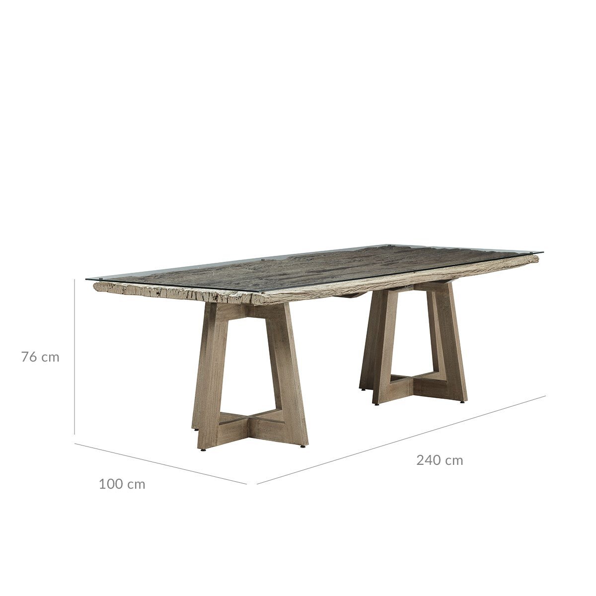 With a glass-covered tabletop handmade from recycled railway sleepers, each Camborne Dining Table is unique. The glass top allows you to admire the naturally weathered wood of the sleepers, while the wooden base and angular legs lend the table a more contemporary edge.