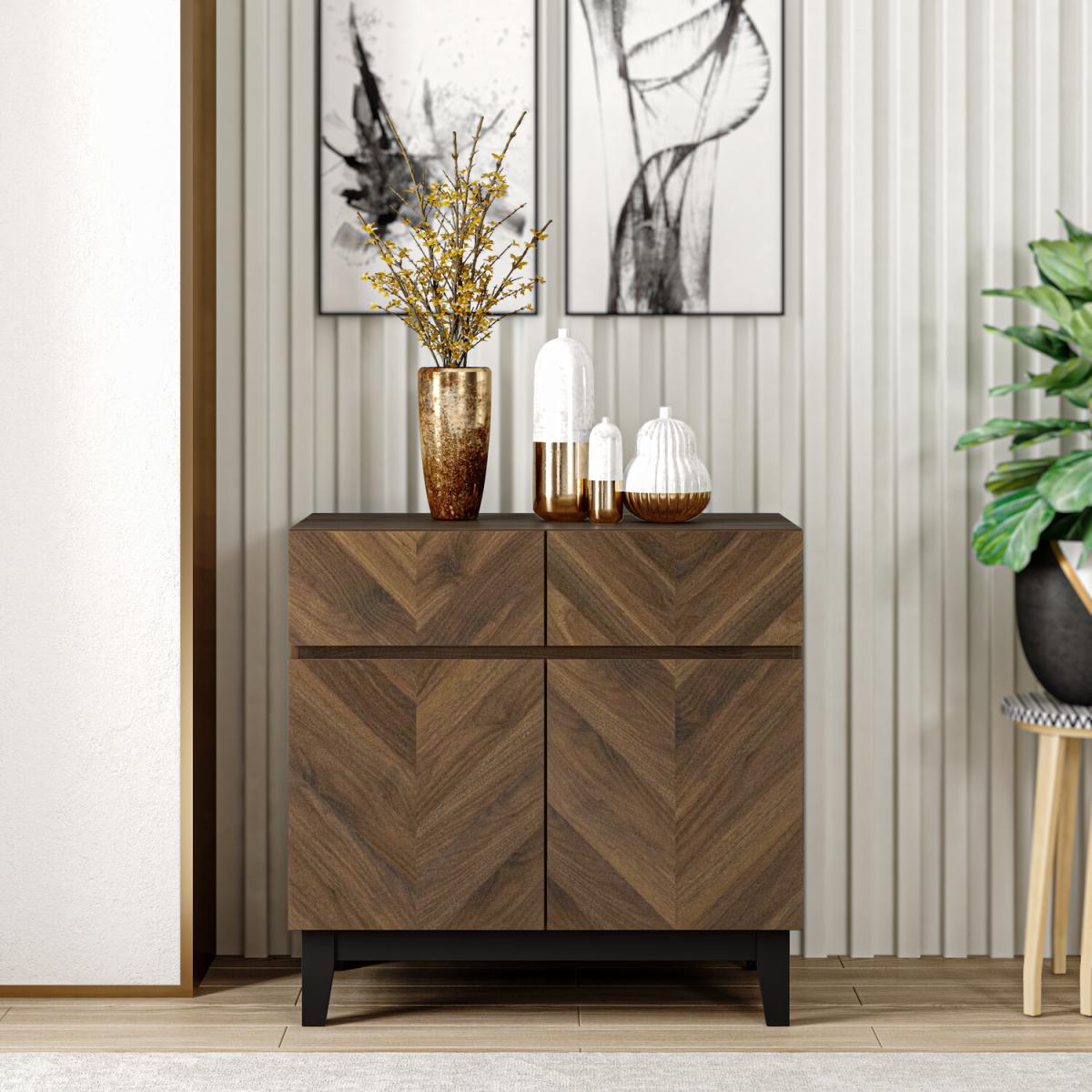 I’m a fan of the Camborne sideboard for its warm chevron veneer and slim black legs, which balance a solid, substantial feel with a light, modern look. It slots neatly into mid-century, Scandinavian or industrial schemes and complements muted wall tones or deeper accent colours like forest green or charcoal. When styling, keep the top simple: group a couple of vases or ceramic vessels of differing heights alongside a small plant or framed print. Inside, use matching baskets or trays to corral smaller items - dinnerware, office supplies or media accessories - so you get both the display and the storage you need without clutter.