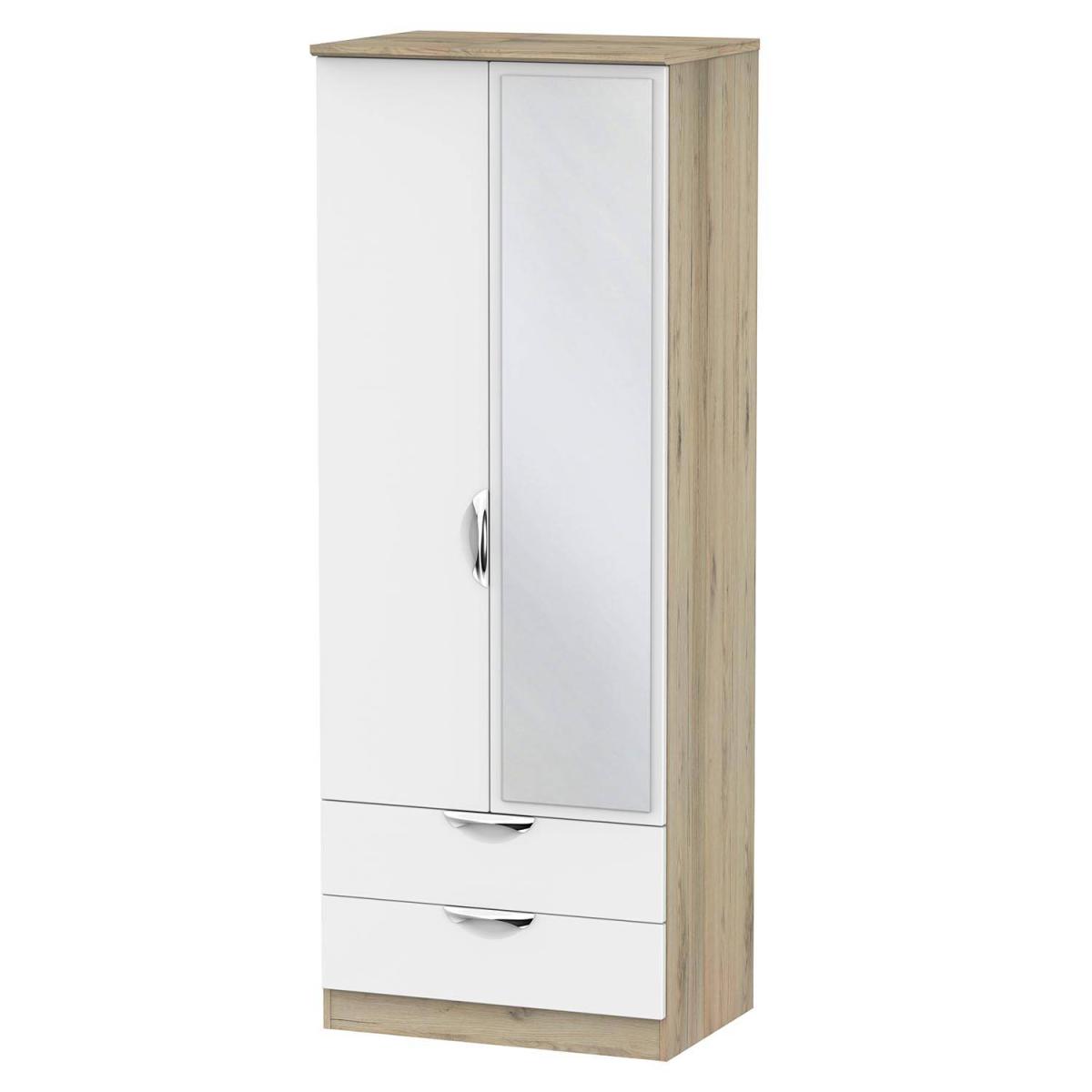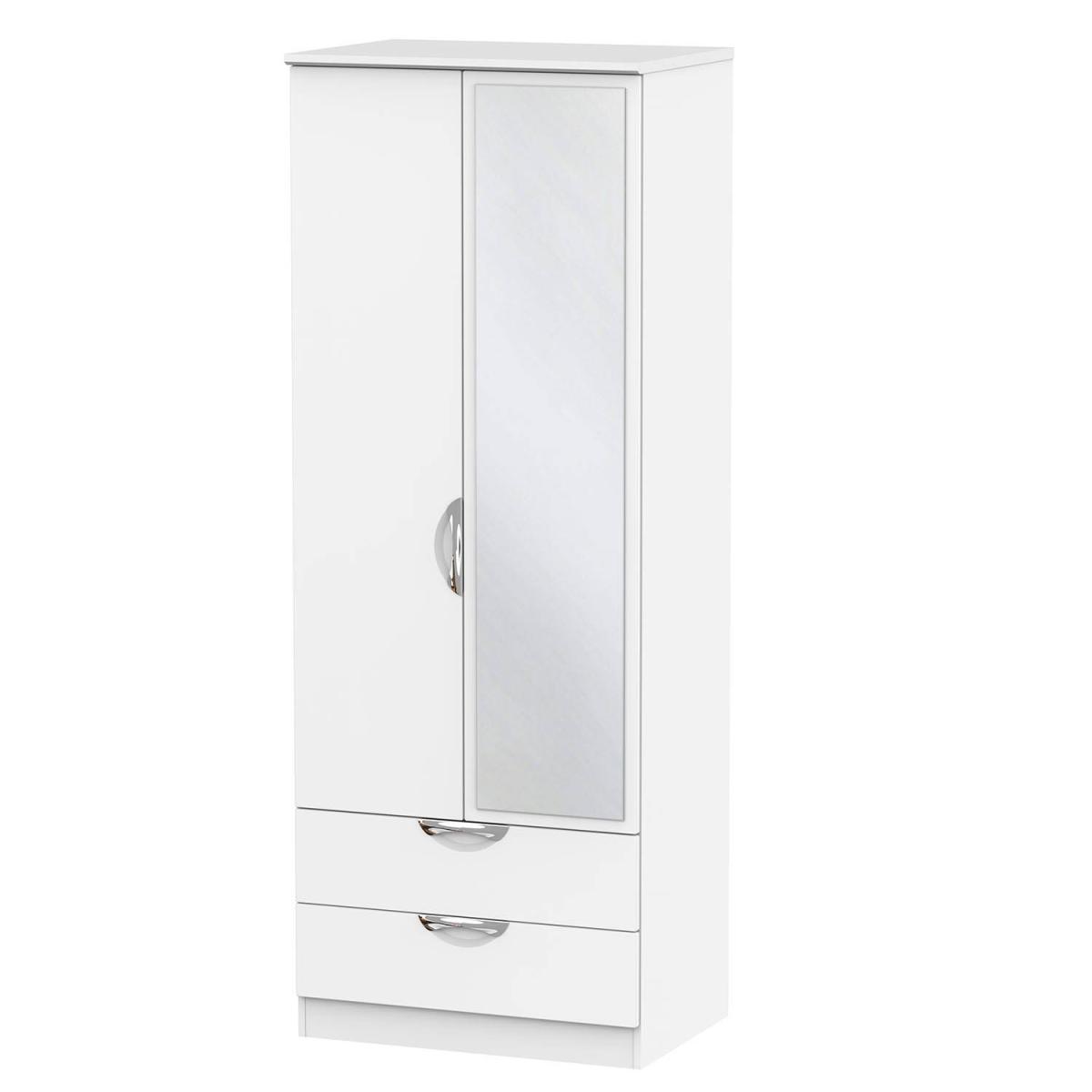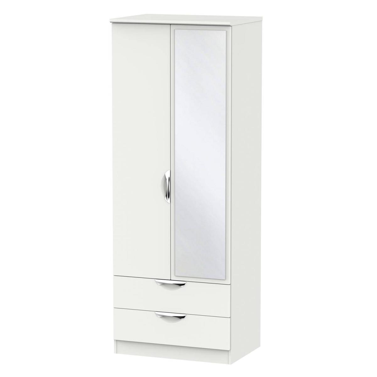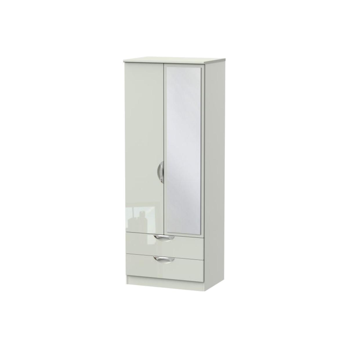 I’d call this the Cambourne tall wardrobe, and what I like most is its built-in mirror and slim depth - it’s ideal for narrower rooms or a minimalist scheme. The gloss finish works well in contemporary or Scandi-inspired interiors, bouncing light around smaller spaces. To style it, keep hangers colour-matched inside, use the drawer for accessories, and flank it with a potted plant or a slim wall sconce to soften its straight lines. A neutral rug underneath will anchor the look without cluttering.